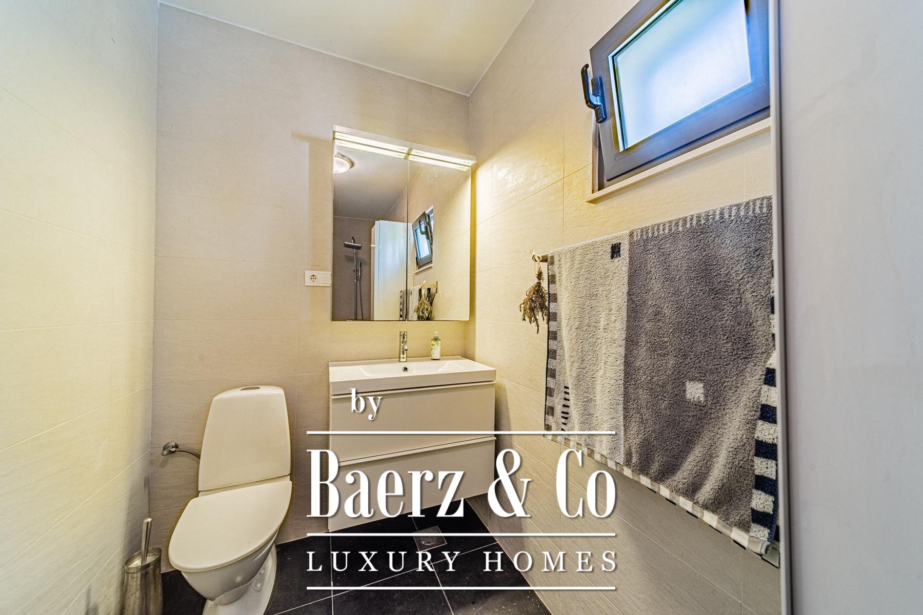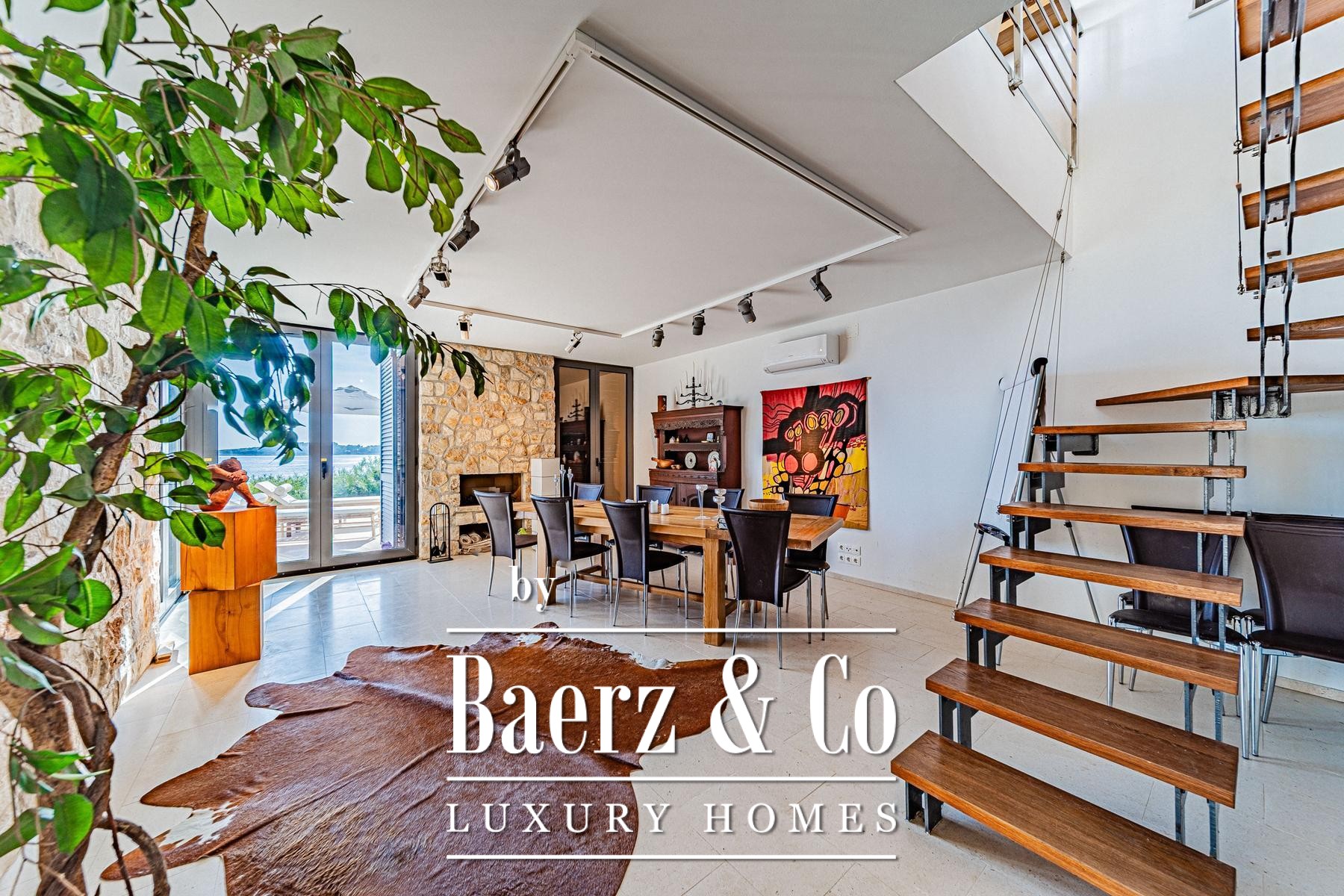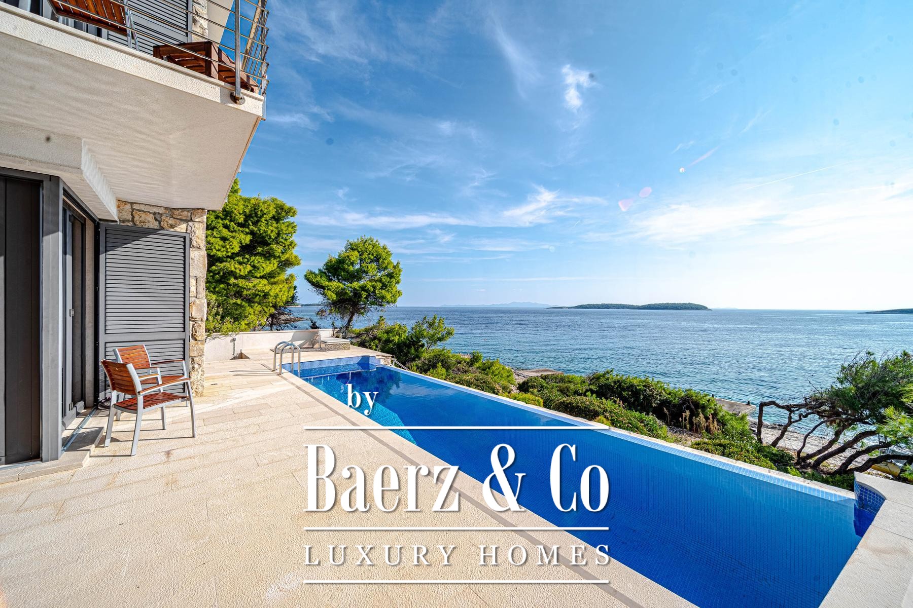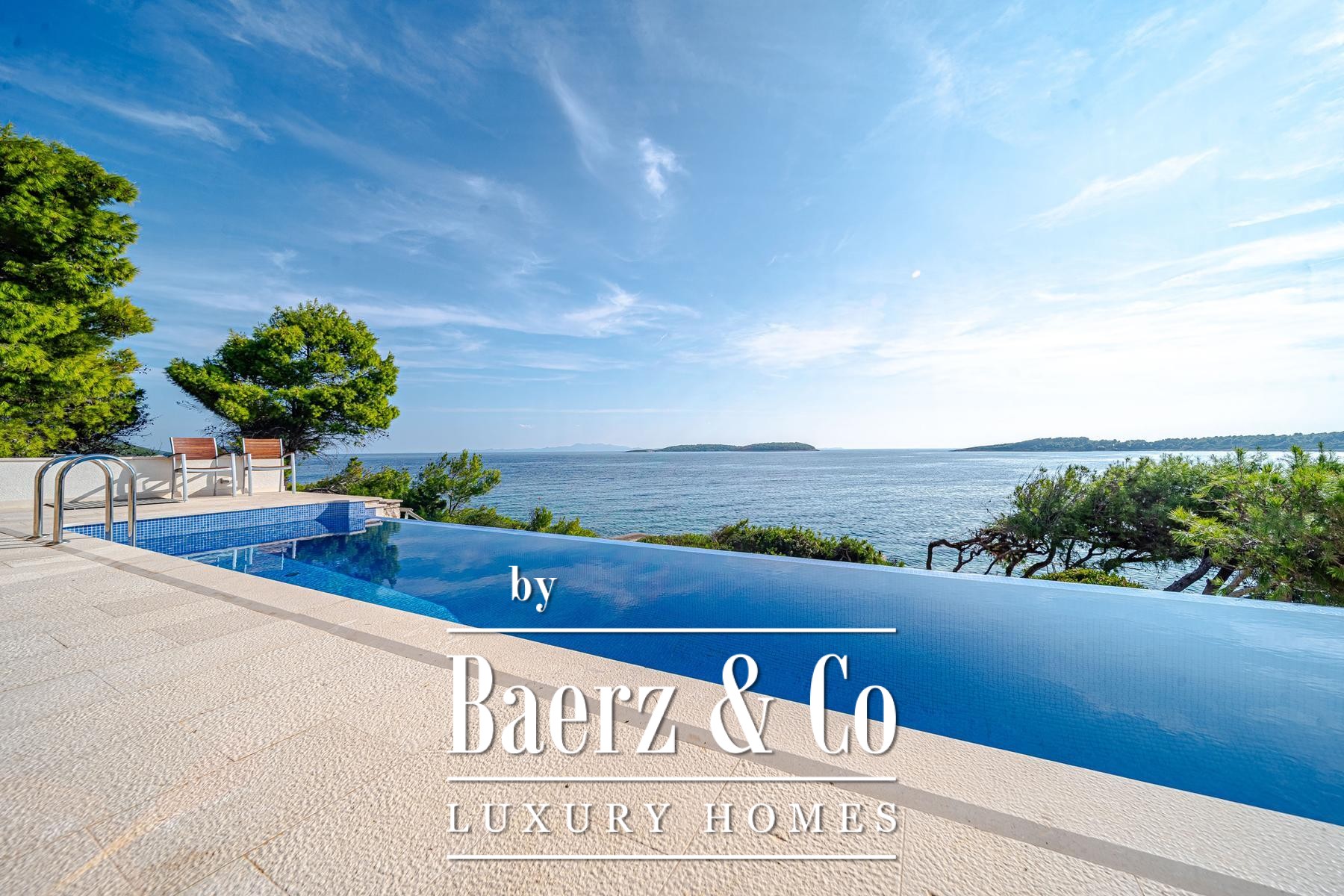 يتميز المشهد الطبيعي أمام الفيلا بأرضيات حجرية فاتحة اللون وحوض سباحة ومساحات مخصصة للاسترخاء تحت أشعة الشمس، وكلها مصممة لتعزيز الاستمتاع بالحياة على البحر. ممر للمشاة يقودك على بعد 15 متراً فقط إلى المياه، حيث يوجد رصيف صغير لرسو القوارب والاستمتاع بهدوء الخصوصية. في جميع أنحاء الفيلا، تظهر جودة المواد والتشطيبات الداخلية مدروسة بعناية، مما يمنح المكان إحساساً بالفخامة الهادئة.