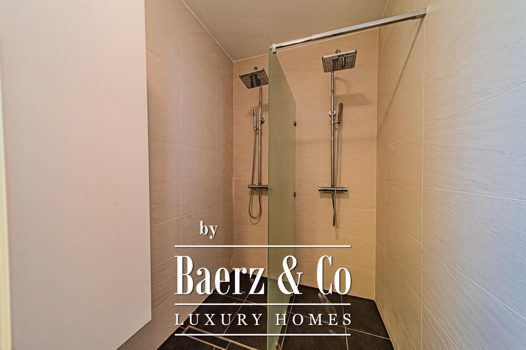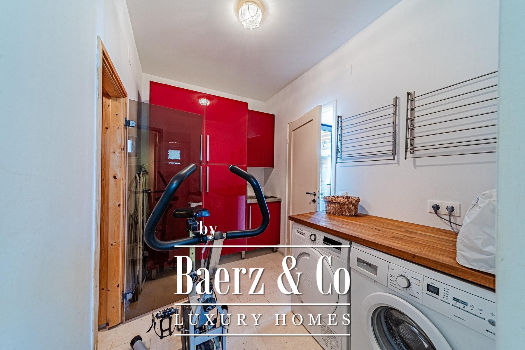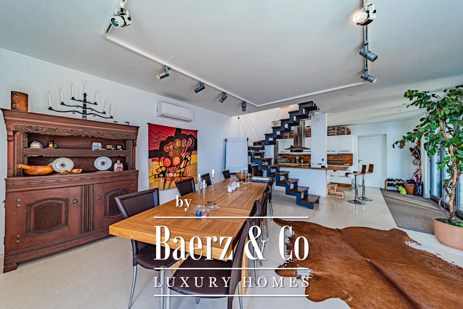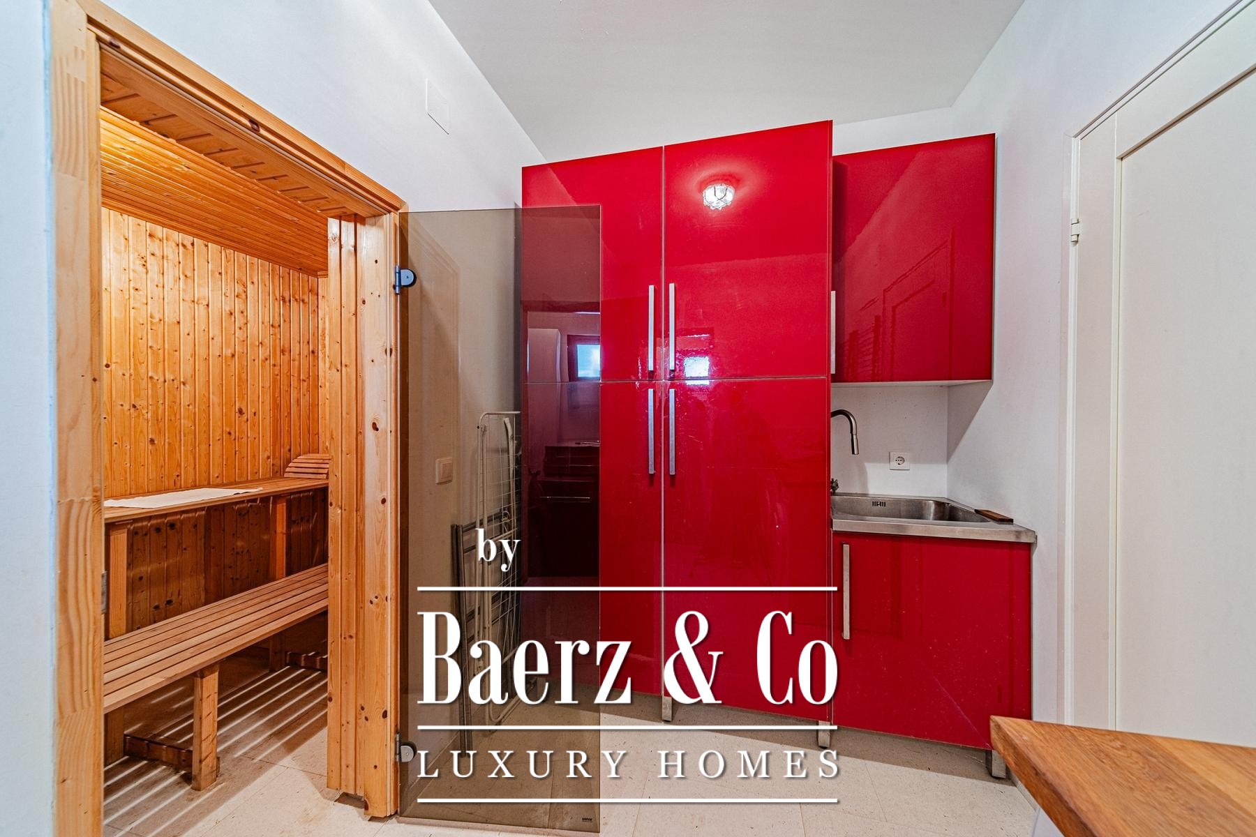 يتميز المشهد الطبيعي أمام الفيلا بأرضيات حجرية فاتحة اللون وحوض سباحة ومساحات مخصصة للاسترخاء تحت أشعة الشمس، وكلها مصممة لتعزيز الاستمتاع بالحياة على البحر. ممر للمشاة يقودك على بعد 15 متراً فقط إلى المياه، حيث يوجد رصيف صغير لرسو القوارب والاستمتاع بهدوء الخصوصية. في جميع أنحاء الفيلا، تظهر جودة المواد والتشطيبات الداخلية مدروسة بعناية، مما يمنح المكان إحساساً بالفخامة الهادئة.