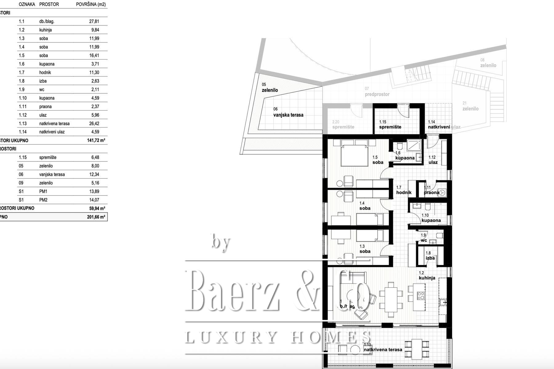 كل غرفة نوم تتميز بتناسبات دقيقة، حيث تتراوح المساحة من 9.17 متر مربع إلى 19.20 متر مربع، وتكتمل بمجموعة من المساحات الوظيفية، بما في ذلك غرفة ملابس، غرفة غسيل، مخزن، ومساحات تخزين مخصصة. ثلاث حمامات بالإضافة إلى مرحاض ضيوف توفر الراحة للعائلة والزوار على حد سواء. في الخارج، تمتد شرفة مغطاة بمساحة 25.74 متر مربع وشرفتان إضافيتان إلى حديقة منسقة مع مسبح خاص، تدعو إلى الاسترخاء وتمنح إطلالات هادئة على ساحل كفارنيير المتلألئ.