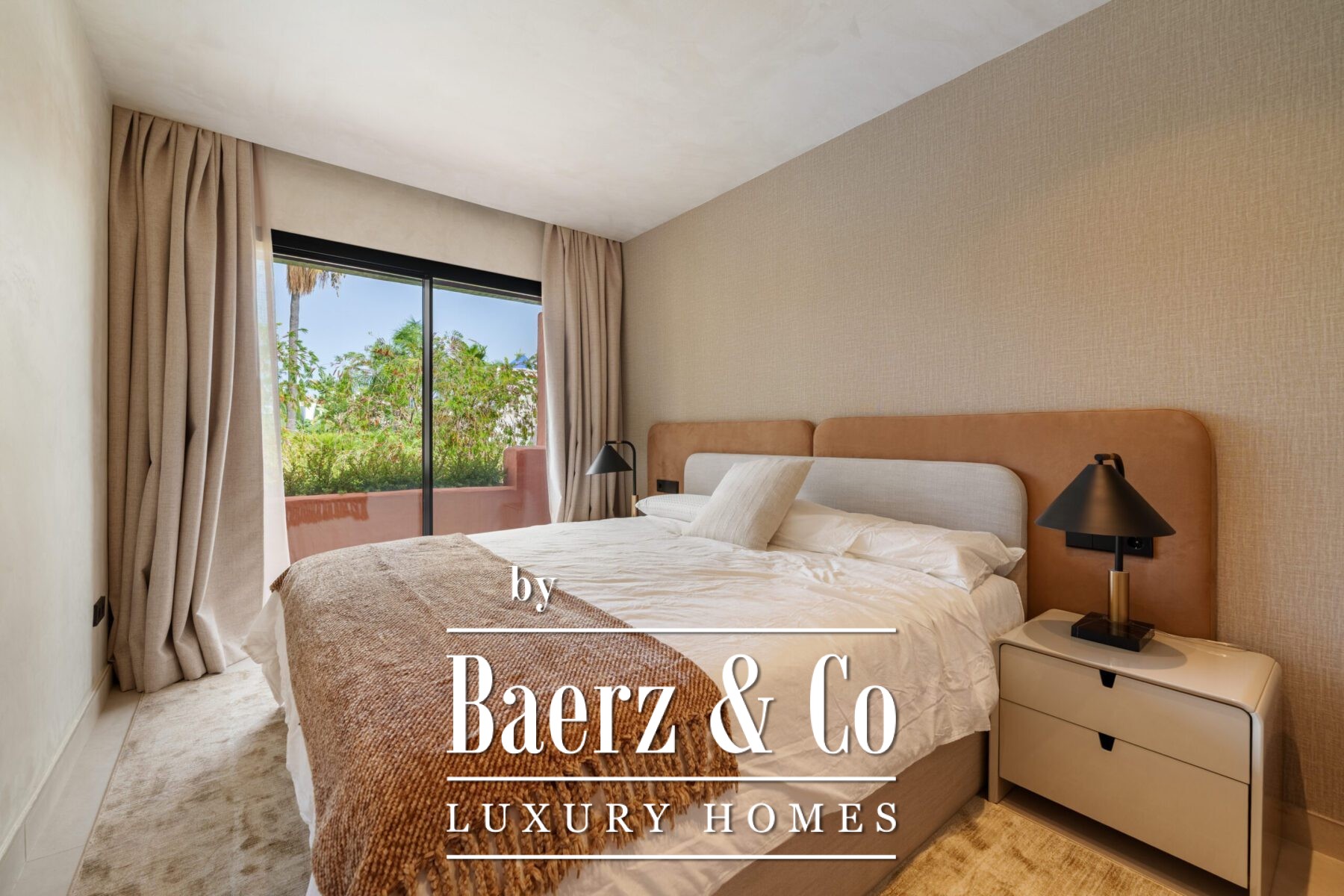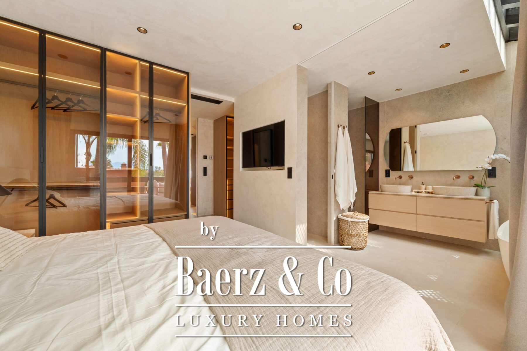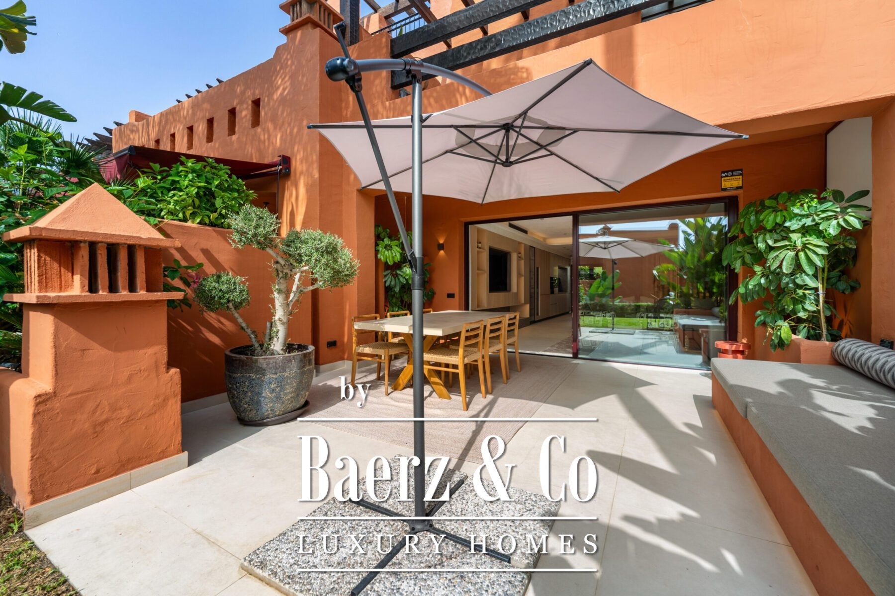 فيلا ماربيا غولدن مايل تُمثل فرصة راقية لامتلاك سكن مُجدَّد بالكامل يتألف من أربع غرف نوم في أحد أكثر العناوين المرغوبة بجنوب إسبانيا. تمتد المساحة الداخلية على 217 مترًا مربعًا، وتُكملها 134 مترًا مربعًا من الشرفات، حيث تعكس العقار رفاهية هادئة من خلال خطوط معمارية نقية، وإضاءة طبيعية، وتفاصيل عصرية راقية. تندمج المساحات الرئيسية المفتوحة بانسيابية بين مطبخ حديث مجهز بأجهزة عالية الجودة ومنطقة طعام وصالة رحبة تنفتح بسلاسة على شرفة مغطاة وحديقة خاصة. هذا الانسجام بين الراحة الداخلية والمساحة الخارجية يُحدد نمط الحياة اليومي هنا.