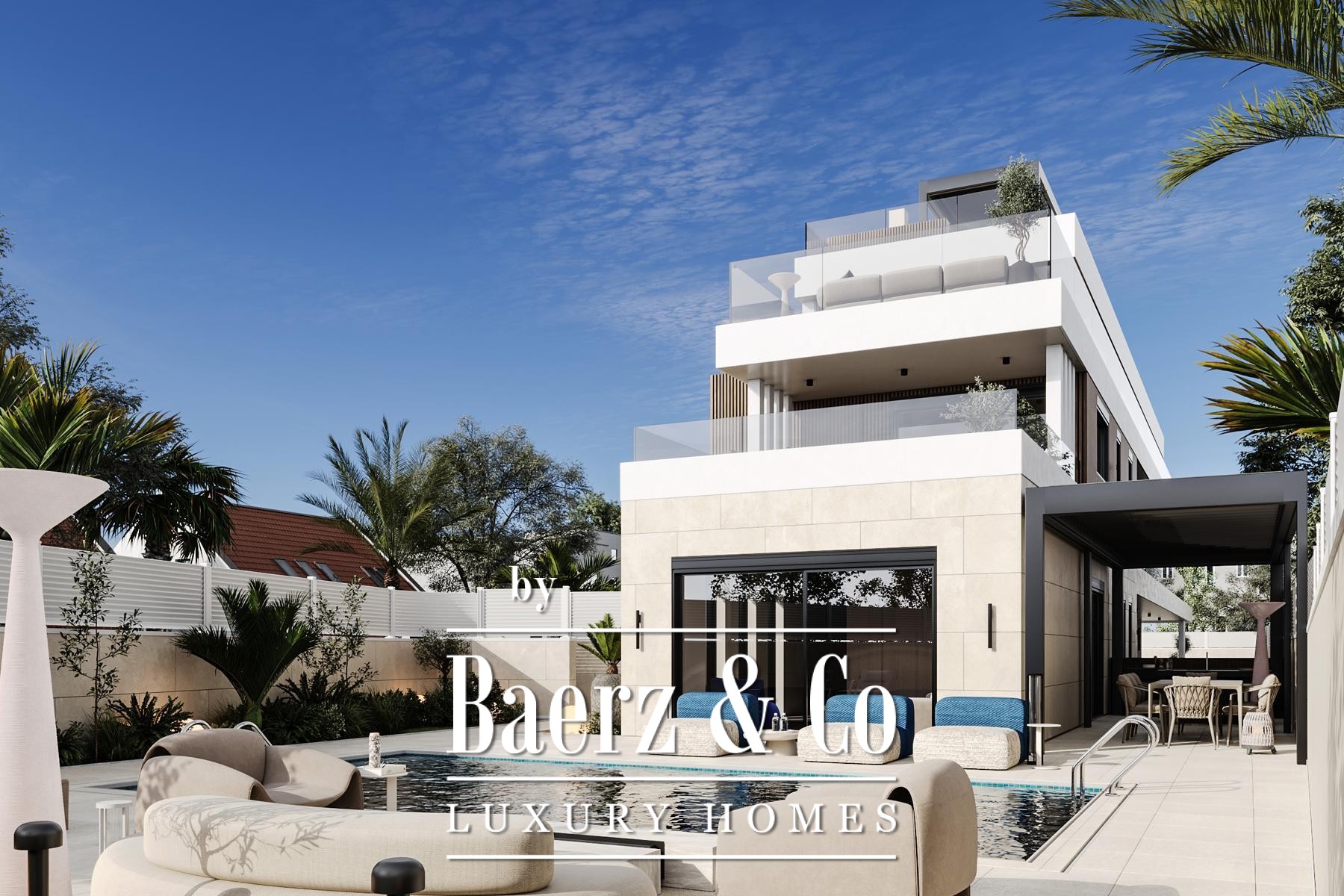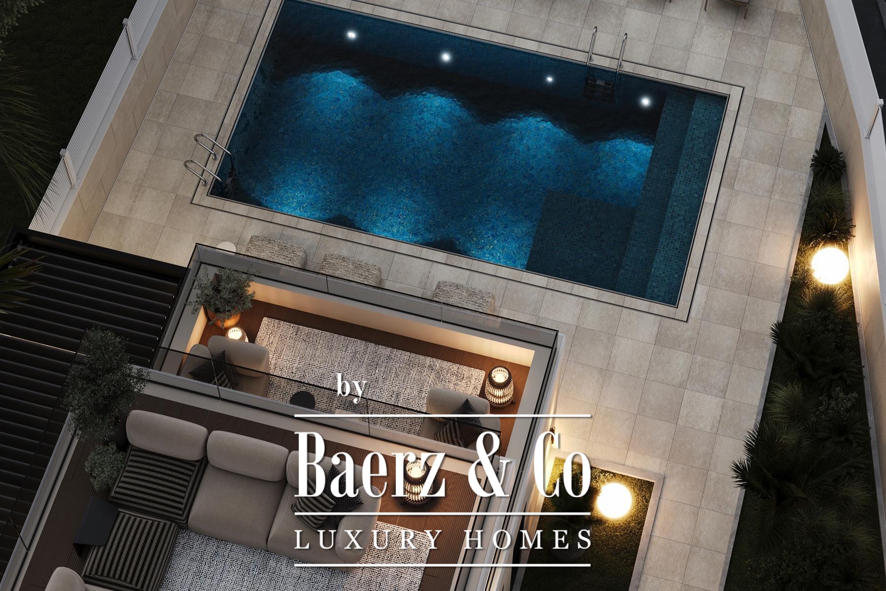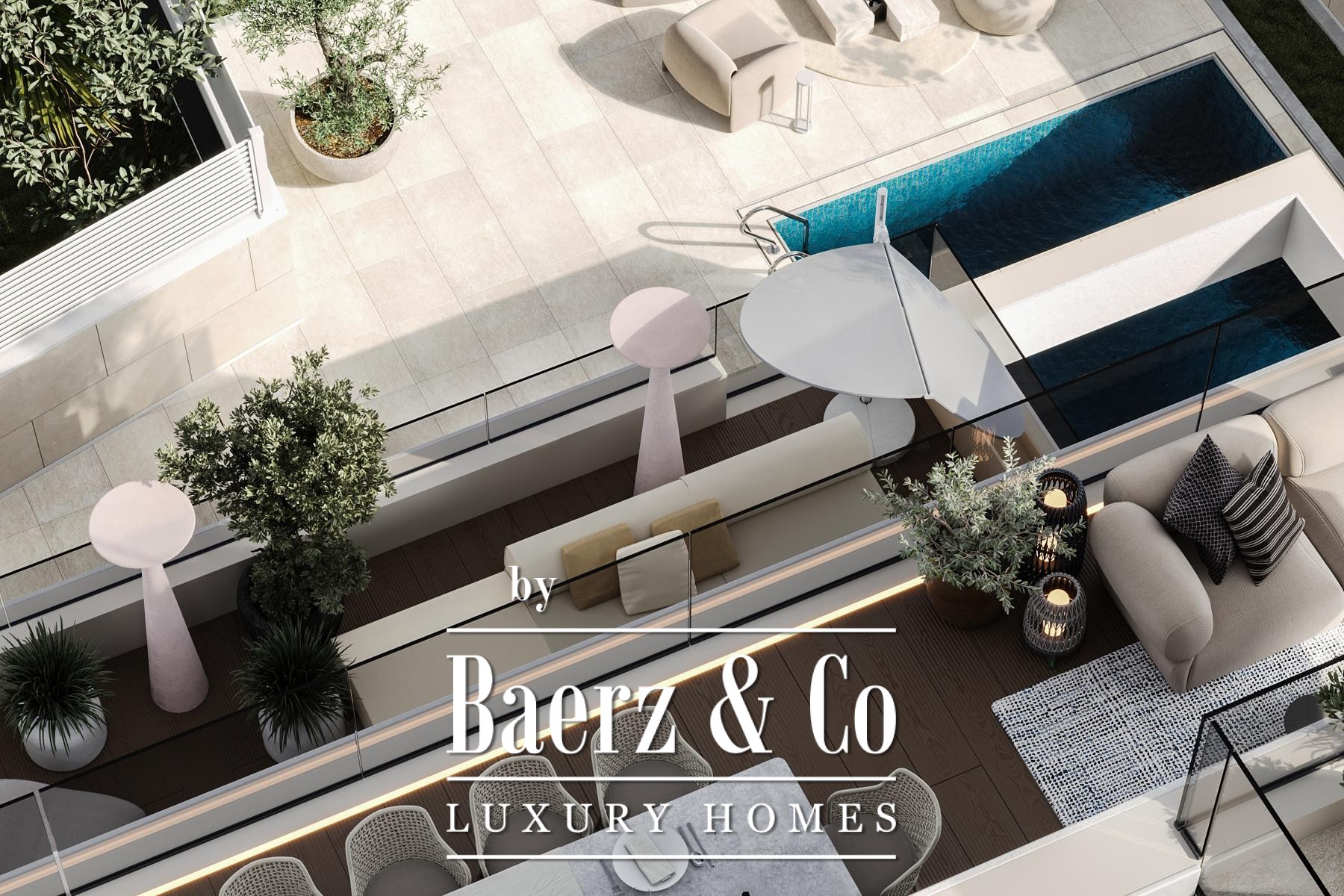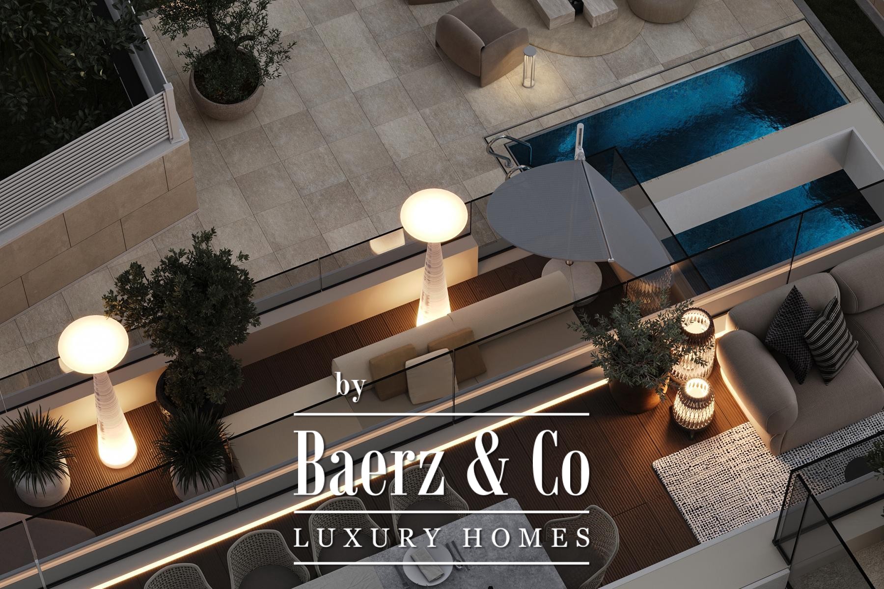 يمتد هذا الفضاء إلى شرفة بمساحة 46 م² تؤدي إلى ملاذ خارجي خاص يقارب 300 م²، يضم مسبحاً بمساحة 25 م²، سطح شمس، ومساحة طعام منعزلة، جميعها موجهة لتعزيز الاستمتاع بالشمس والخصوصية. يجمع التصميم الداخلي بين الفخامة الملموسة والتقنية الهادئة—أرضيات باركيه من خشب البلوط ثلاثي الطبقات، بلاط سيراميك XXL، ونظام صوت مدمج من Sonos. يزداد الراحة عبر تكييف هواء موزع على المناطق، أنظمة تحكم KNX الذكية، تلفزيونات سامسونج الذكية، واتصال قوي مع خيار التوصيل عبر Starlink.