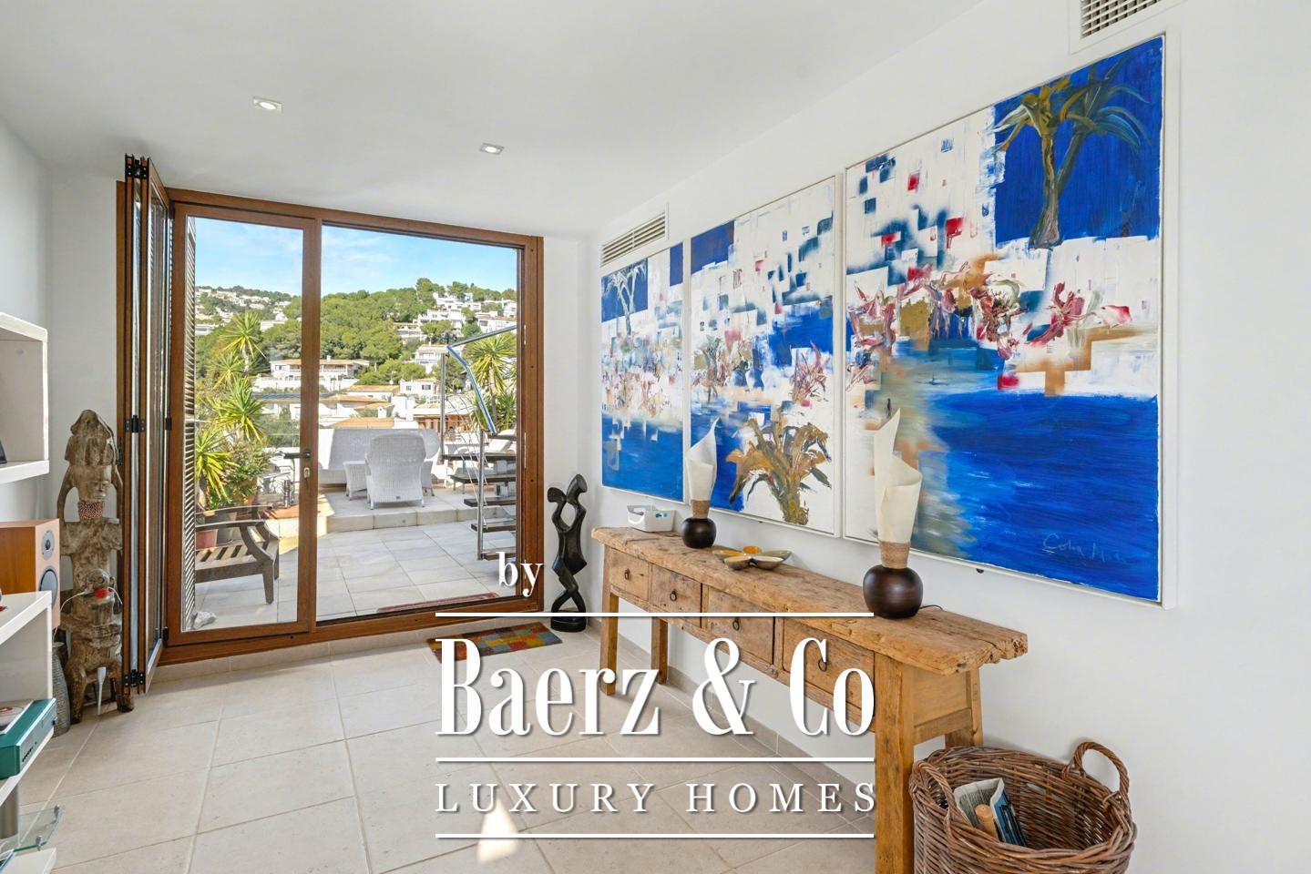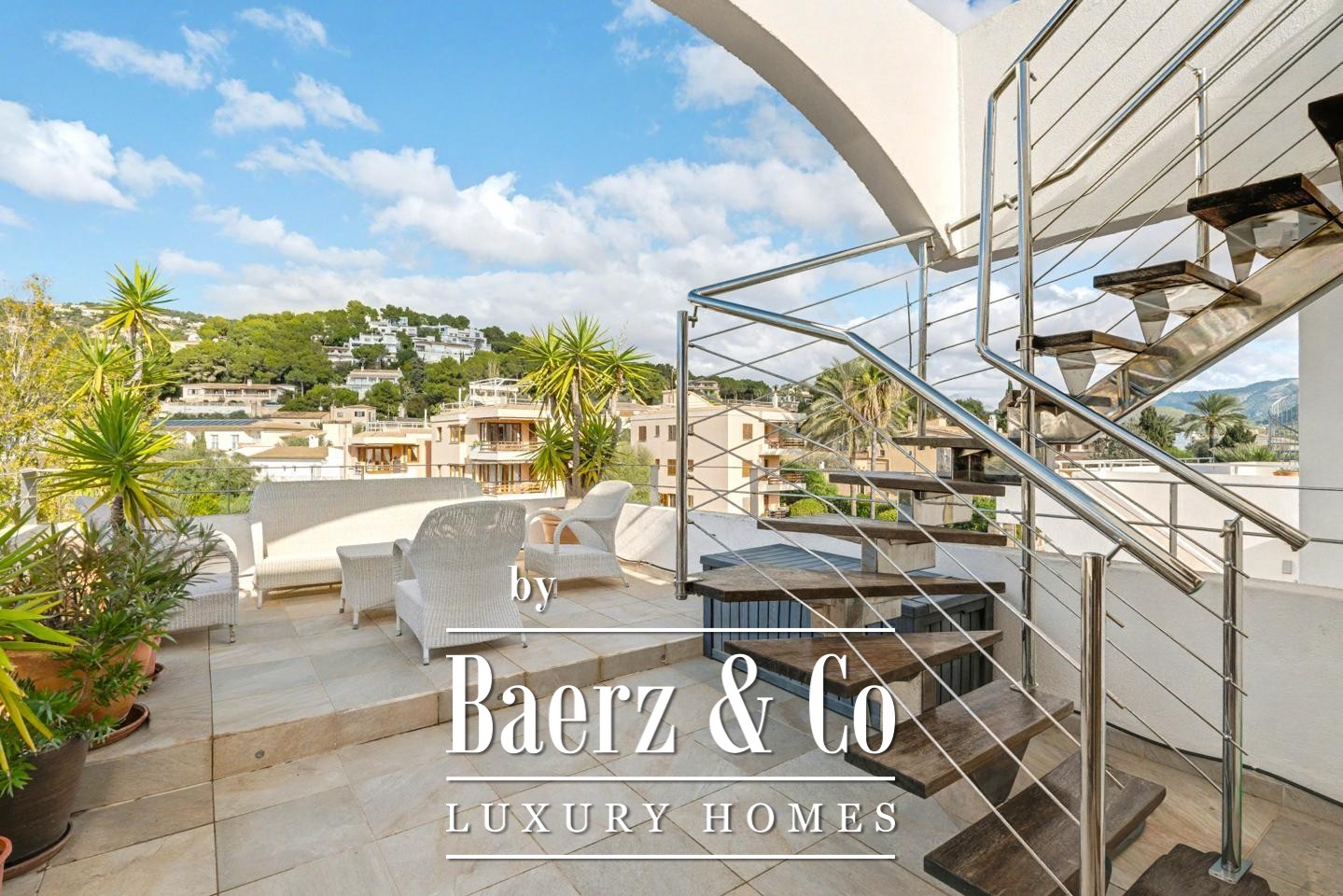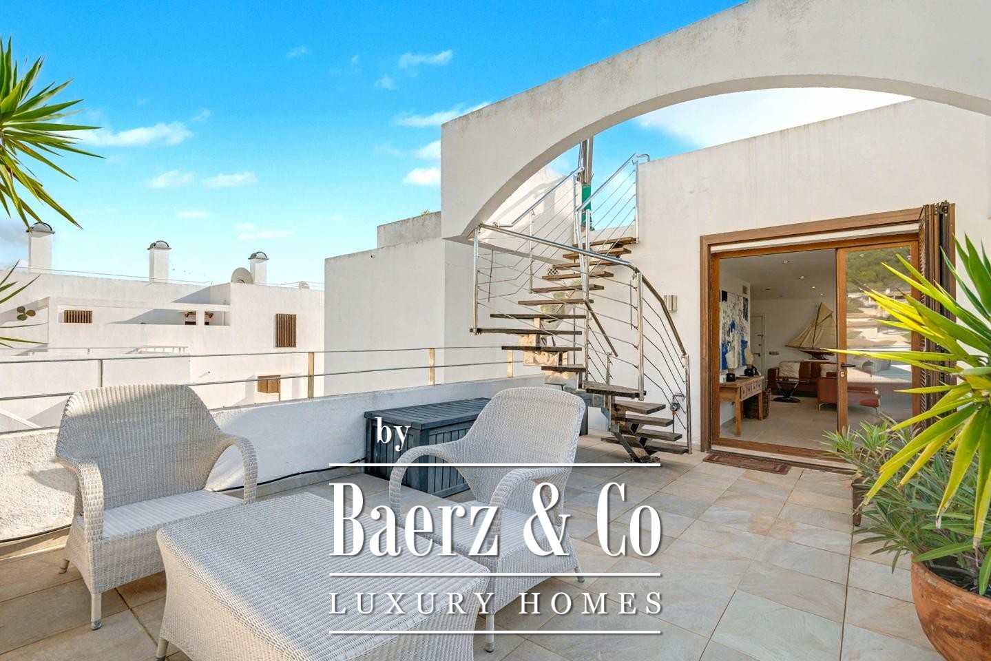 يصعد درج خاص إلى تراس السطح الخاص بالبنتهاوس، حيث تبرز مساحة مشمسة وفسيحة مصممة لعيش خارجي متعدد الاستخدامات، تجمع بين إطلالات ميناء بورت دي أندراتكس والخصوصية. هنا تتفتح الفرص للجلوس، أو لمطبخ خارجي، أو حتى جاكوزي، مع إطلالة تتيح الاستمتاع بمناخ الجزيرة على مدار العام.