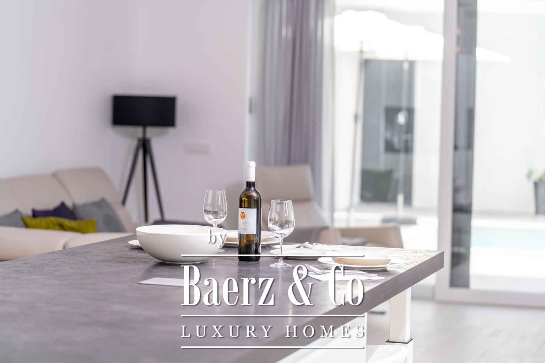 الفيلا عبارة عن سكن حديث في طابق واحد بسقف مسطح ومساحة داخلية تبلغ ٤٠٠ م²، صممت لتقليل تأثير الرياح والأمطار. تتكون الجدران الخارجية من طوب طيني بسماكة ٣٨ سم، مع عزل حراري بسماكة ١٢ سم، وتغطية بتشطيب باومت، ما يحقق أداءً طاقويًا مثاليًا. تحتوي الفيلا على غرفتي نوم وحمامين وارتفاع سقف ٣٠٣ سم، ما يمنح المساحات الداخلية إحساسًا بالاتساع والضوء الطبيعي الهادئ. توفر الجدران الزجاجية الكبيرة إطلالات رائعة، وتحميها مظلات سقفية واسعة في الصيف، بينما يسمح انخفاض الشمس شتاءً بتدفئة المساحات المركزية بلطف.
