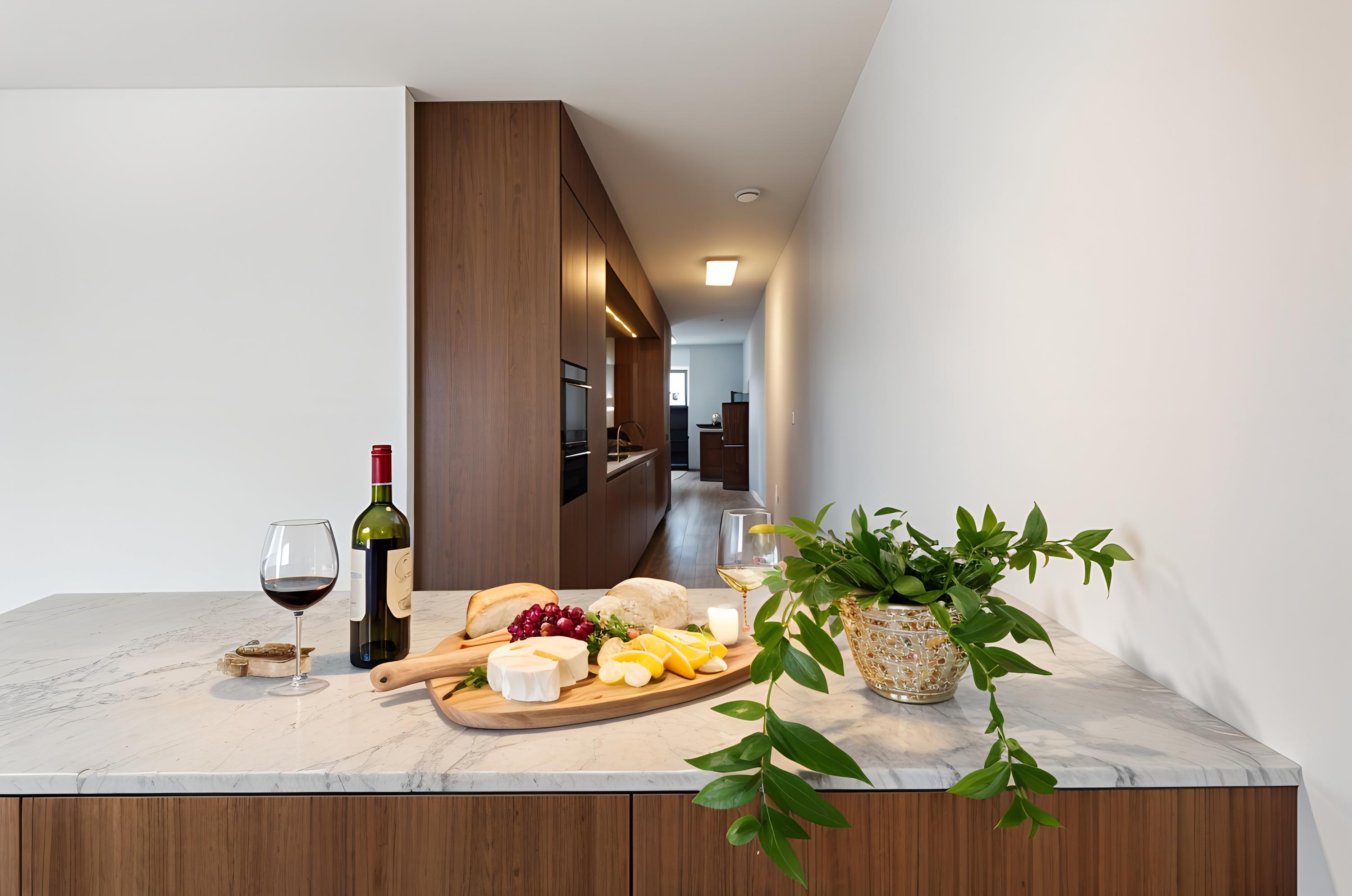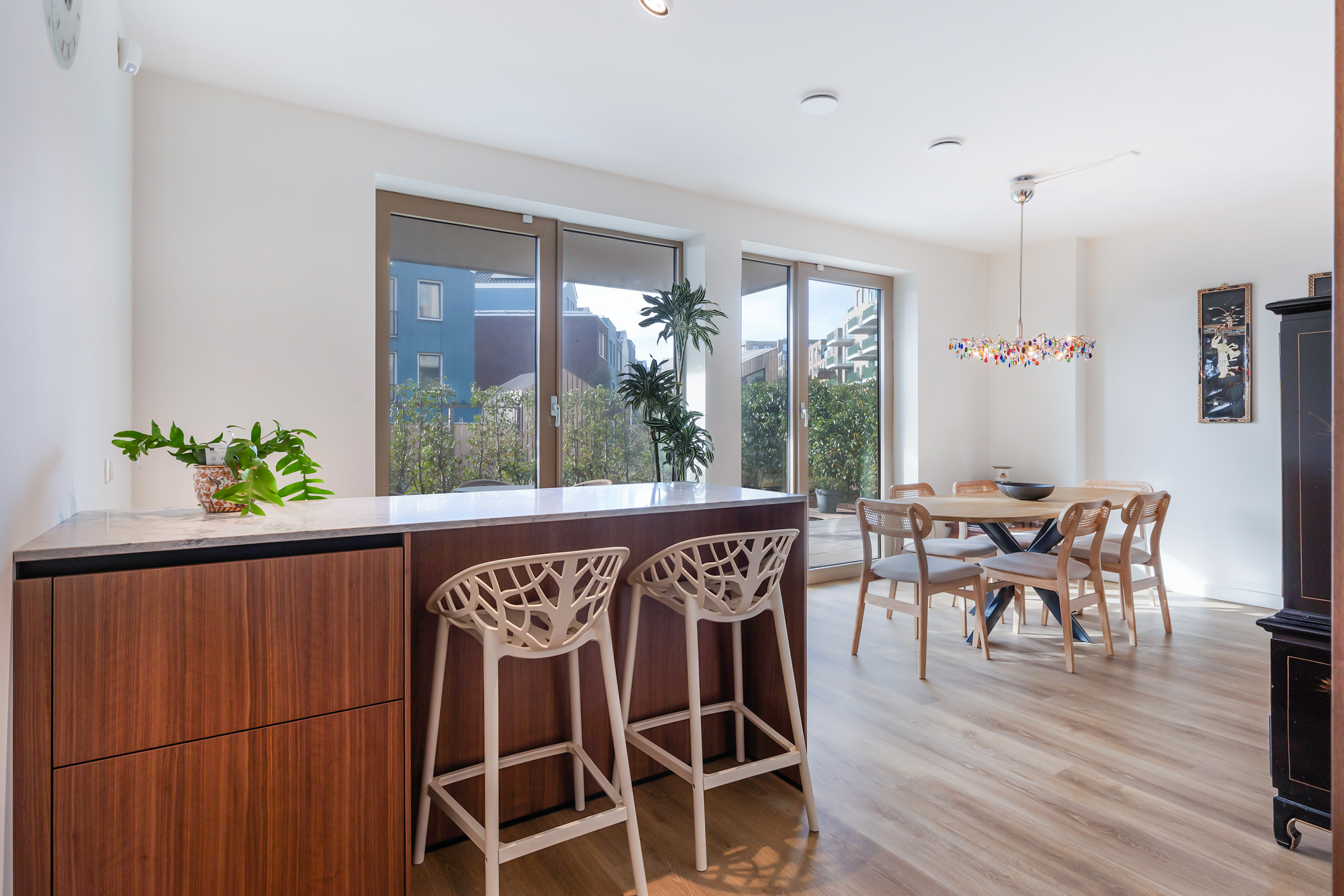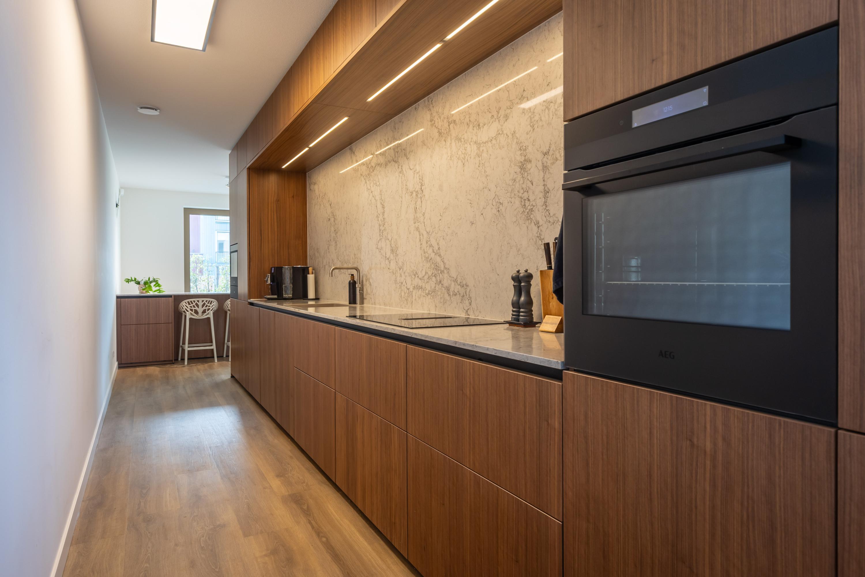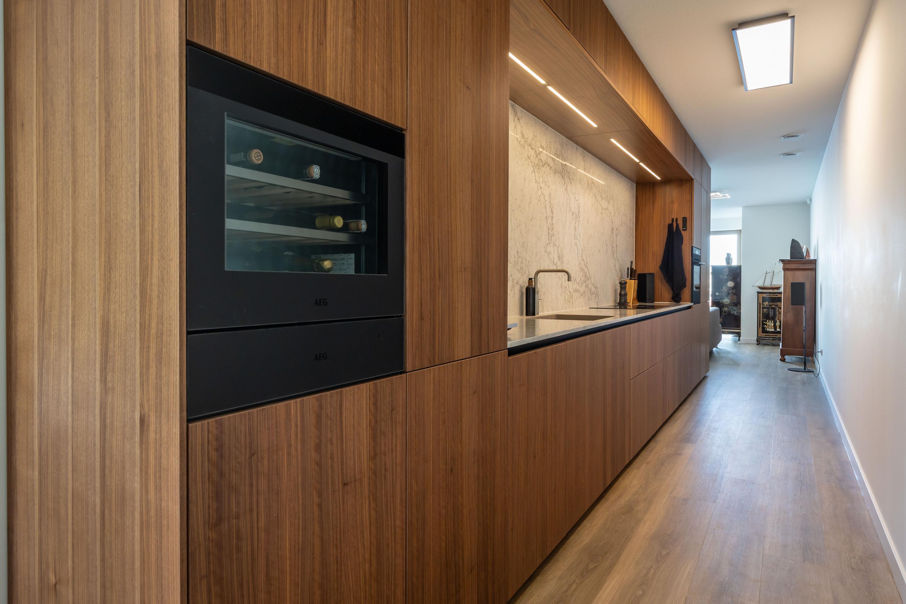 Das Erkerfenster und die französischen Balkone des Wohnzimmers rahmen stets wechselnde Ausblicke auf Hafen und Meer ein. Stahlgerahmte Glastüren lassen Lounge, Essbereich und Diele nahtlos ineinander übergehen. Die 7,20 Meter lange NEXT-125-Küche mit maßgefertigten Walnussfronten, klimatisiertem Weinschrank und Arbeitsplatte in Marmoroptik bildet das Herzstück des Zuhauses. Der angrenzende Essbereich und die Kochinsel erleichtern das Bewirten und bieten Blick auf den Privatgarten und die Sonnenterrasse.