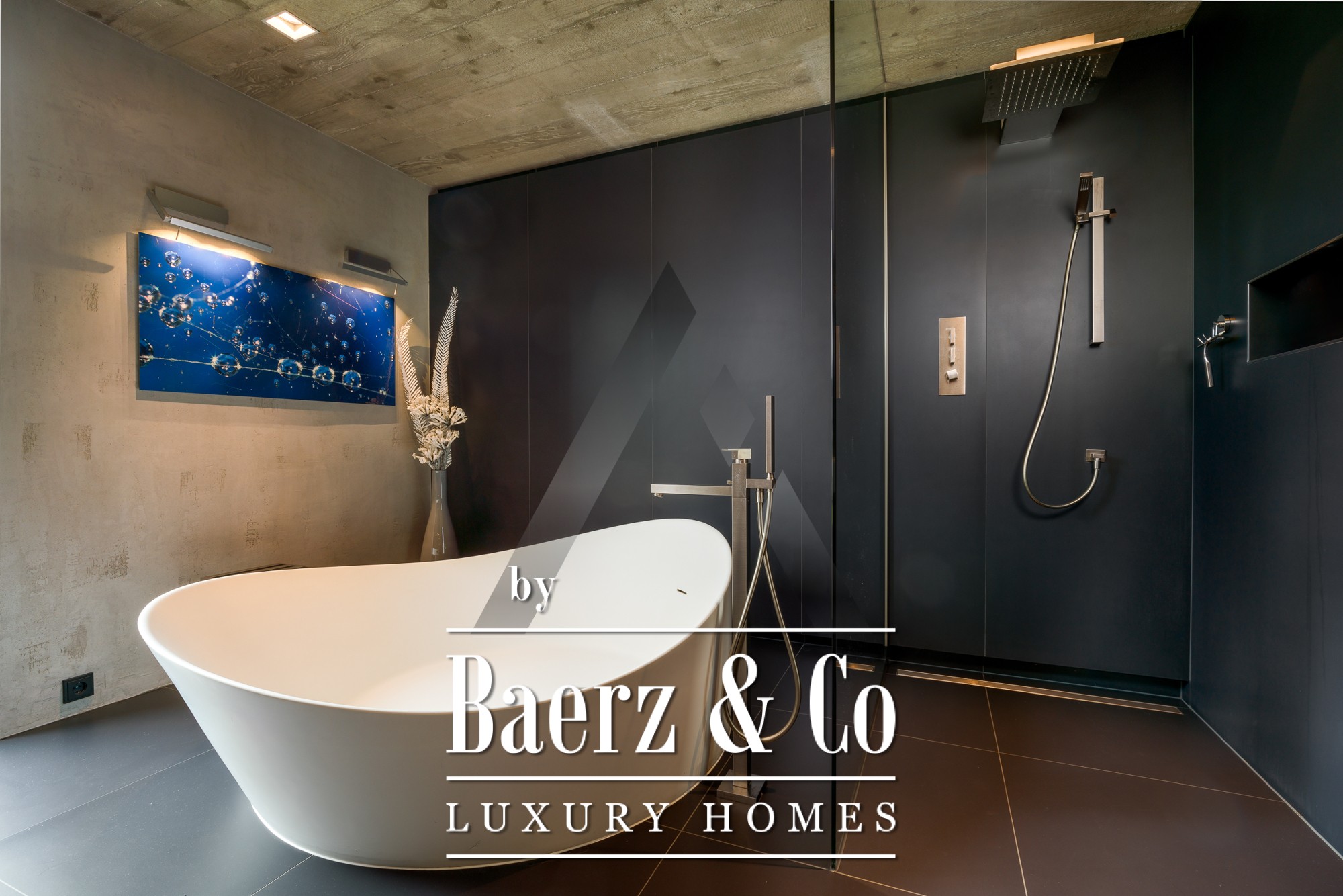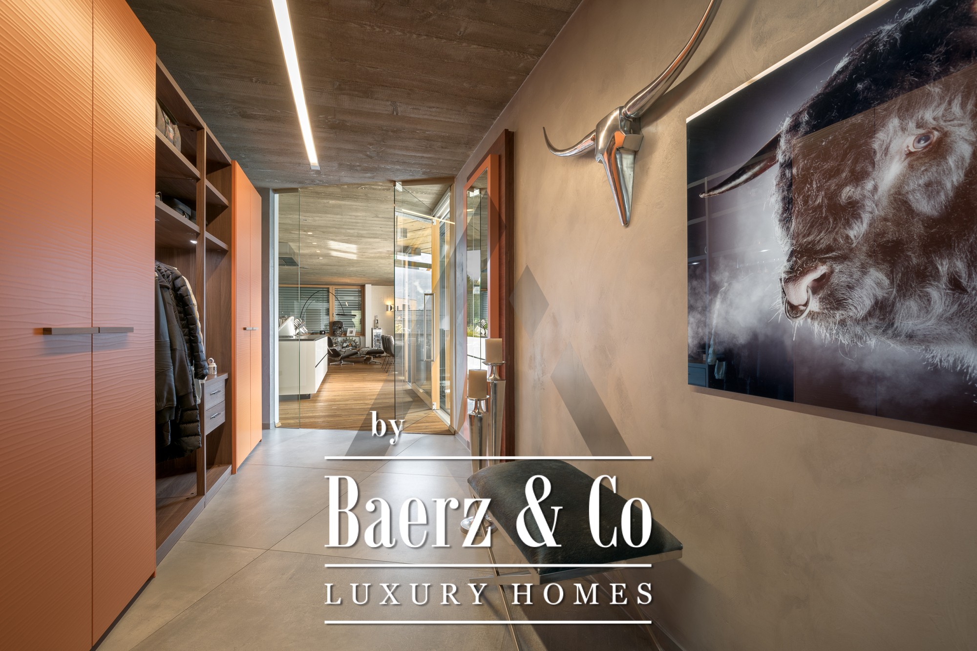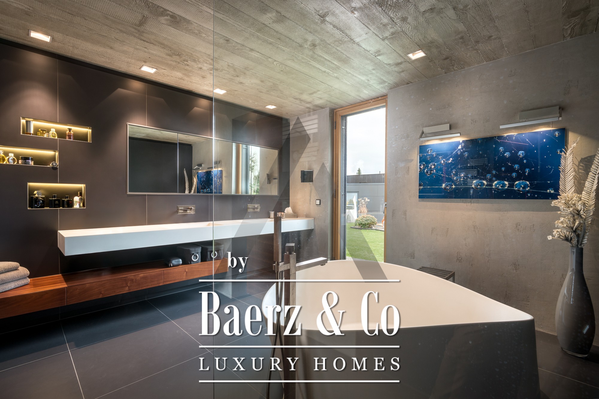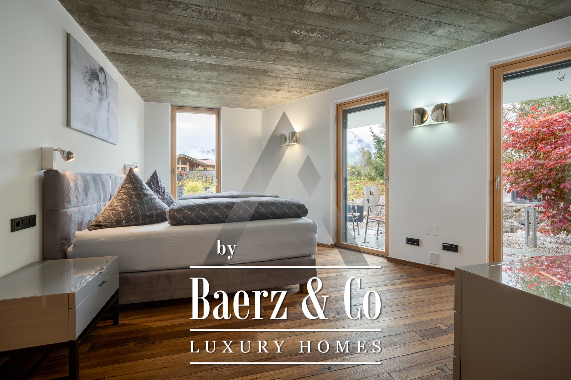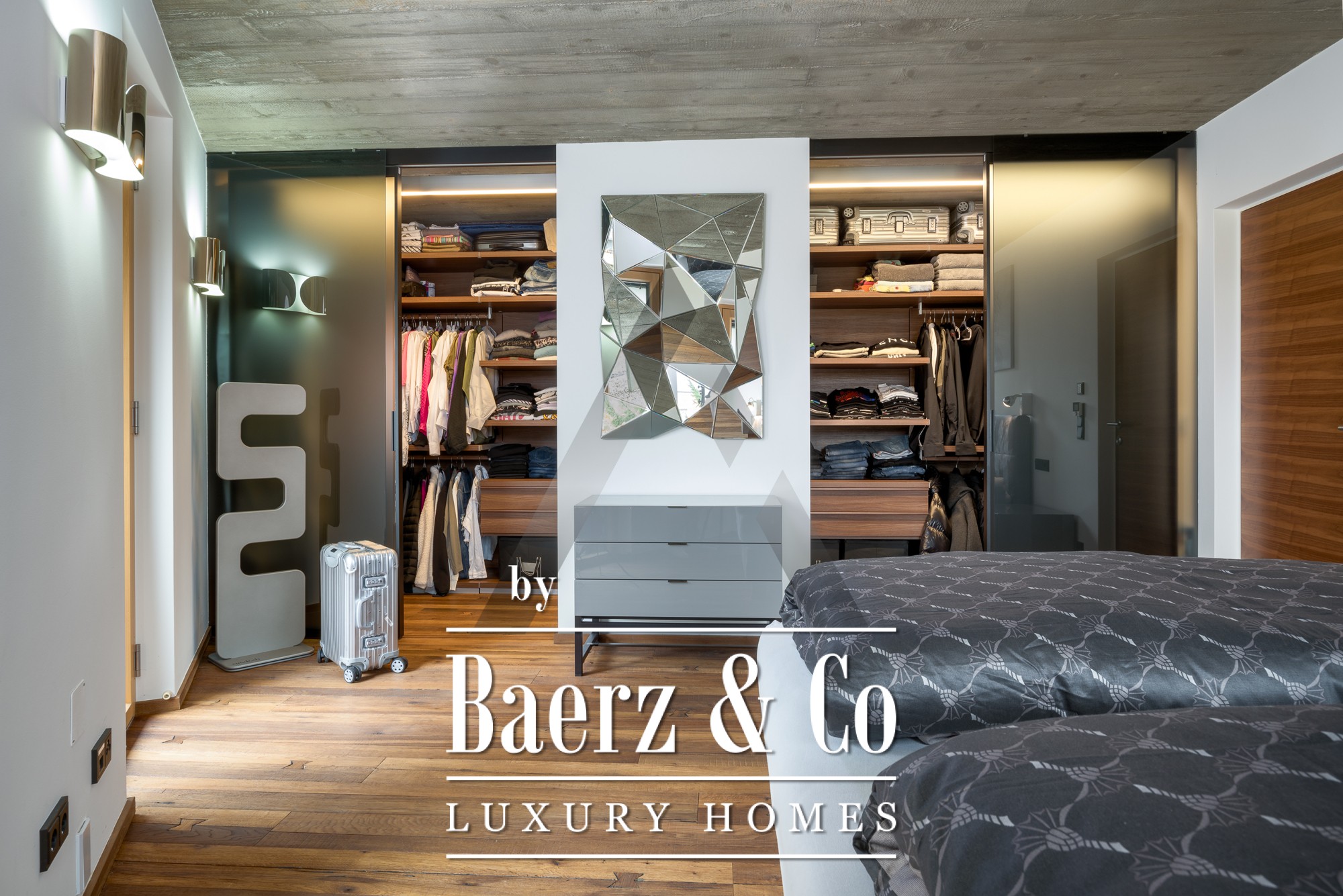 Im Inneren sorgen Sichtbetondecken und aufgearbeitete Eichenböden für eine dezente Eleganz. Das offen gestaltete Erdgeschoss bildet das Herzstück des Hauses, wo große Panoramafenster die Wohn- und Essbereiche sowie die exklusive Miele-Designerküche mit natürlichem Licht durchfluten. Auf dieser Ebene befinden sich ein Master-Suite mit Ankleidezimmer, ein Kinderzimmer, großzügige Bäder und äußerst praktische Staumöglichkeiten. Im Obergeschoss erwartet Sie eine separate Wohnung mit zwei Schlafzimmern, einem Wohnbereich mit Kamin und einer Dachterrasse mit herrlichem Bergblick. Abgerundet wird das Obergeschoss durch eine voll klimatisierte Fitness-Suite (18 m²) mit Zugang zu einer eigenen Terrasse.
