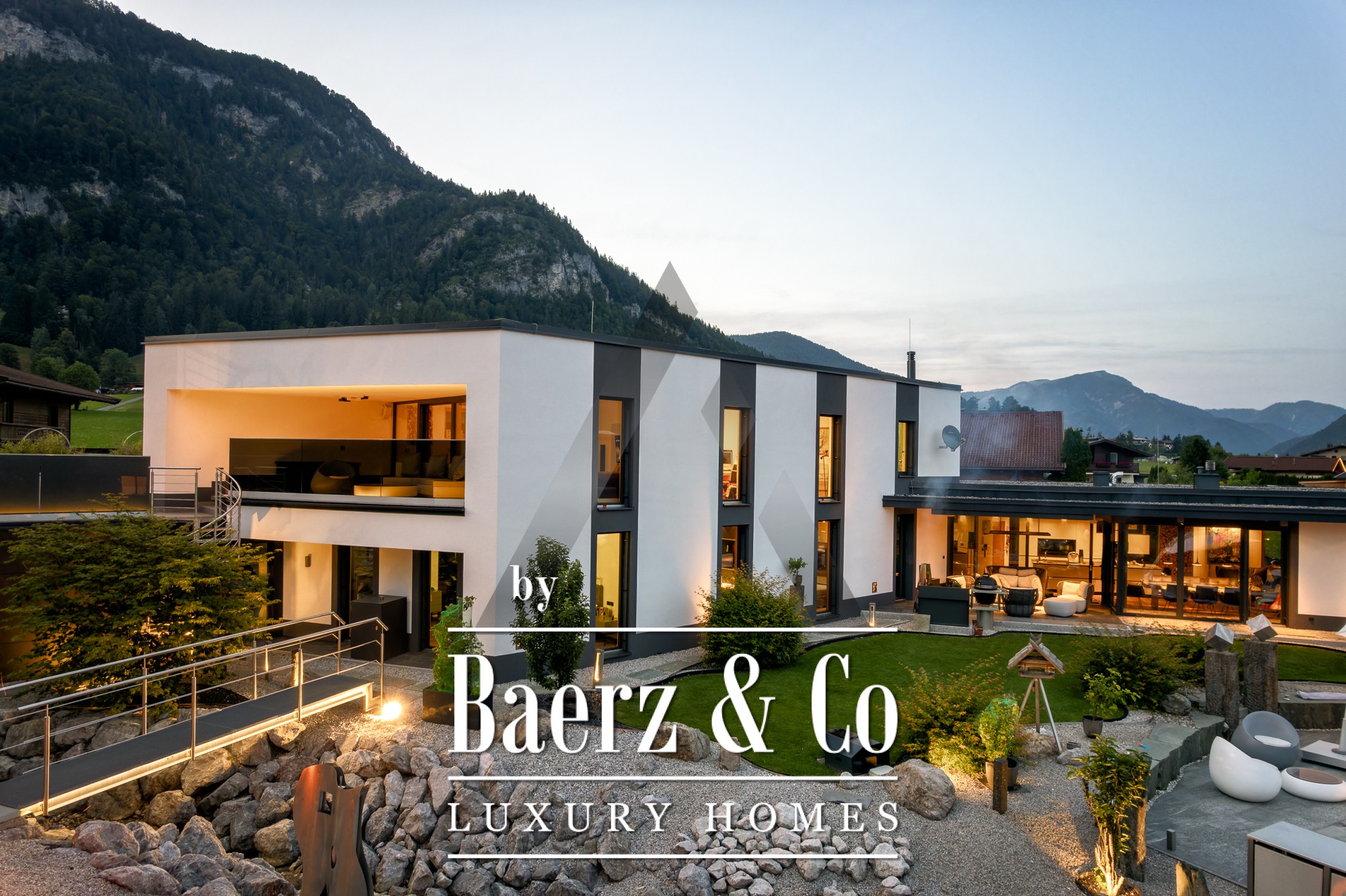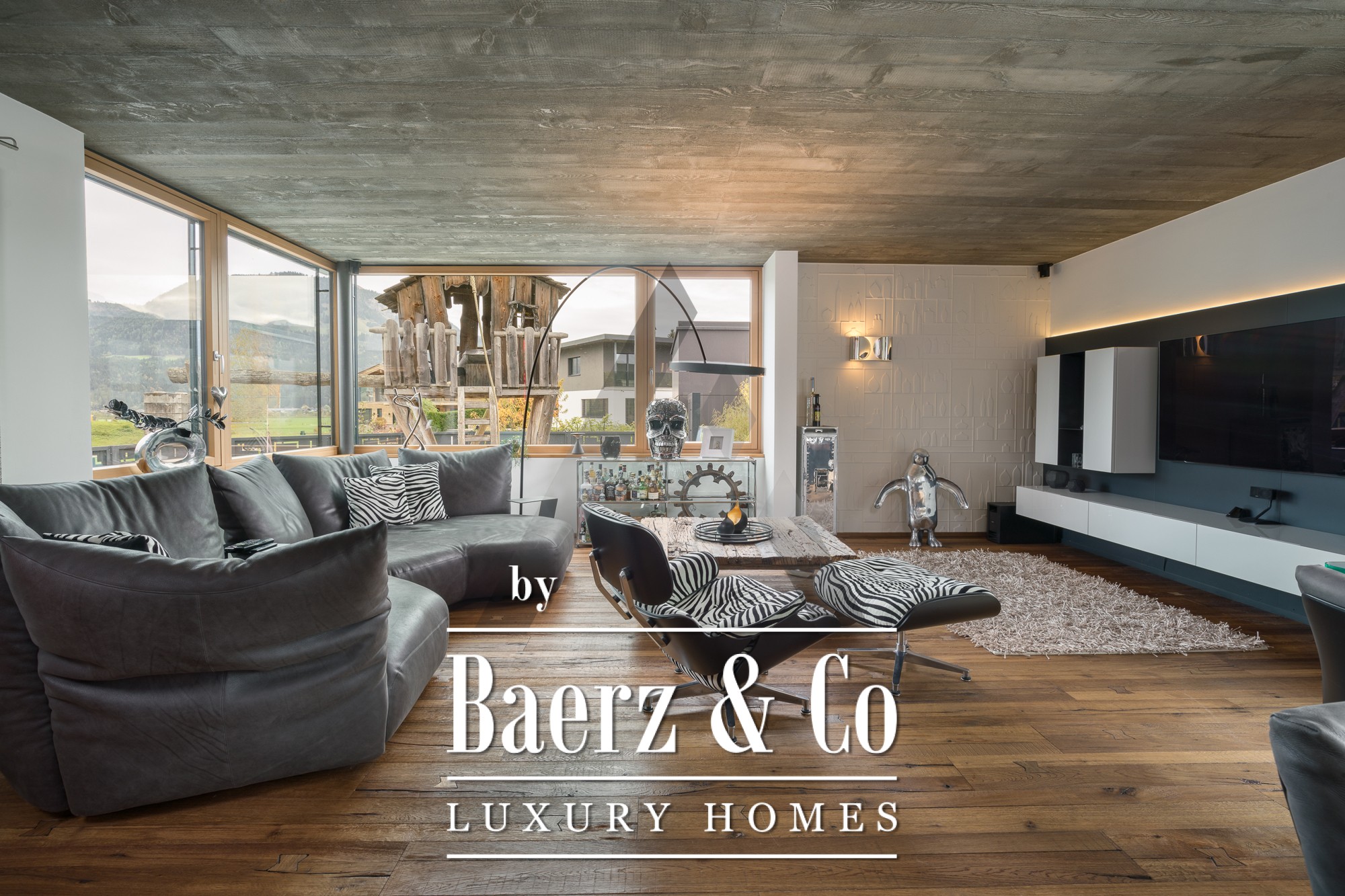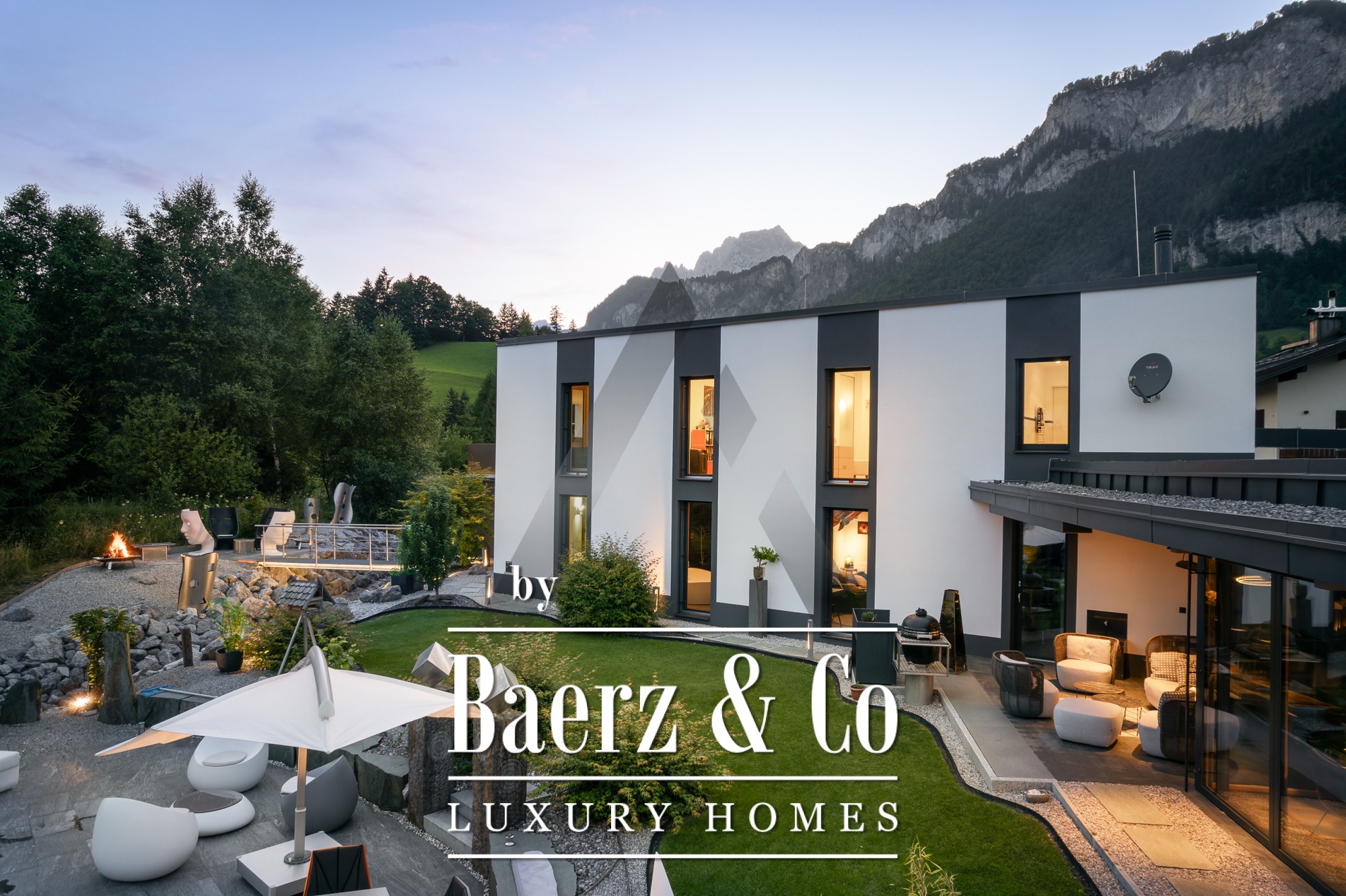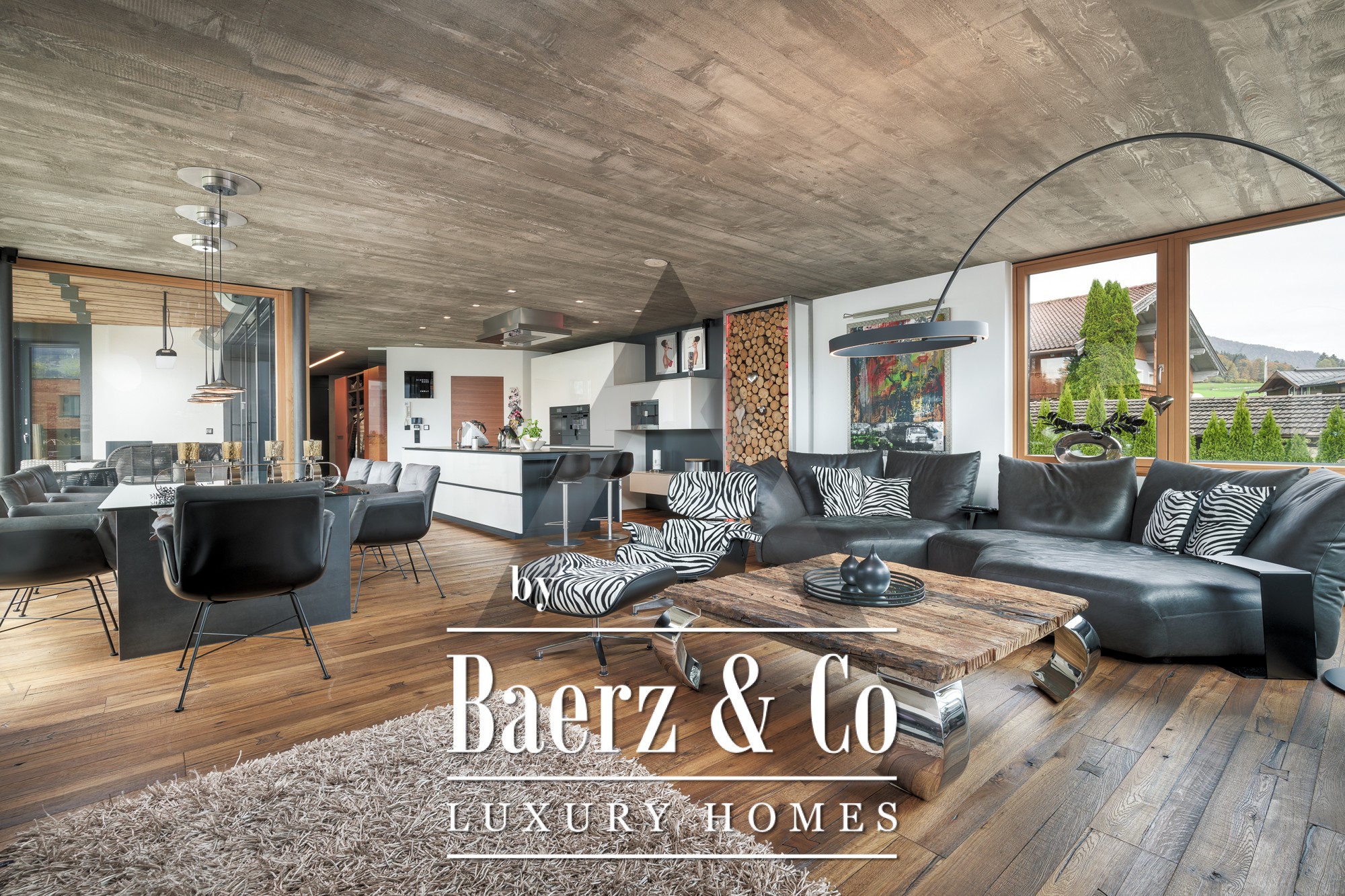 Im Inneren sorgen Sichtbetondecken und aufgearbeitete Eichenböden für eine dezente Eleganz. Das offen gestaltete Erdgeschoss bildet das Herzstück des Hauses, wo große Panoramafenster die Wohn- und Essbereiche sowie die exklusive Miele-Designerküche mit natürlichem Licht durchfluten. Auf dieser Ebene befinden sich ein Master-Suite mit Ankleidezimmer, ein Kinderzimmer, großzügige Bäder und äußerst praktische Staumöglichkeiten. Im Obergeschoss erwartet Sie eine separate Wohnung mit zwei Schlafzimmern, einem Wohnbereich mit Kamin und einer Dachterrasse mit herrlichem Bergblick. Abgerundet wird das Obergeschoss durch eine voll klimatisierte Fitness-Suite (18 m²) mit Zugang zu einer eigenen Terrasse.