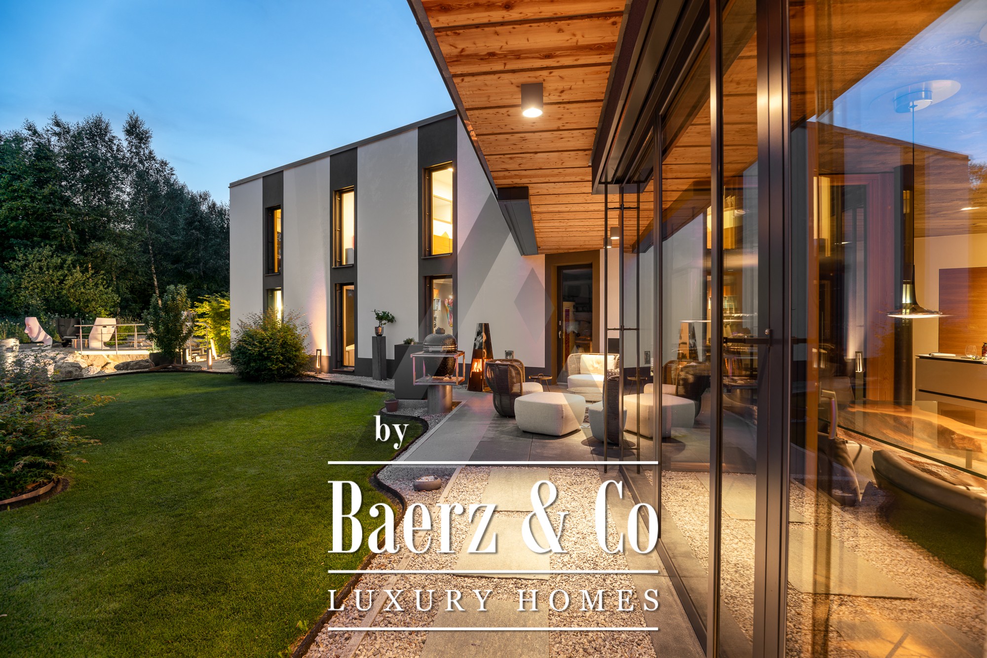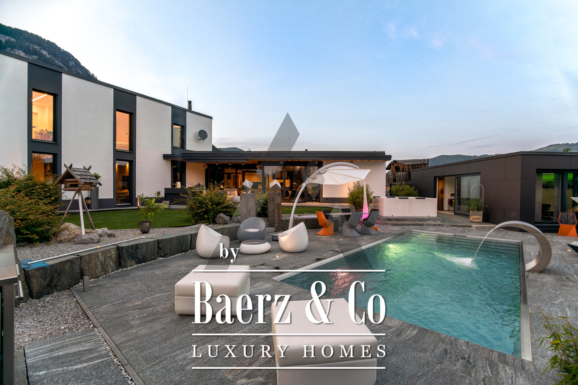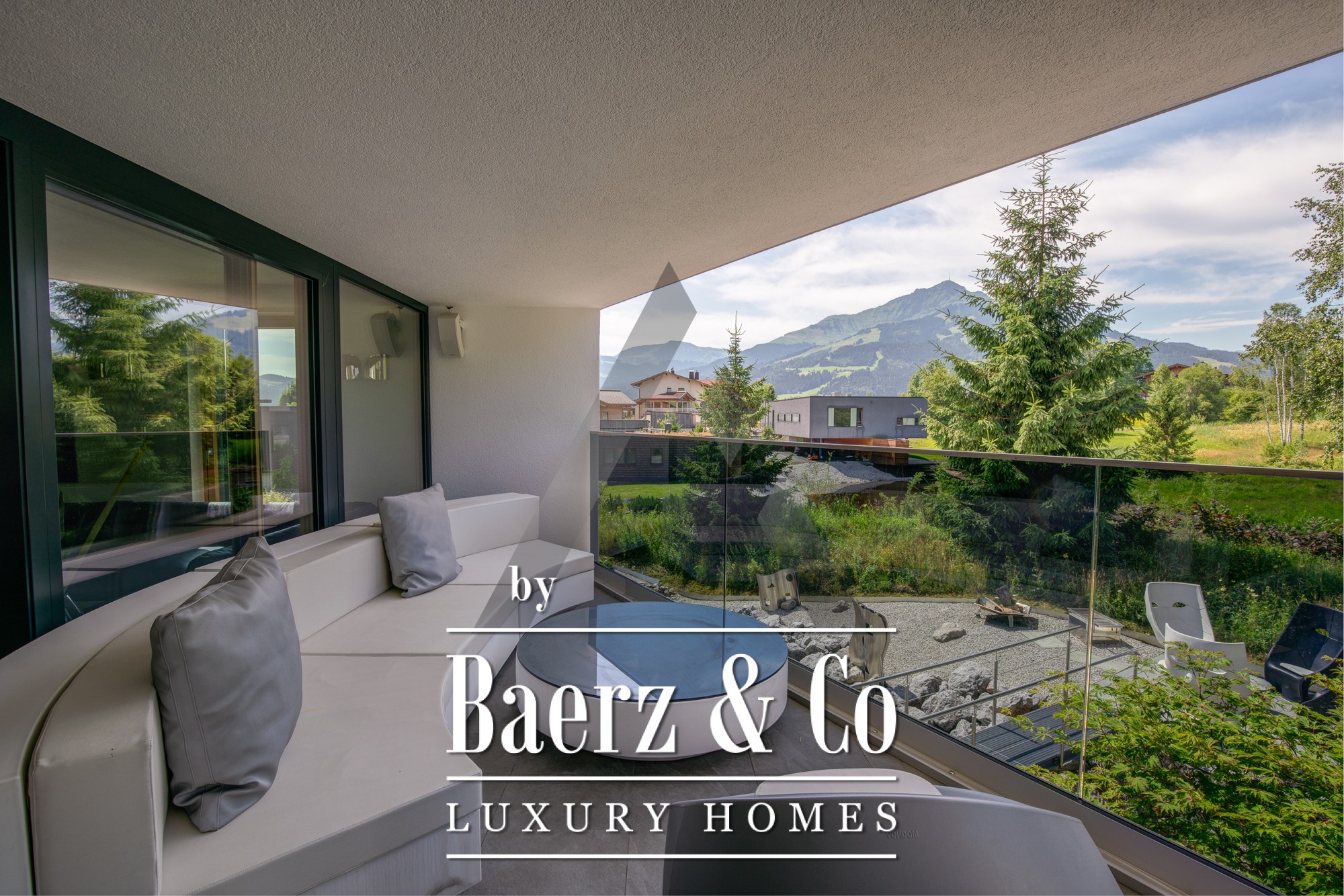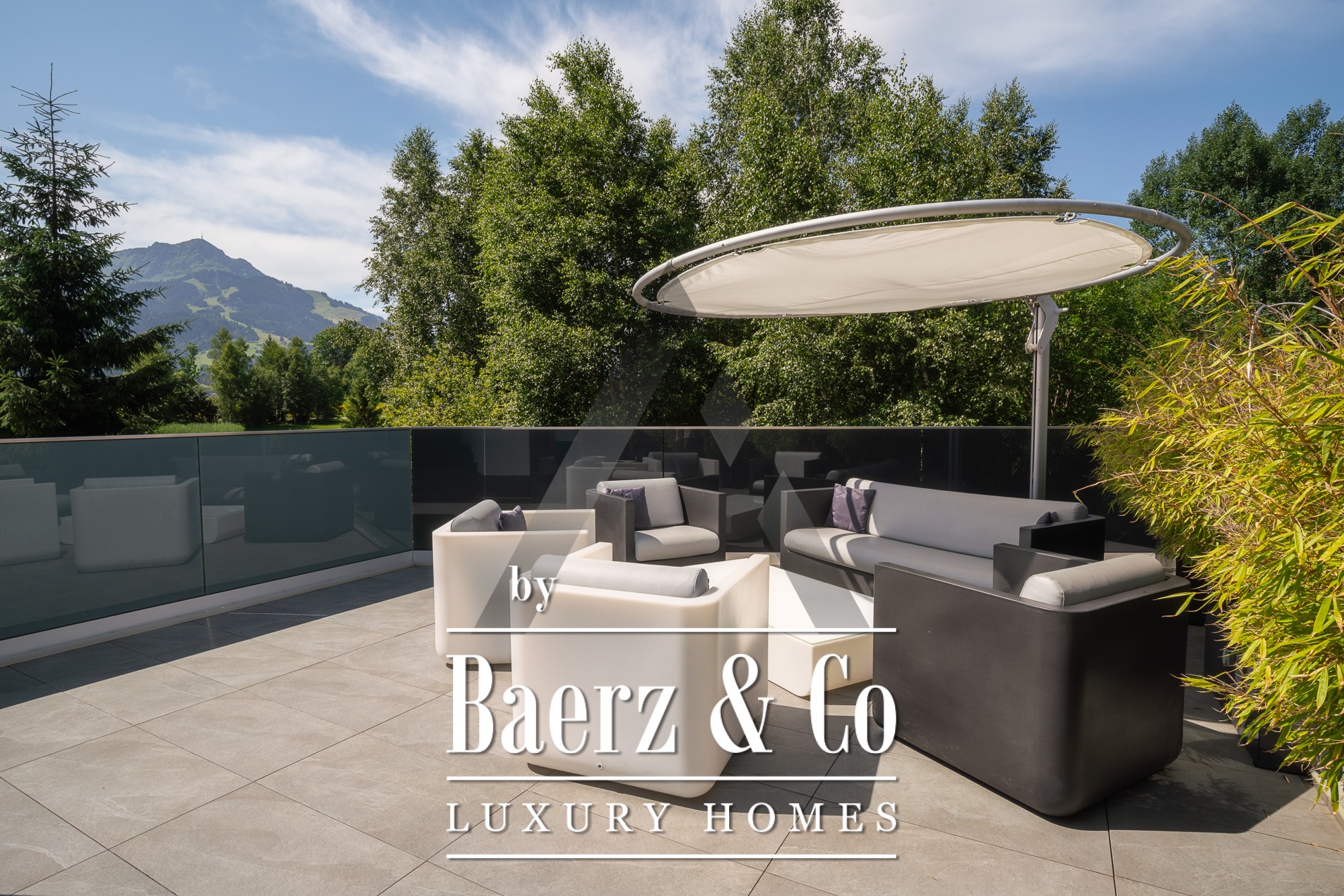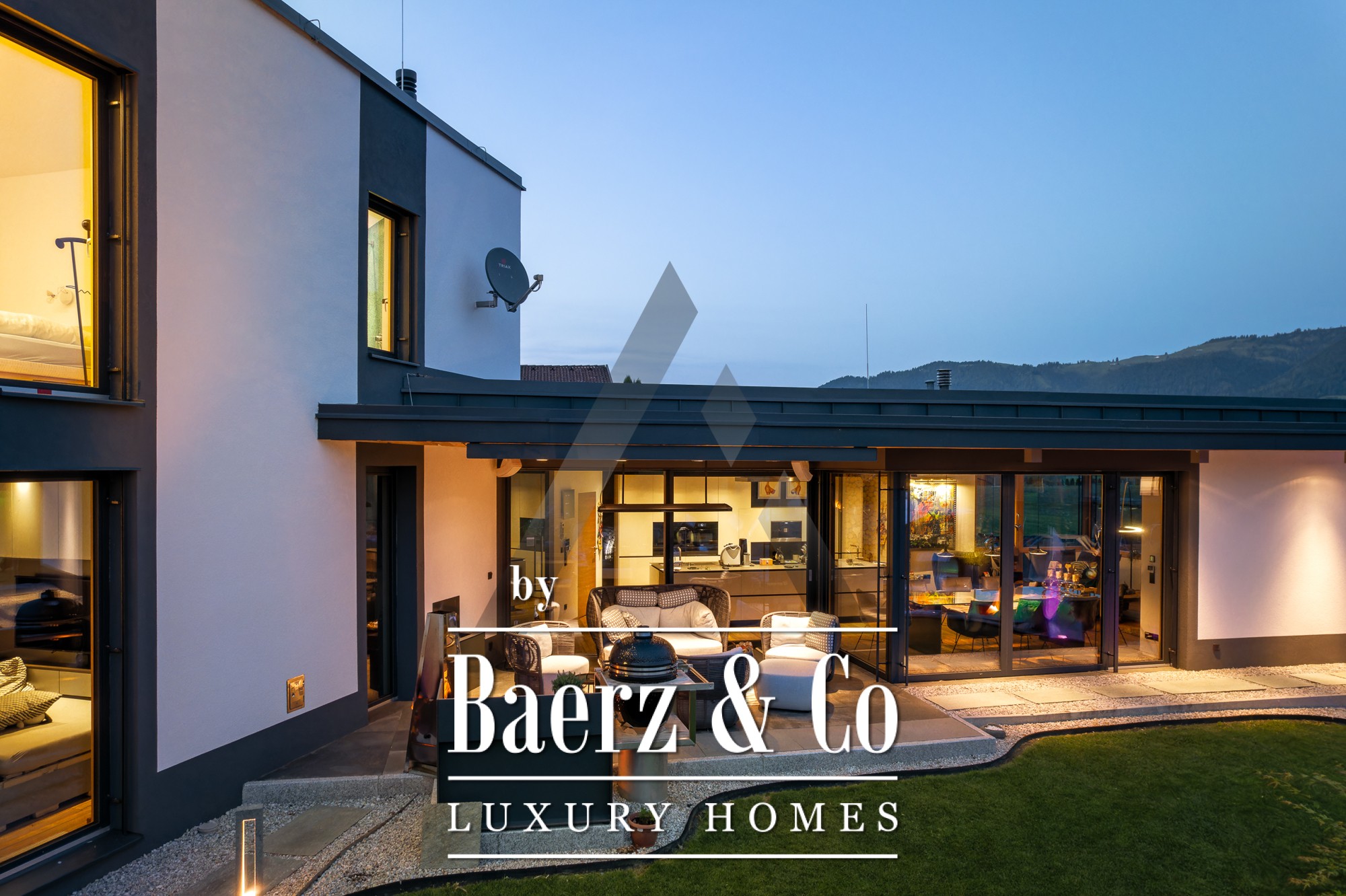 Im Inneren sorgen Sichtbetondecken und aufgearbeitete Eichenböden für eine dezente Eleganz. Das offen gestaltete Erdgeschoss bildet das Herzstück des Hauses, wo große Panoramafenster die Wohn- und Essbereiche sowie die exklusive Miele-Designerküche mit natürlichem Licht durchfluten. Auf dieser Ebene befinden sich ein Master-Suite mit Ankleidezimmer, ein Kinderzimmer, großzügige Bäder und äußerst praktische Staumöglichkeiten. Im Obergeschoss erwartet Sie eine separate Wohnung mit zwei Schlafzimmern, einem Wohnbereich mit Kamin und einer Dachterrasse mit herrlichem Bergblick. Abgerundet wird das Obergeschoss durch eine voll klimatisierte Fitness-Suite (18 m²) mit Zugang zu einer eigenen Terrasse.