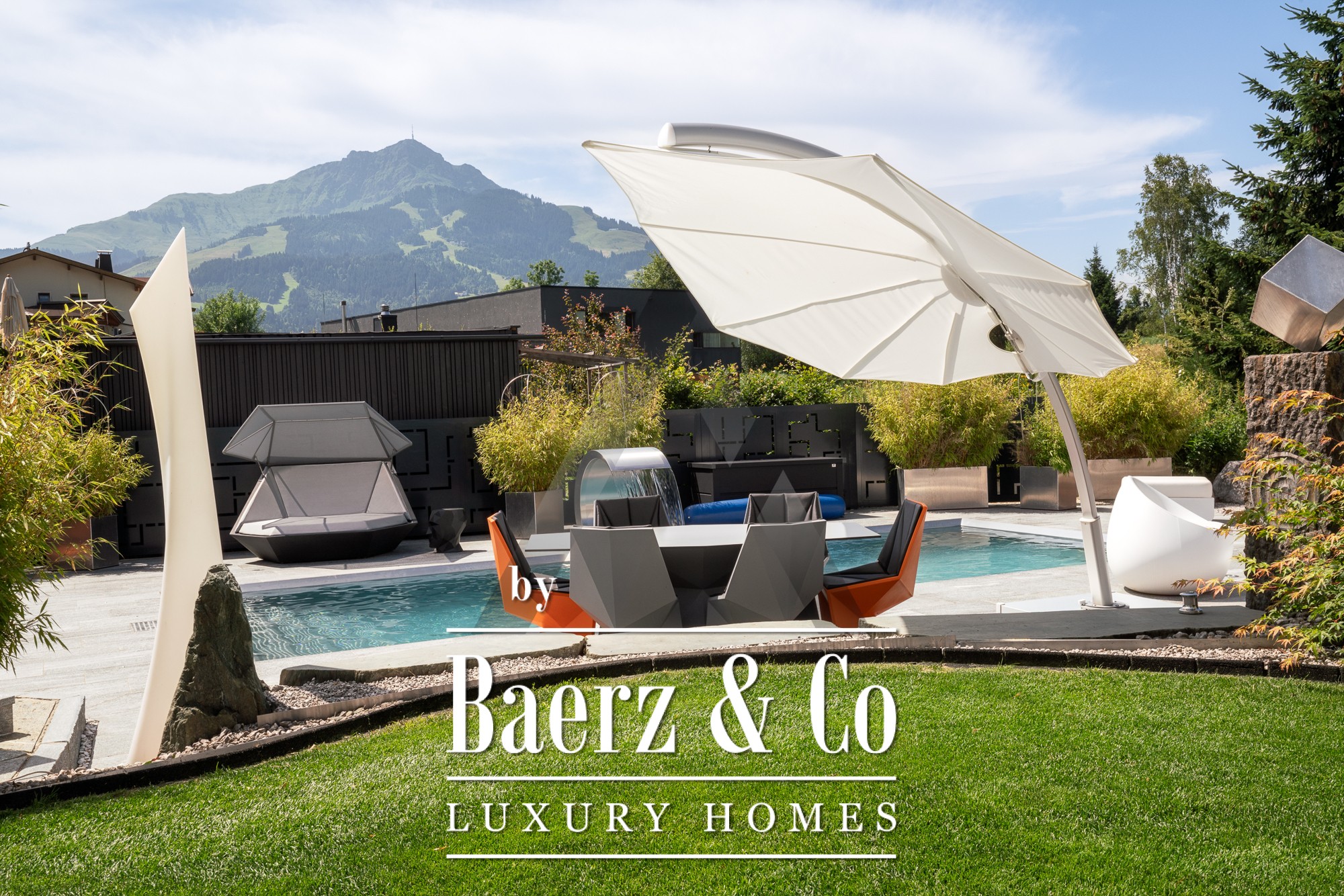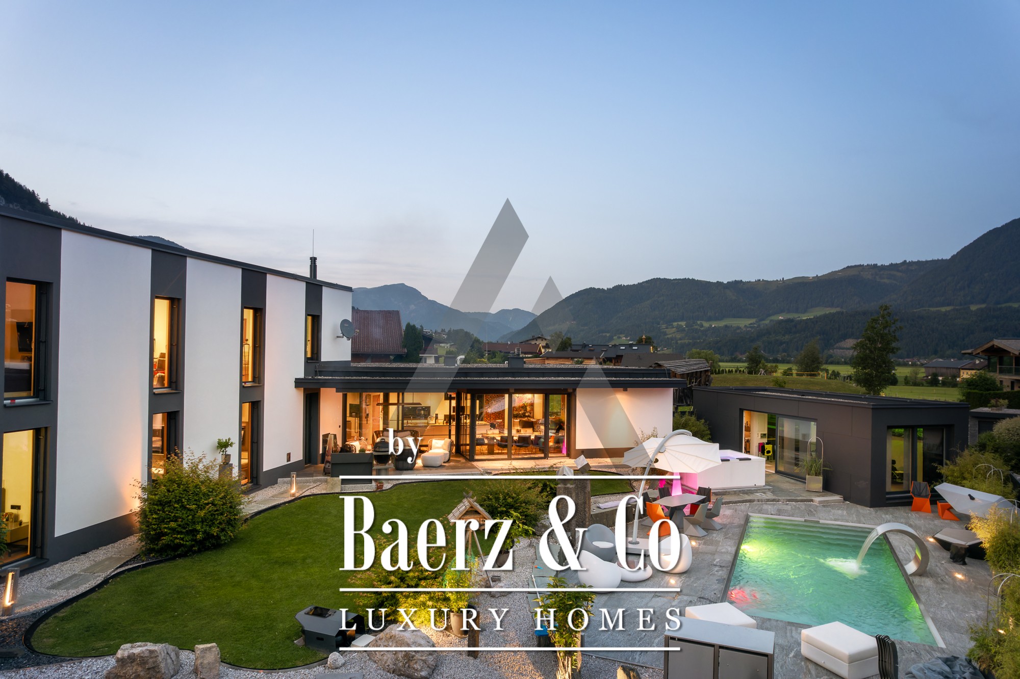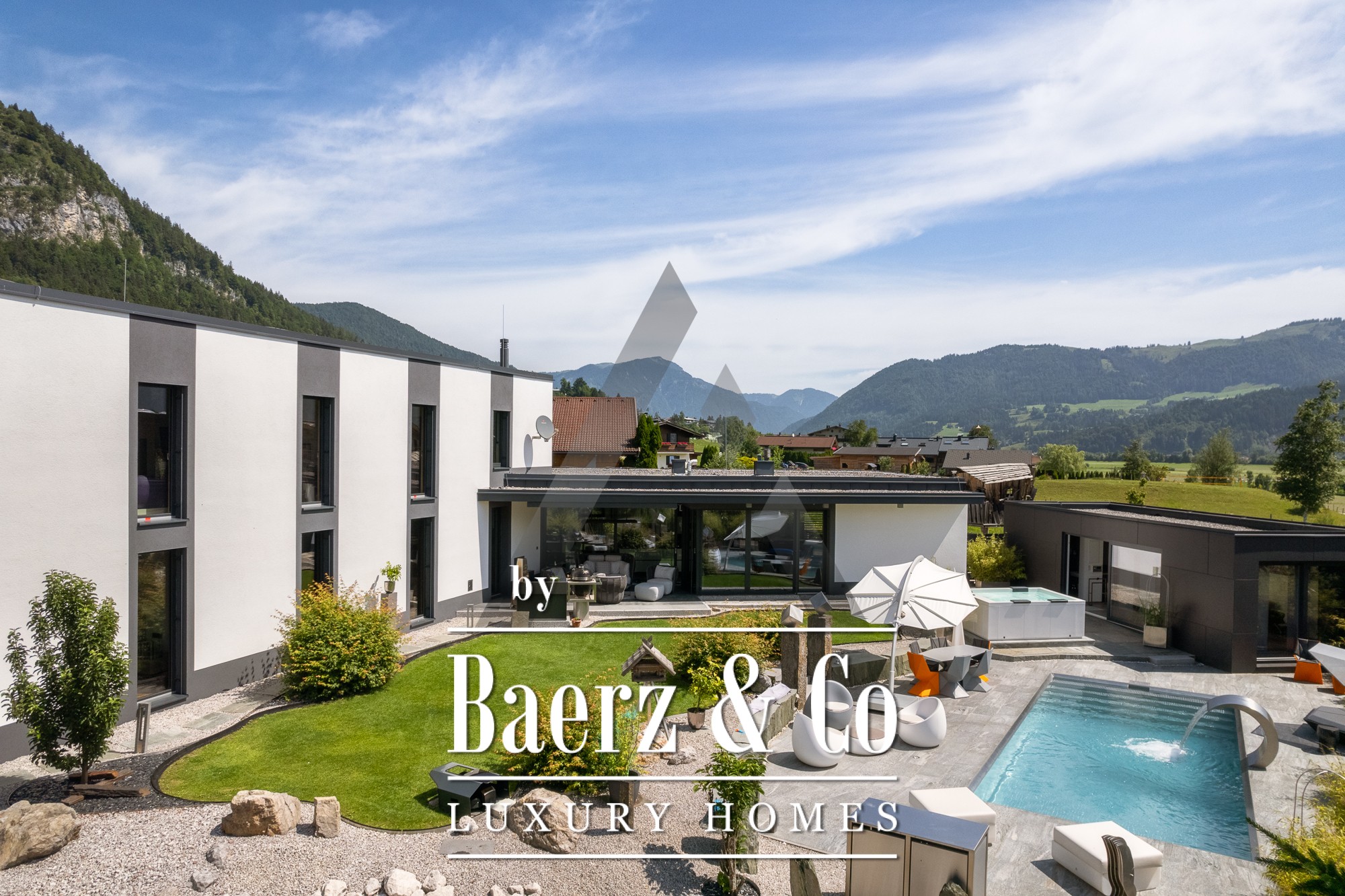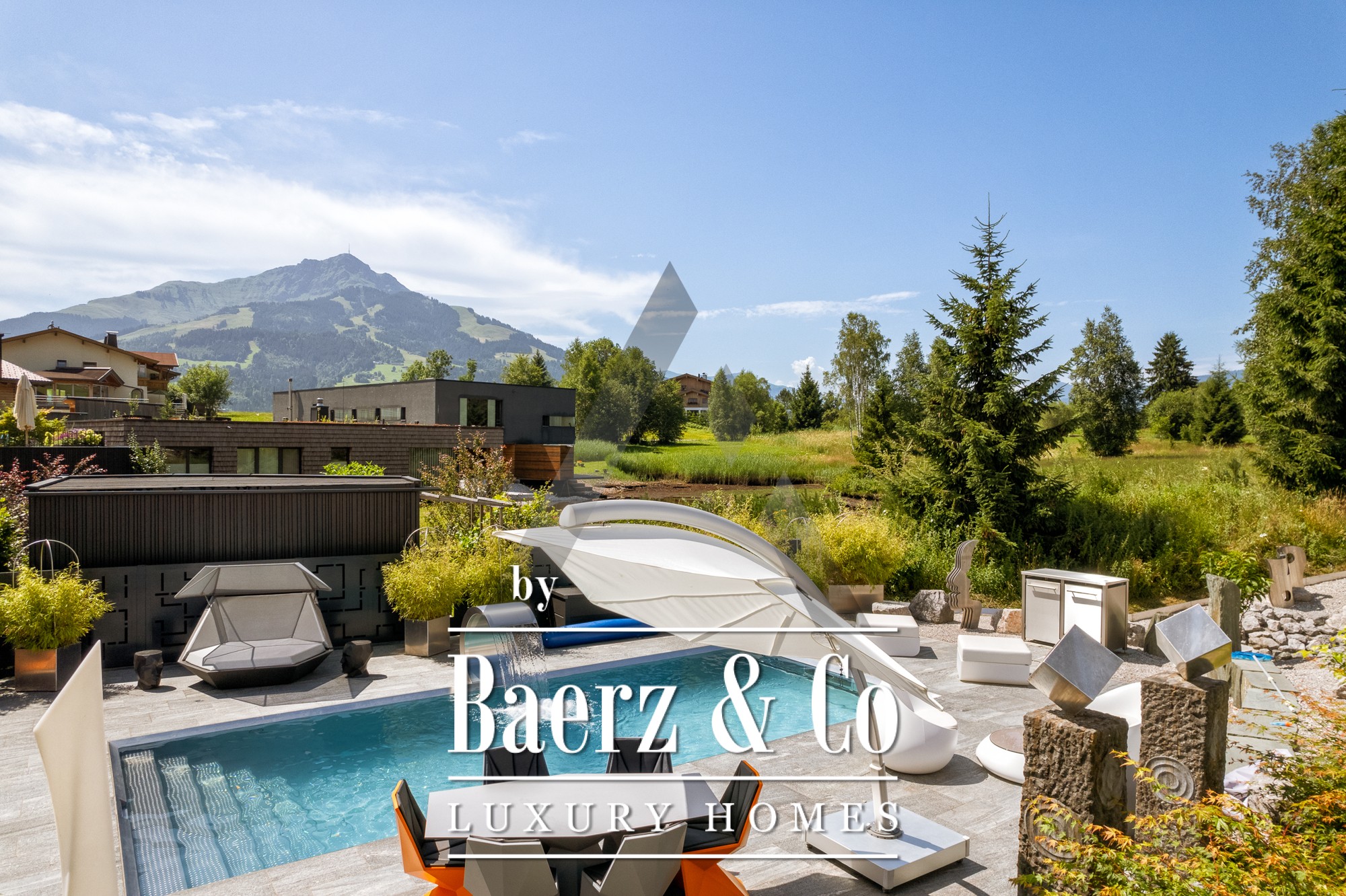 Das Einfamilienhaus in St. Johann in Tirol befindet sich in ruhiger und sonnenverwöhnter Lage und bietet einen beeindruckenden Ausblick auf das Kitzbüheler Horn und das Wilder Kaiser Gebirge. Diese zeitgenössische Immobilie mit 418 m² Wohnfläche auf einem 1.186 m² großen Grundstück verkörpert das Wesen eines anspruchsvollen alpinen Lebensstils. Die idyllische Landschaft wird von einem Teich, liebevoll gestalteten Bachläufen, großzügigen Terrassen und weitreichenden Bergpanoramen geprägt. Der Außenbereich besticht durch einen Edelstahlpool, einen Designer-Whirlpool von Treesse und eine Sauna, die zu entspannten Morgenstunden und erholsamen Nachmittagen einladen.