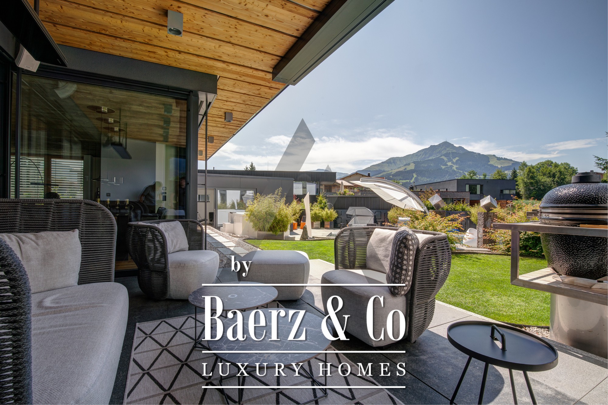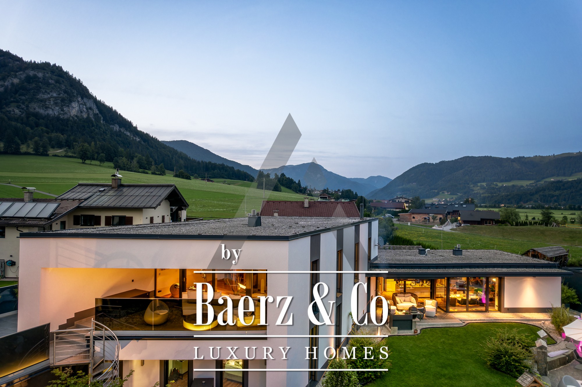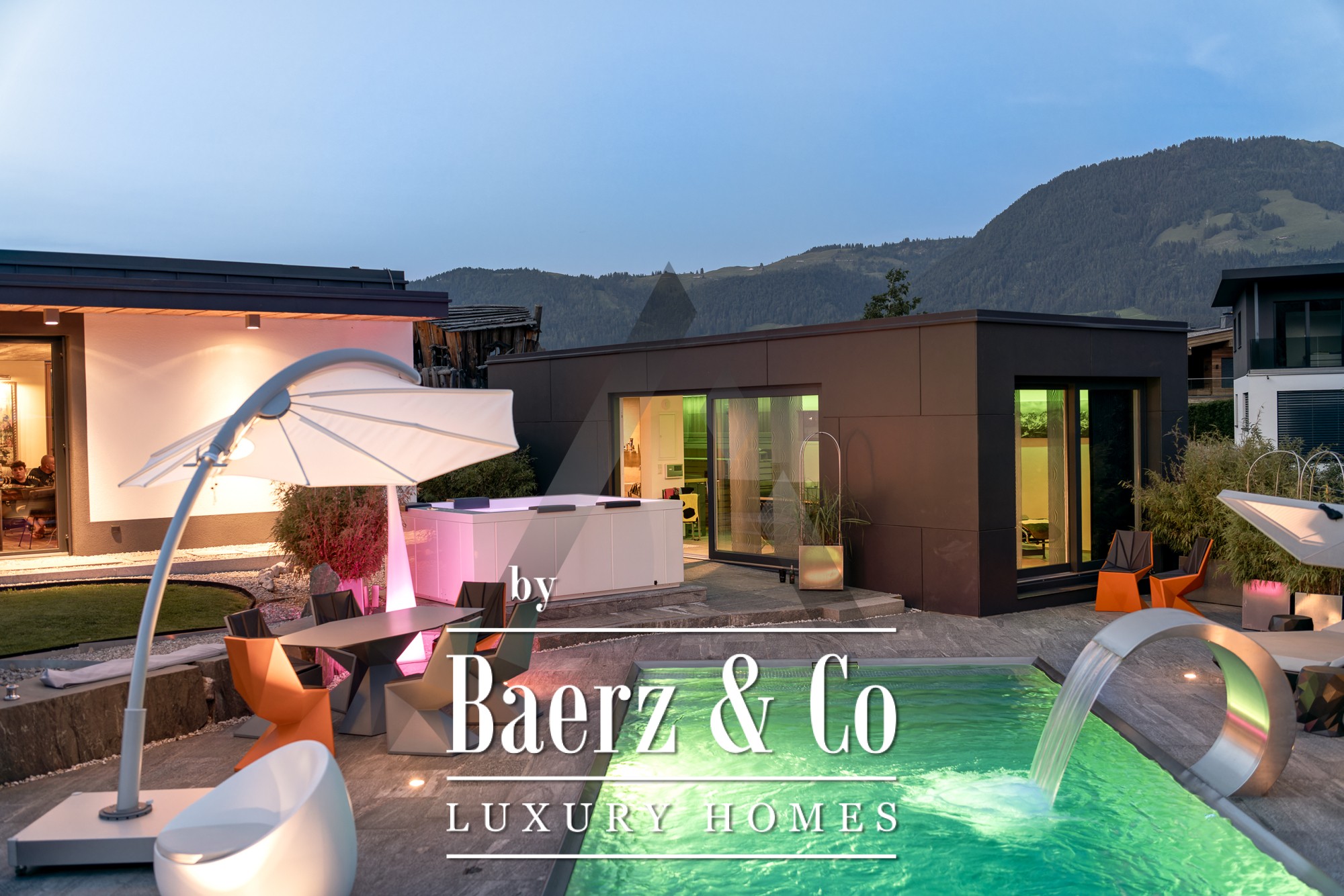 Das Einfamilienhaus in St. Johann in Tirol befindet sich in ruhiger und sonnenverwöhnter Lage und bietet einen beeindruckenden Ausblick auf das Kitzbüheler Horn und das Wilder Kaiser Gebirge. Diese zeitgenössische Immobilie mit 418 m² Wohnfläche auf einem 1.186 m² großen Grundstück verkörpert das Wesen eines anspruchsvollen alpinen Lebensstils. Die idyllische Landschaft wird von einem Teich, liebevoll gestalteten Bachläufen, großzügigen Terrassen und weitreichenden Bergpanoramen geprägt. Der Außenbereich besticht durch einen Edelstahlpool, einen Designer-Whirlpool von Treesse und eine Sauna, die zu entspannten Morgenstunden und erholsamen Nachmittagen einladen.