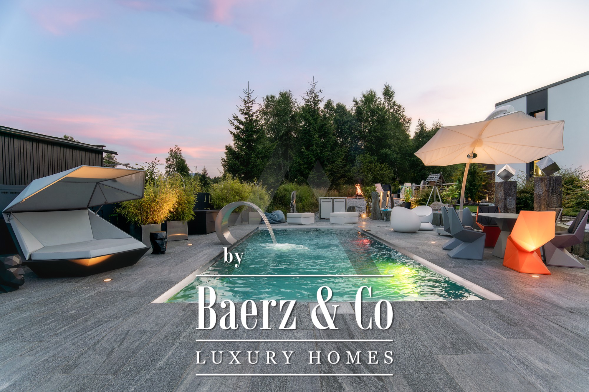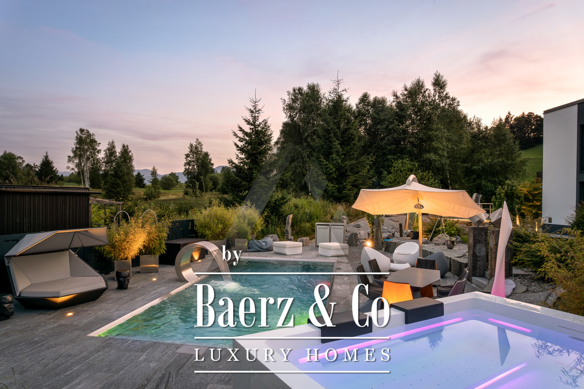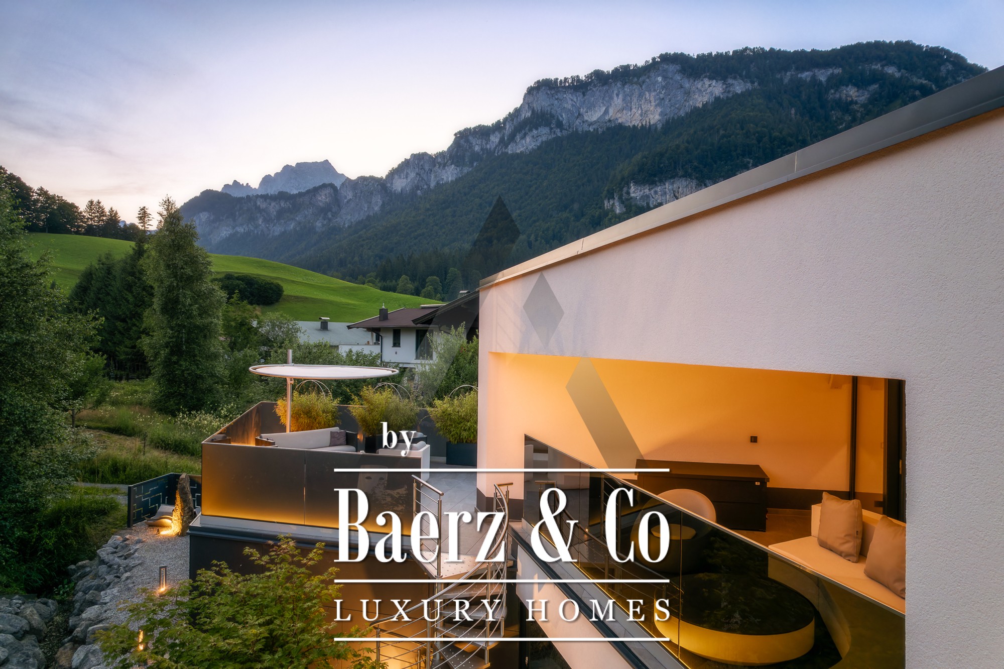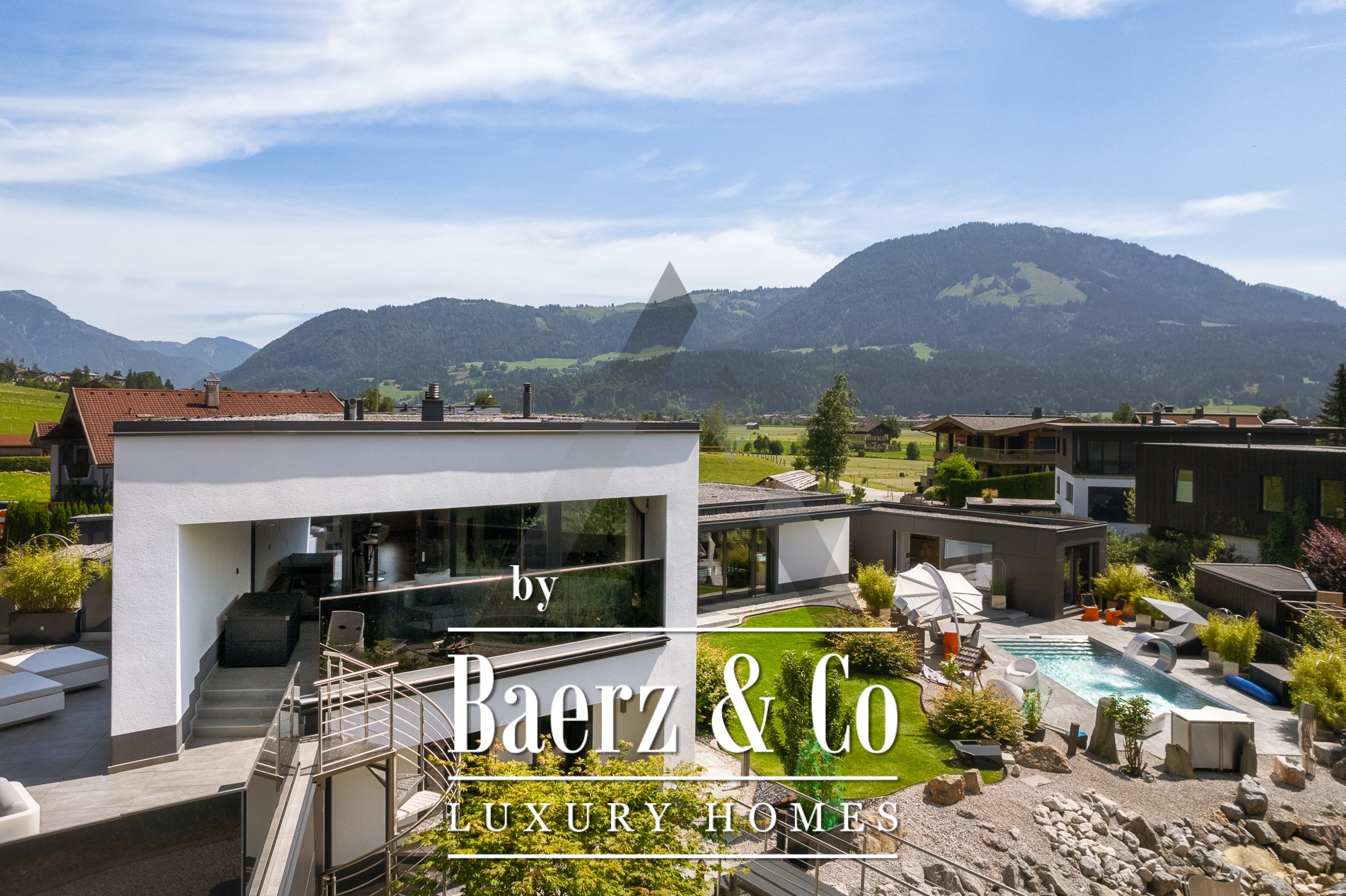 Das Einfamilienhaus in St. Johann in Tirol befindet sich in ruhiger und sonnenverwöhnter Lage und bietet einen beeindruckenden Ausblick auf das Kitzbüheler Horn und das Wilder Kaiser Gebirge. Diese zeitgenössische Immobilie mit 418 m² Wohnfläche auf einem 1.186 m² großen Grundstück verkörpert das Wesen eines anspruchsvollen alpinen Lebensstils. Die idyllische Landschaft wird von einem Teich, liebevoll gestalteten Bachläufen, großzügigen Terrassen und weitreichenden Bergpanoramen geprägt. Der Außenbereich besticht durch einen Edelstahlpool, einen Designer-Whirlpool von Treesse und eine Sauna, die zu entspannten Morgenstunden und erholsamen Nachmittagen einladen.