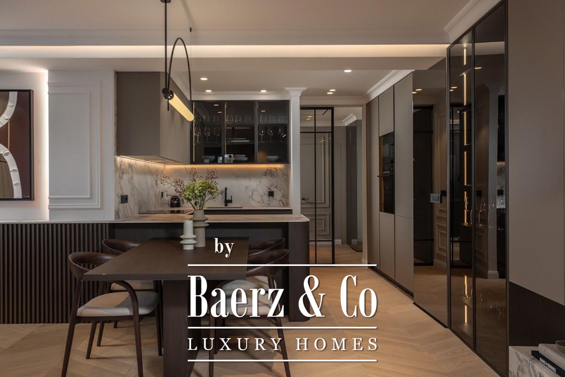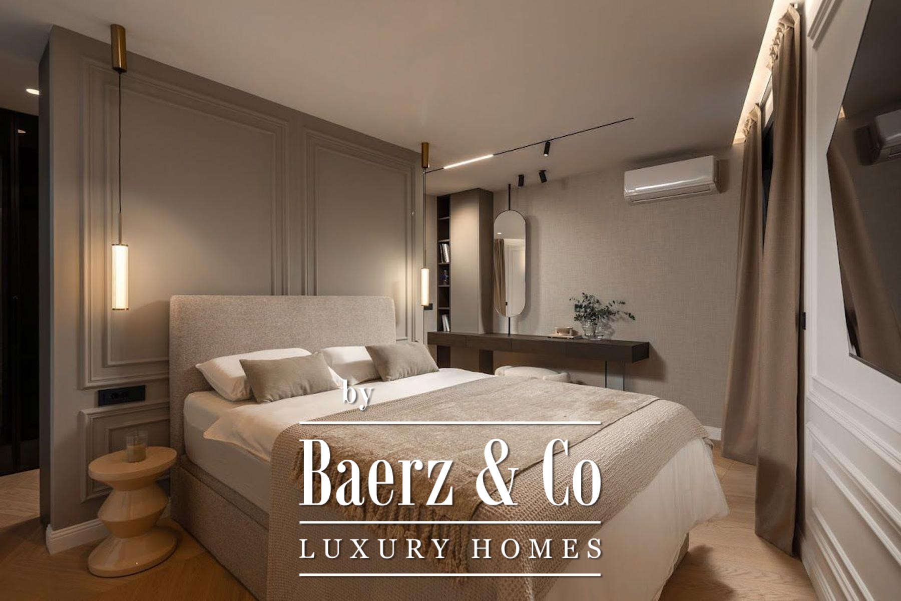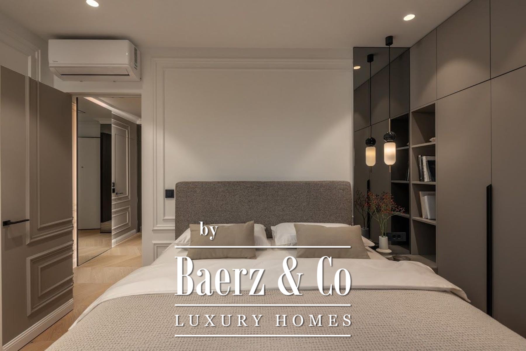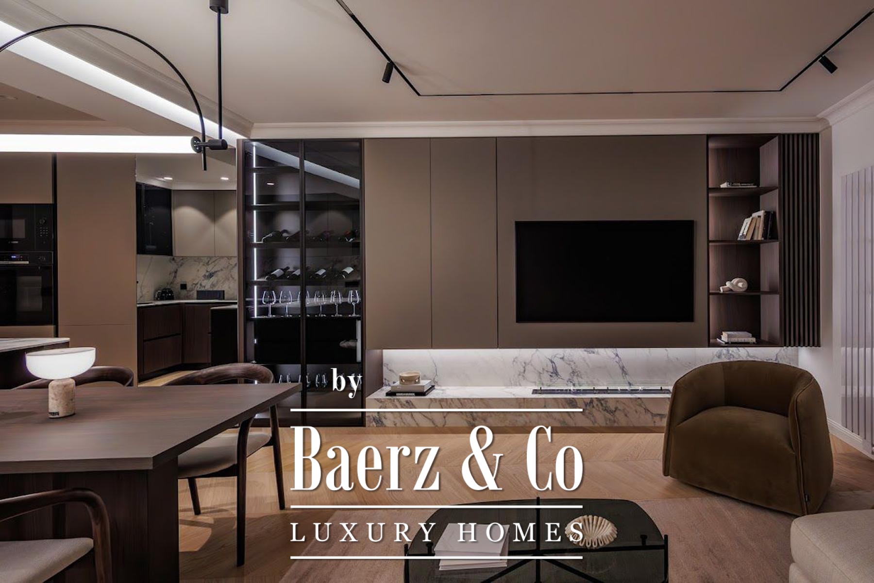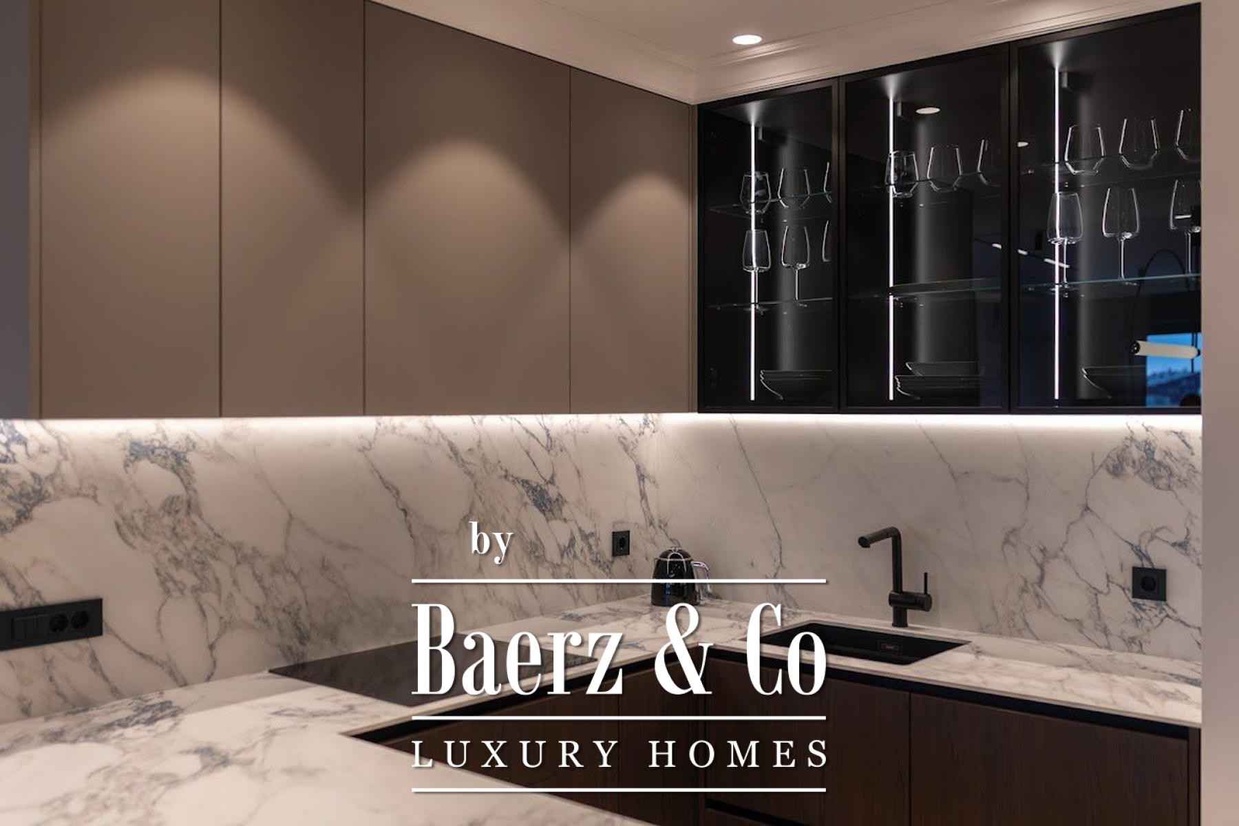 Vom direkten Aufzugseinstieg aus, der die Tiefgarage mit dem privaten Eingang verbindet, vermittelt das Penthouse seltene Intimität und Diskretion. Die Residenz umfasst fünf Schlafzimmer und fünf Bäder, jeweils mit maßgefertigten Sanitäreinrichtungen und Fußbodenheizung. Die Wohnbereiche sind lichtdurchflutet und zeichnen sich durch edles Chevron-Boen-Parkett, Aluminiumfensterrahmen, dreifach verglaste Fenster und integrierte LED-Beleuchtung aus, was eine raffinierte und einladende Atmosphäre schafft.