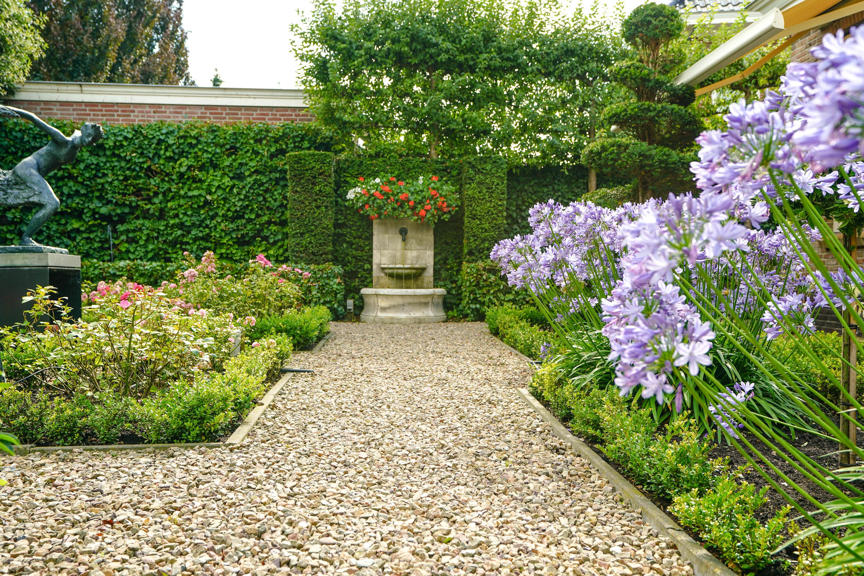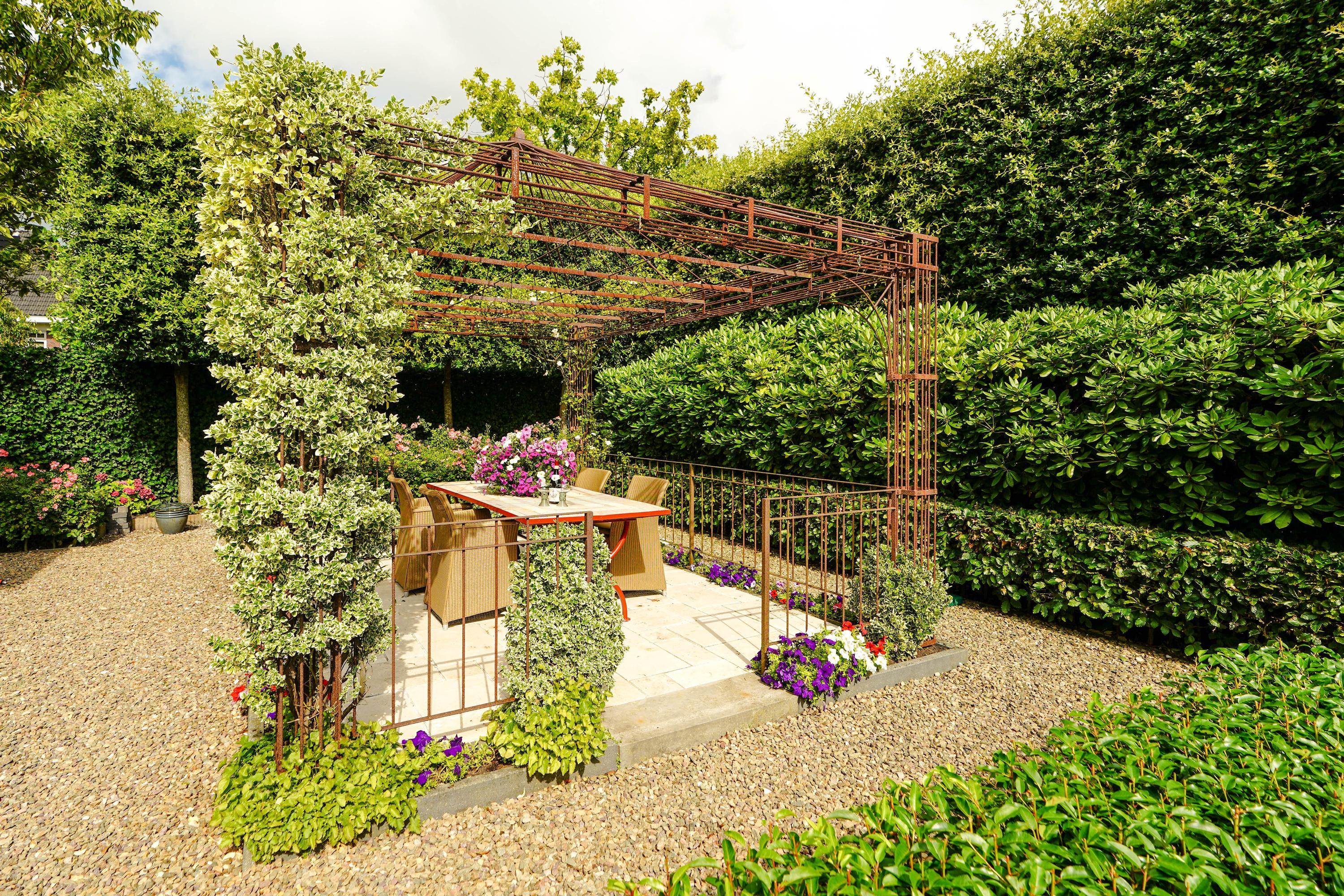 De zeer waardevolle siertuin voegt een bijzondere beleving toe aan het wonen in deze villa. De voortuin, geometrisch aangelegd in klassieke stijl, is een representatieve binnenkomer. De brede zijtuinen langs het huis zijn royaal beplant, met hagen, struiken en bomen. In de achtertuin zorgt een 3,5 meter hoge kraag van 24 wintergroene steeneiken langs de erfafscheiding het hele jaar door voor maximale privacy. Op het terras van 46 m2 is het heerlijk zonnen én feesten. Als het ijzeren prieel 's zomers versierd is met bloemborders, klimrozen en hanging baskets, is het er aangenaam toeven aan de buitentafel. De Franse fontein aan de rechterzijde en het Italiaanse fonteintje aan het terras zijn verfrissende elementen in de zomerse tuin. De bronzen sculpturen zijn apart te koop.
