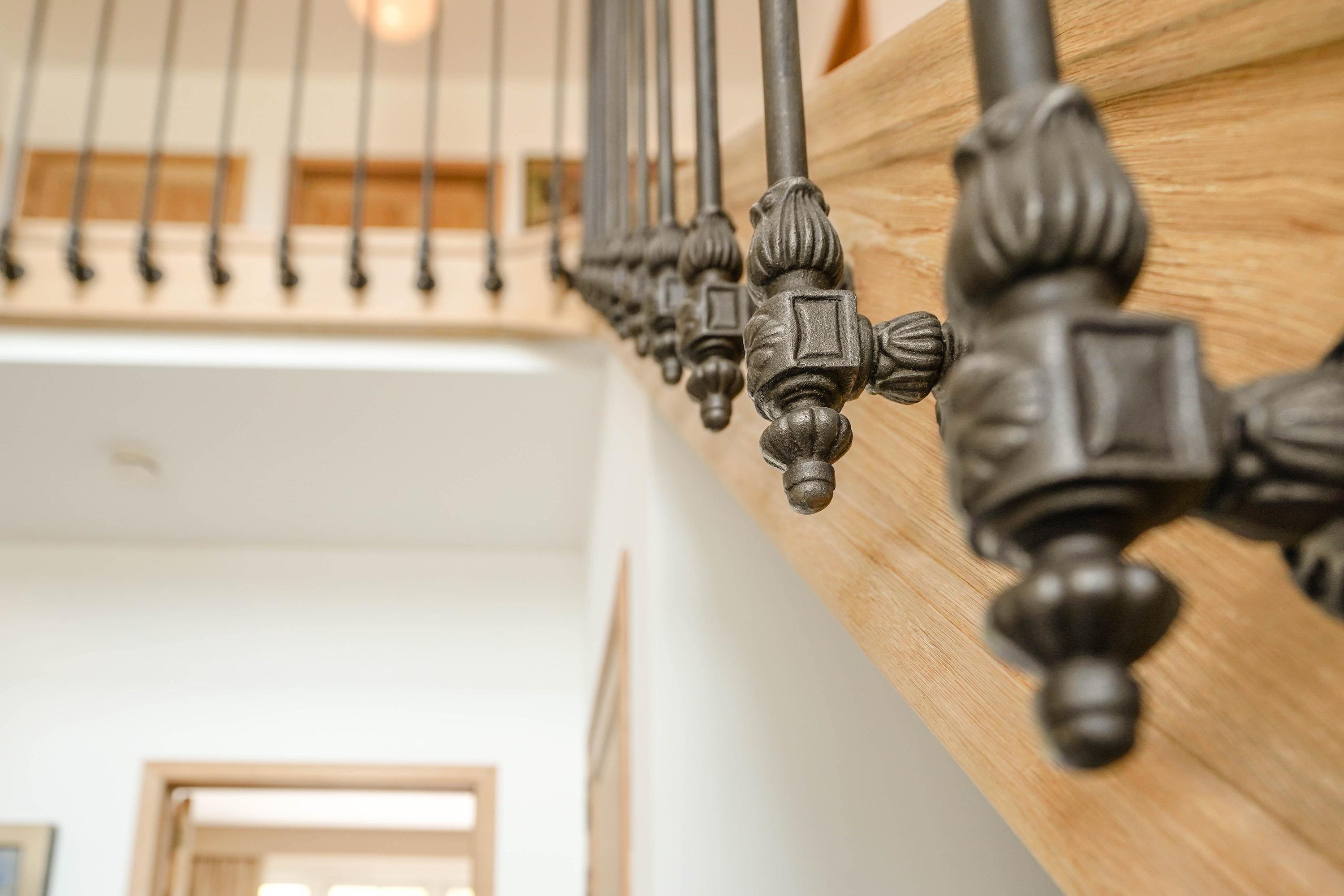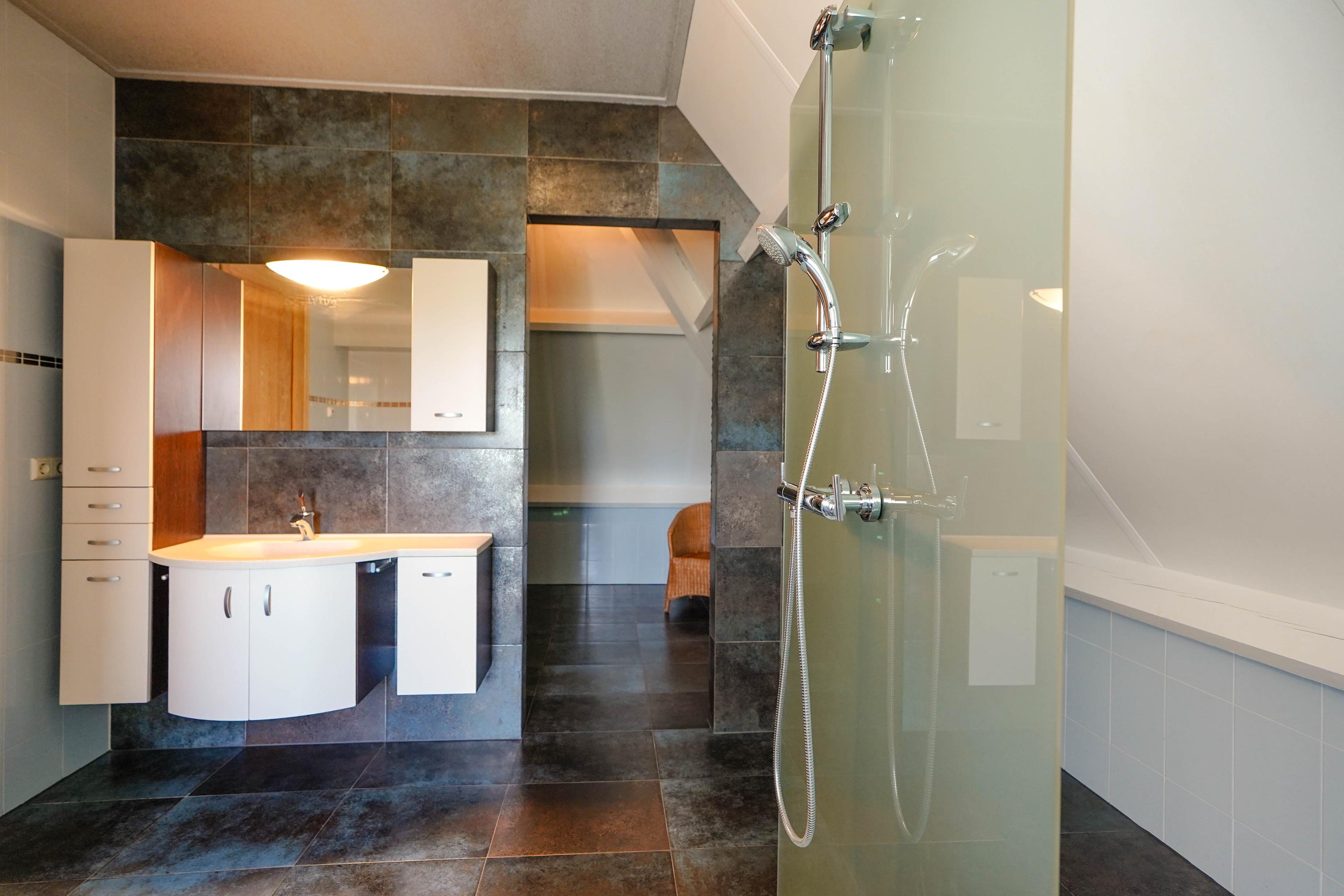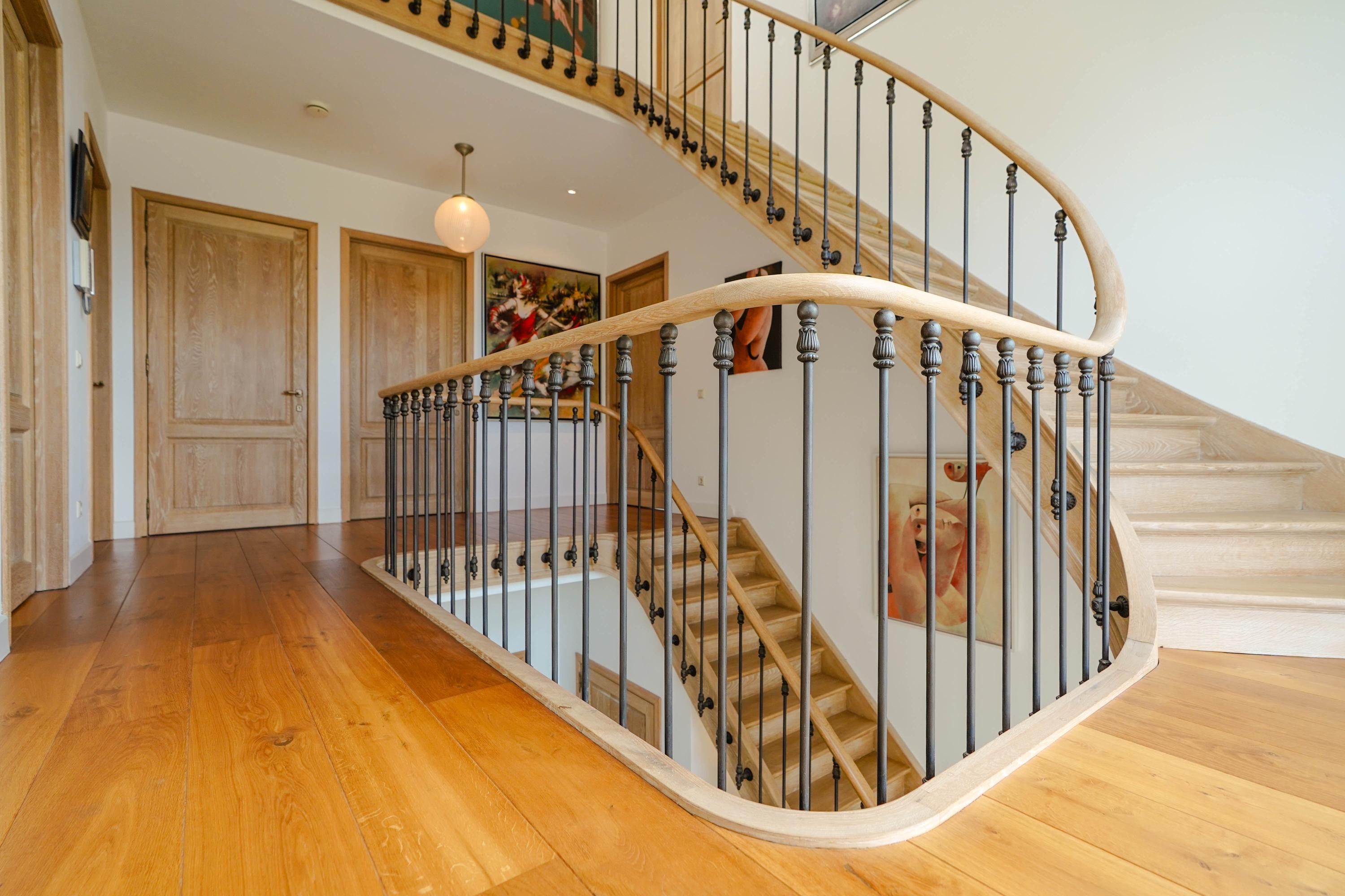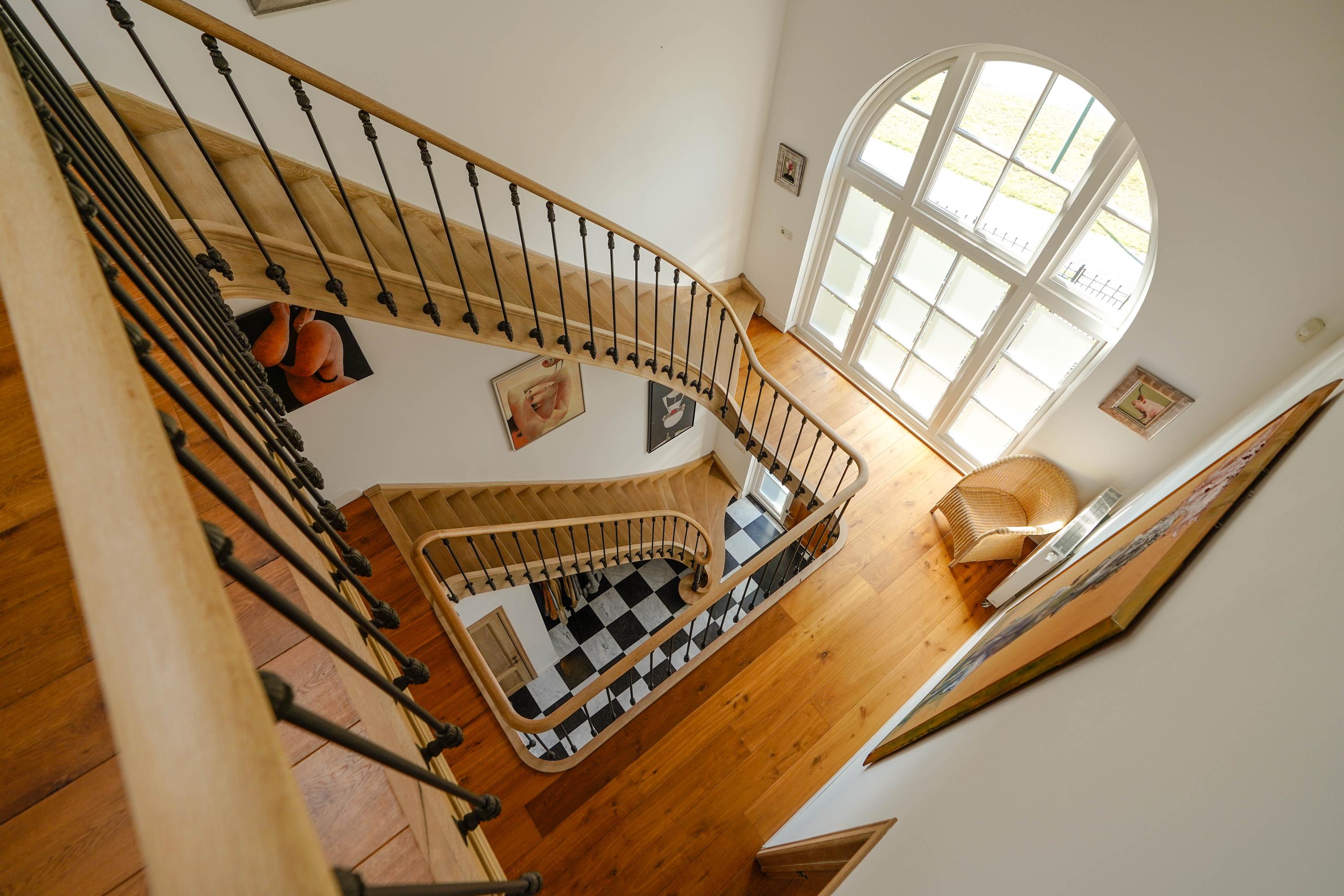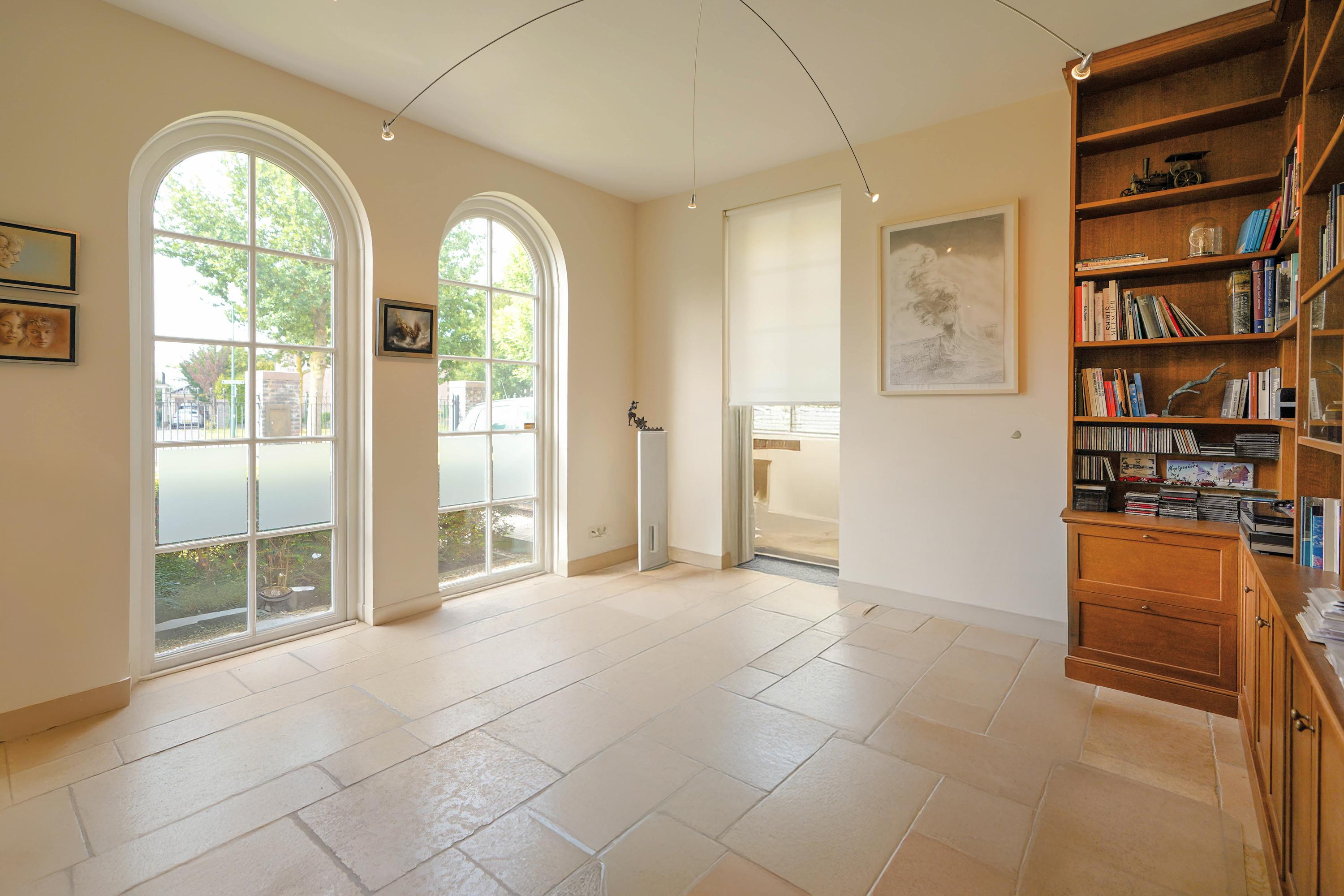 Architectural details make this villa truly distinctive: four arched windows, a curved glass central bay, hand-formed brickwork, and a robust oak front door with custom wrought iron hardware. The interior is filled with carefully selected materials, highlighted by a sculpted oak staircase from Luc Steels, solid wooden flooring, and an open flow between living spaces. Light is drawn from skylights and broad glazed facades, creating an uplifting atmosphere throughout the home.