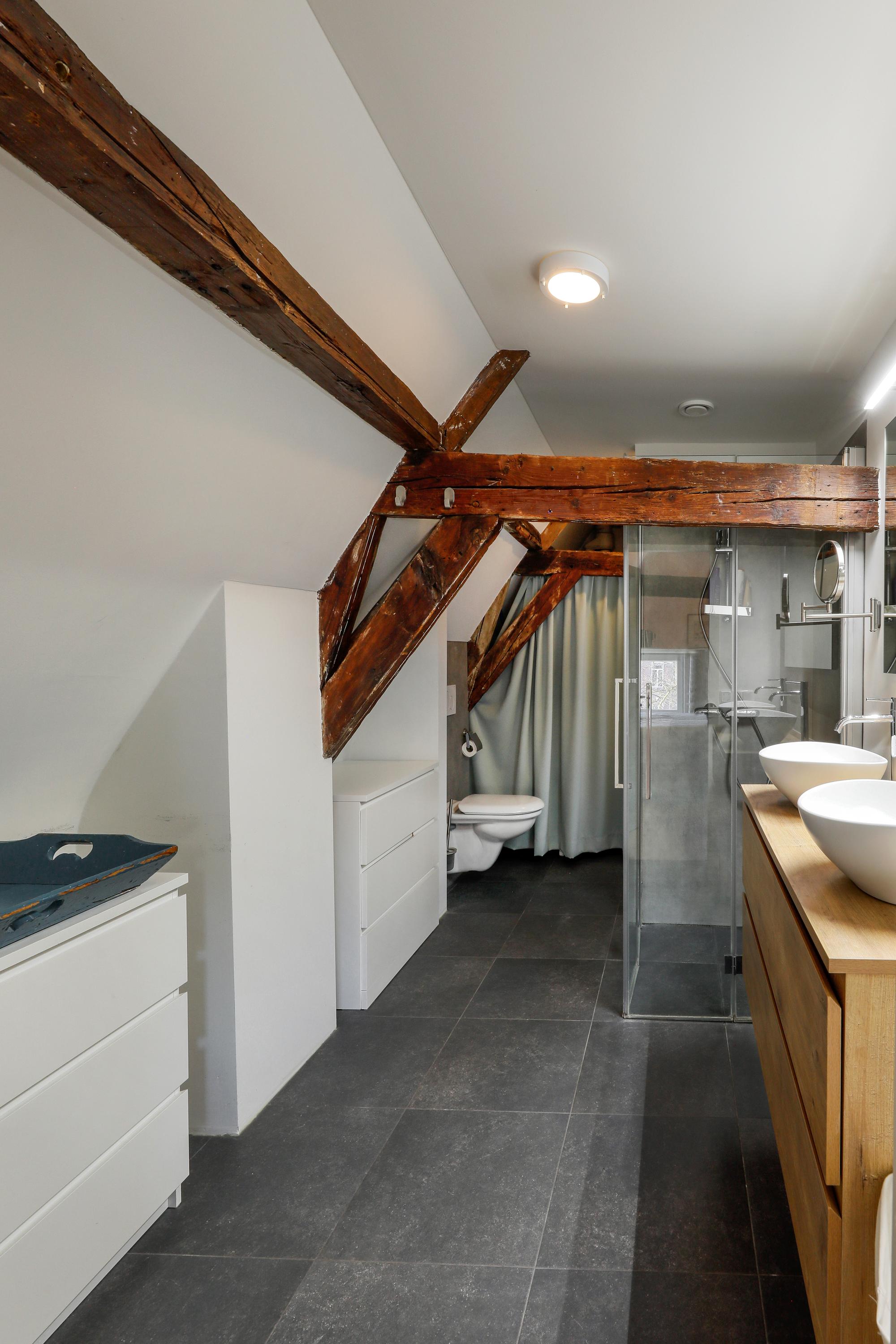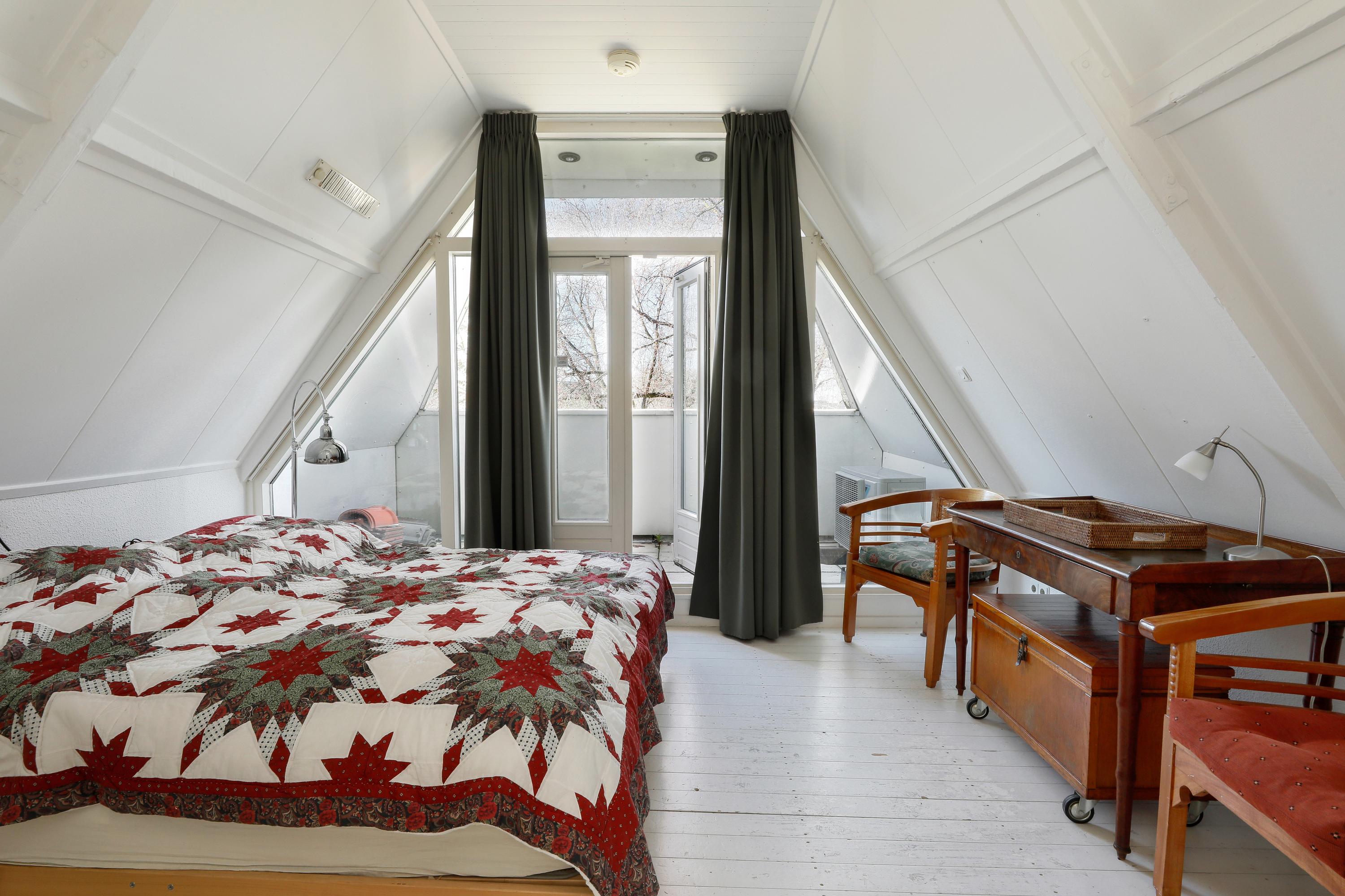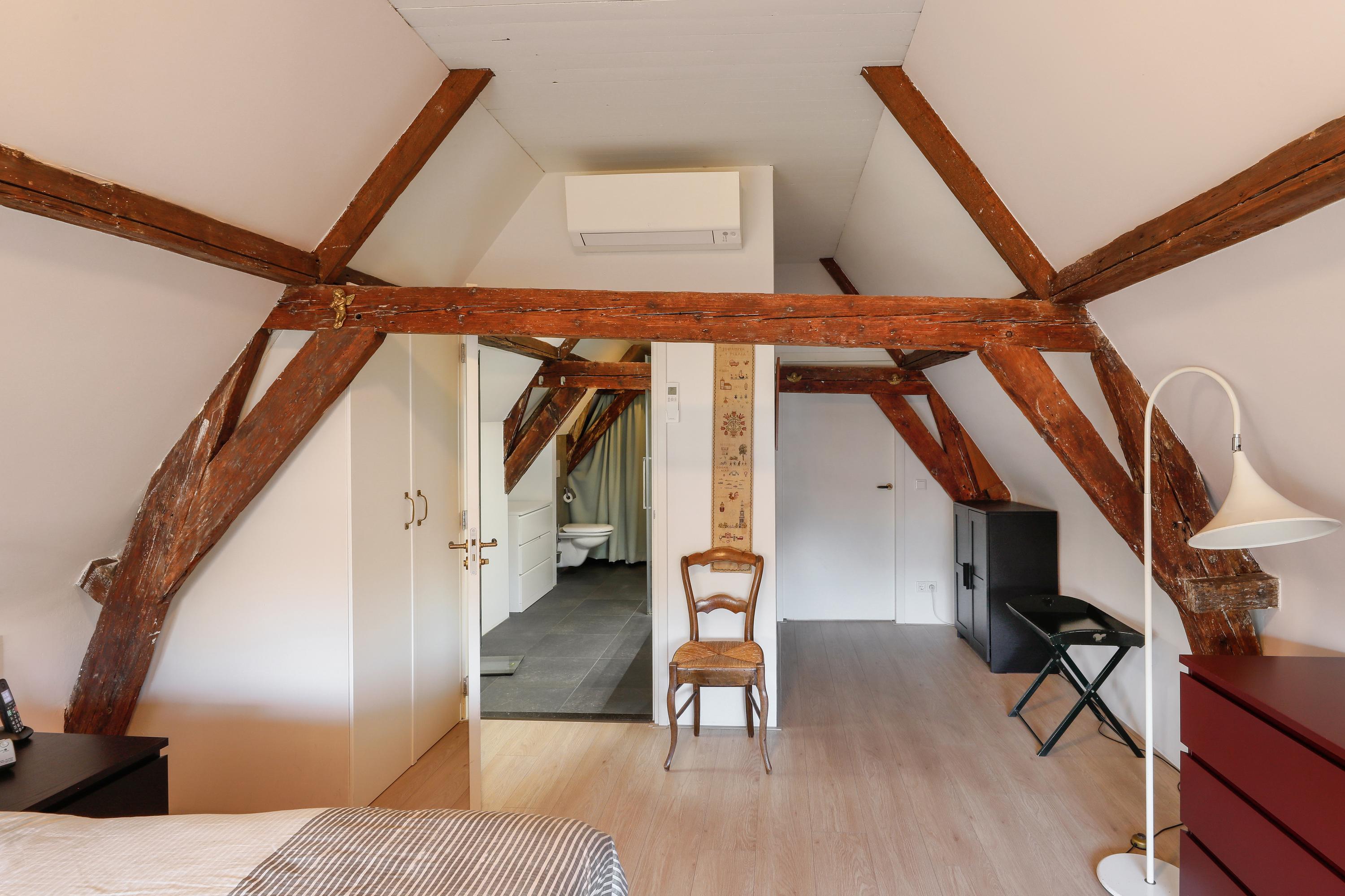 Two bedrooms under the characteristic roof eaves, one with a water view and one with a private loggia that catches the afternoon and evening sun. The bathroom features a walk-in shower, vanity, and toilet. This floor is accessible by stairs and elevator.