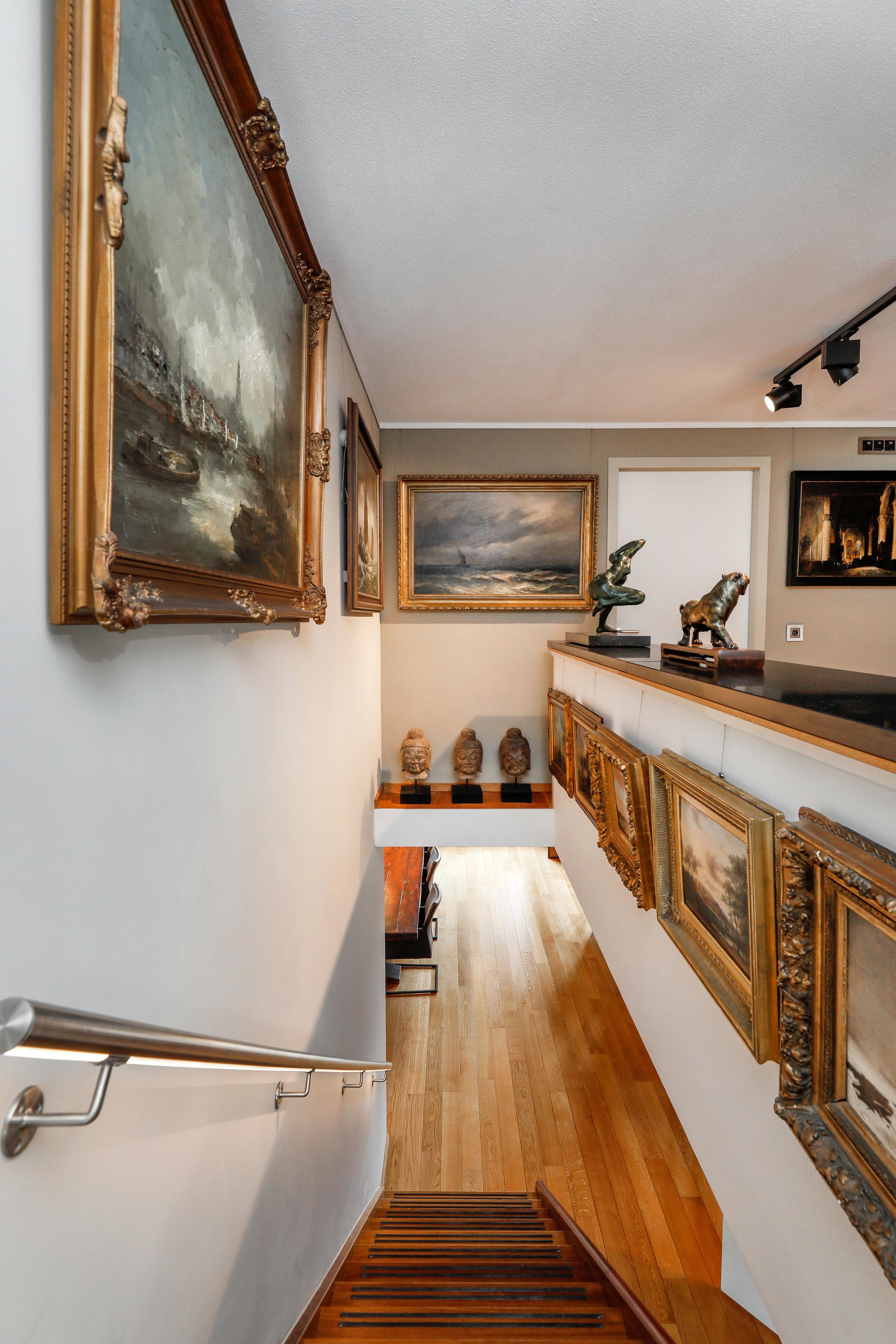 It's quite special to find this modern home behind the historic facade. During the renovation/reconstruction, only the front facade remained. With the tall windows, that history still permeates your luxury apartment. And thankfully so. The ceiling height on the facade is still approximately 580 cm. Beautiful, and it allows light to penetrate deeply into your home. Where a loggia was planned in 2001, there's now a space that can be used year-round. So even on a summer day, it can be used as a loggia by opening the large, tall windows. A cozy seating area and the kitchen are located downstairs.