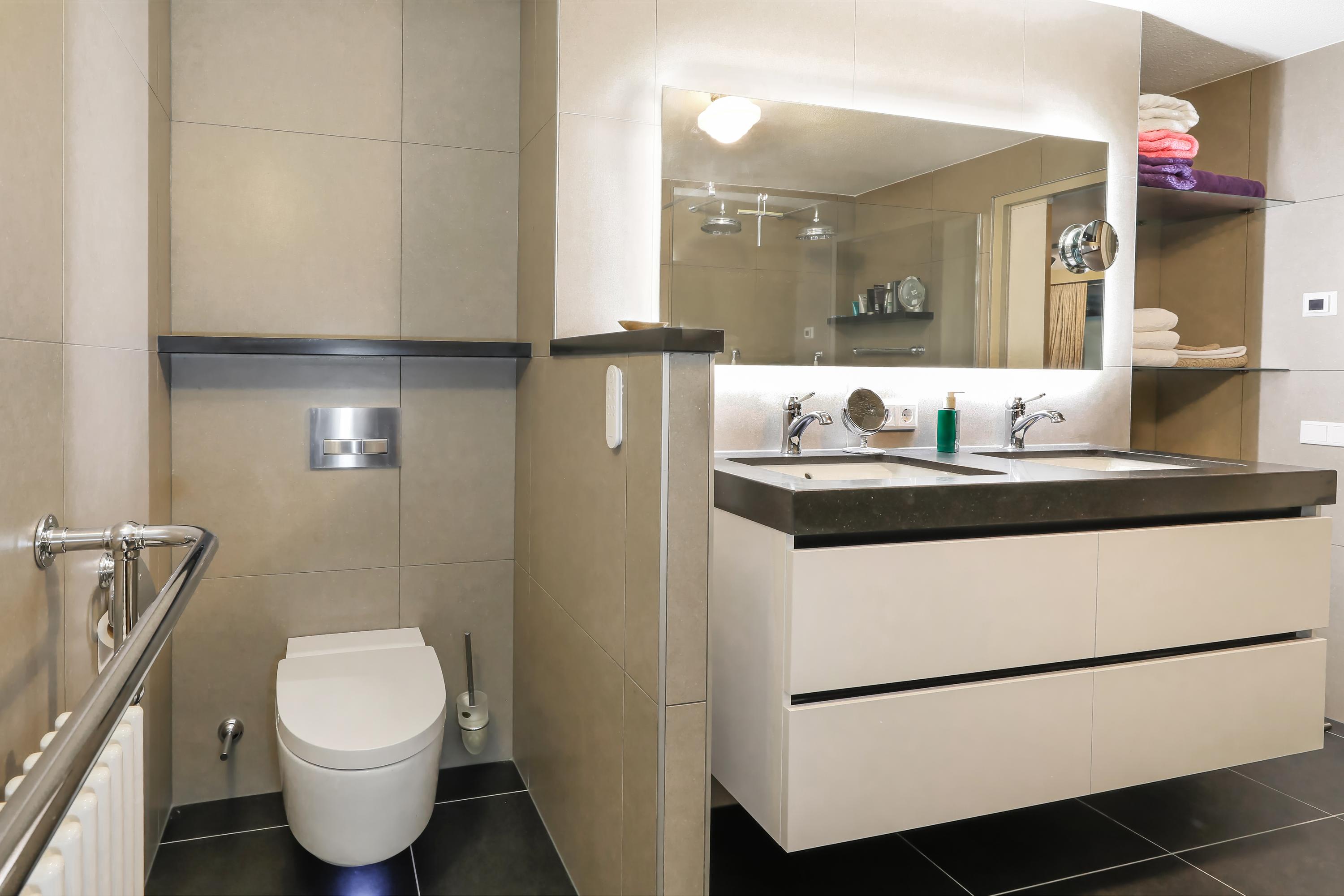With soft tones, large tiles, and a well-designed layout, a double walk-in shower was installed in 2018, which you'll thoroughly enjoy. The floor is tiled with non-slip underfloor heating. The Geberit Mera AquaClean toilet is placed behind a low wall for privacy. There's a double shower and a slightly raised vanity with two sinks and a heated mirror. Towels and other bathroom utensils can be conveniently stored in cupboards and on open glass shelves.