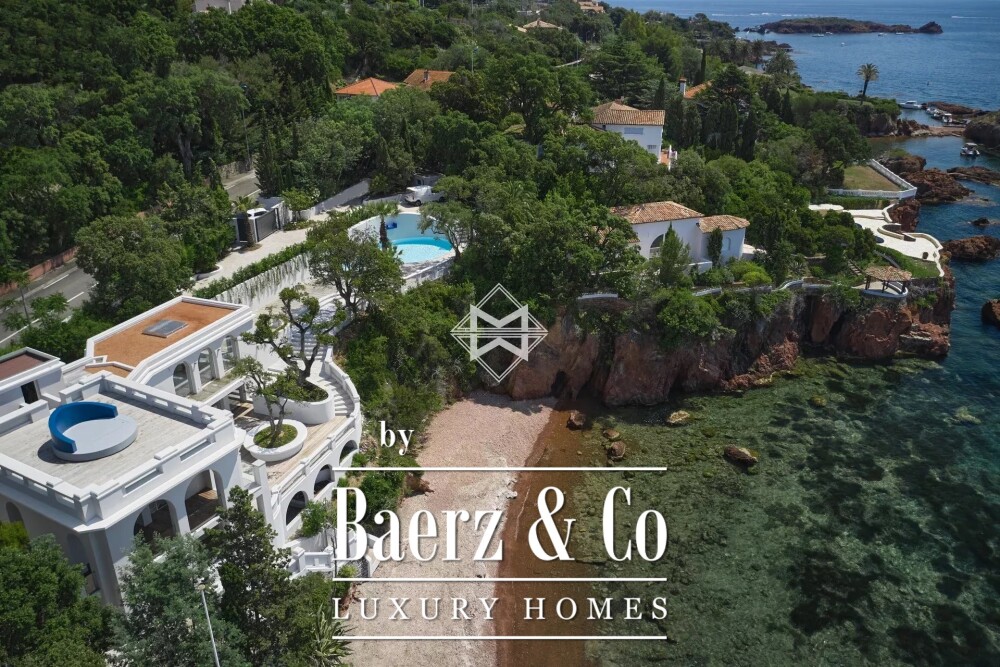 Property Agay presents an exceptional waterfront setting where the Mediterranean unfolds in uninterrupted perspective, the red rock cliffs of the Esterel frame every view, and private direct access places the beach at your feet. This estate, fully restored with deliberate respect for its provenance, encompasses a main villa of approximately 300 m², offering three suites, complemented by a separate 100 m² guest house with two additional bedrooms. A caretaker’s house remains to be tailored to your needs.