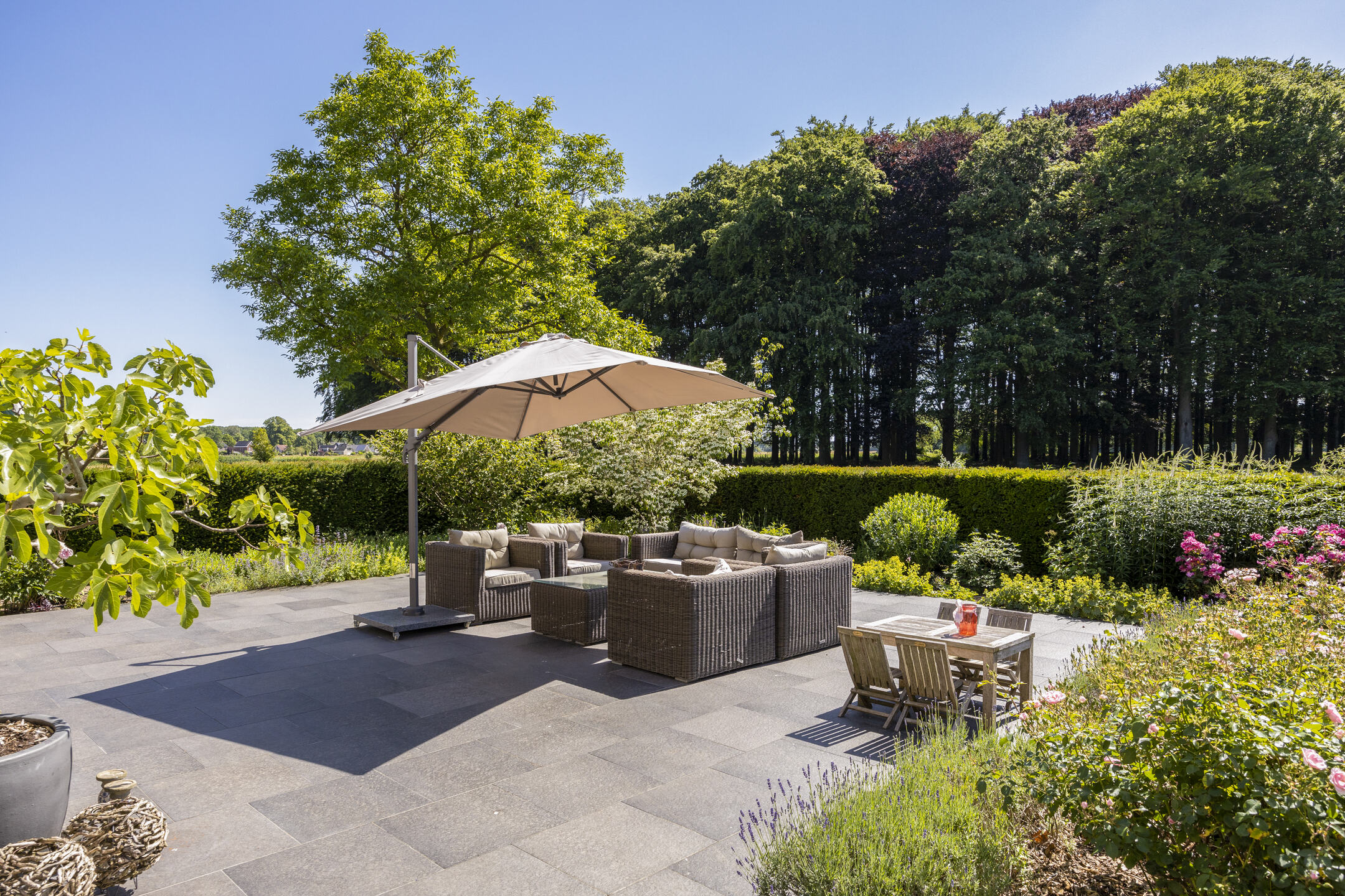 In front of the kitchen is the lovely sun terrace, with rose bed and yew hedge. Perfect for sunny lunches and dinners, or just lounging all day in the lounge set.