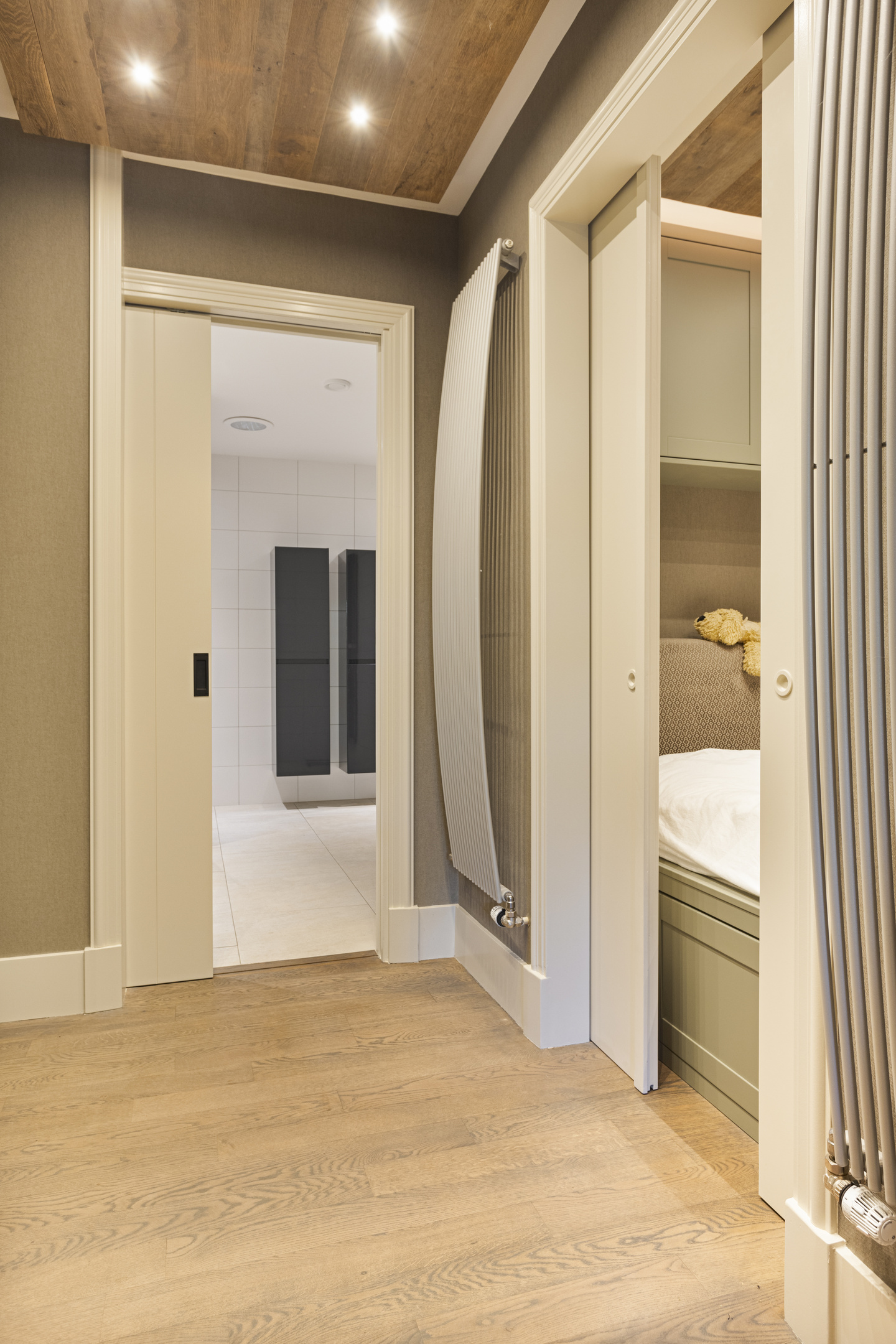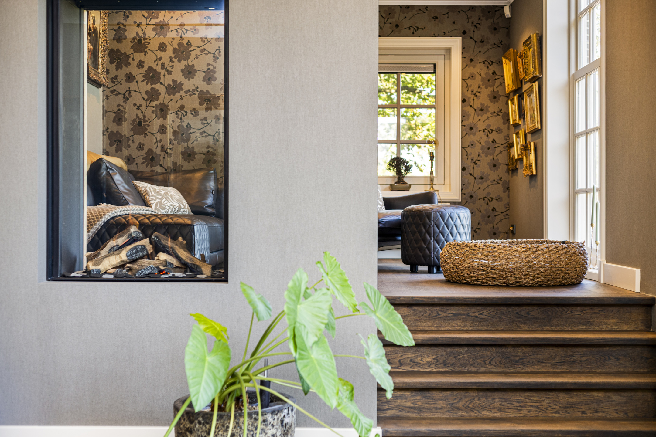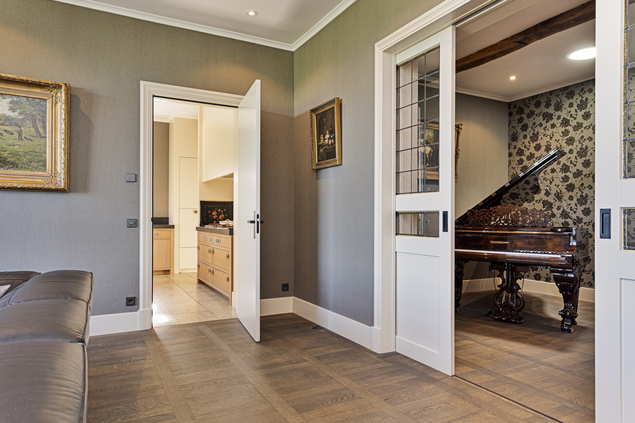 The living room has a magnificent floor; it is an old castle floor from the French chateau of the previous owners. The current residents had it beautifully sanded and coated with a refined gray floor oil, blending seamlessly into the contemporary interior. The music room is a room en-suite, separated from the living room by sliding doors, and now has the role of an old-fashioned art cabinet, but one whose indoor climate can be adjusted entirely as desired. If you do not have a Steinway or art collection to display here, then this is a wonderful study, library, cinema or dining room. To the left, overlooking the garden and side terrace, is the upstairs room, which shares a gas fireplace with the living room. A lovely corner to crawl away with a good book.