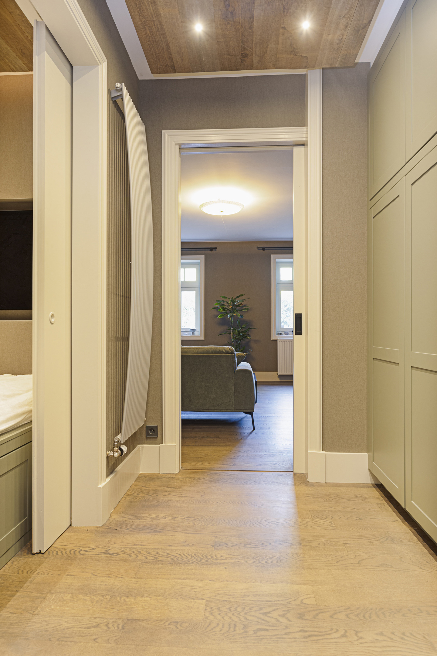The studio features a spacious living room with a floor of oiled smoked oak. In the hallway to the left is a handmade built-in closet in a lovely lime green, and to the right is the bedstead, with sliding doors and space for a large television. Following this is the large bathroom with double sink, WC and walk-in shower, and the first approach to the door to the part.