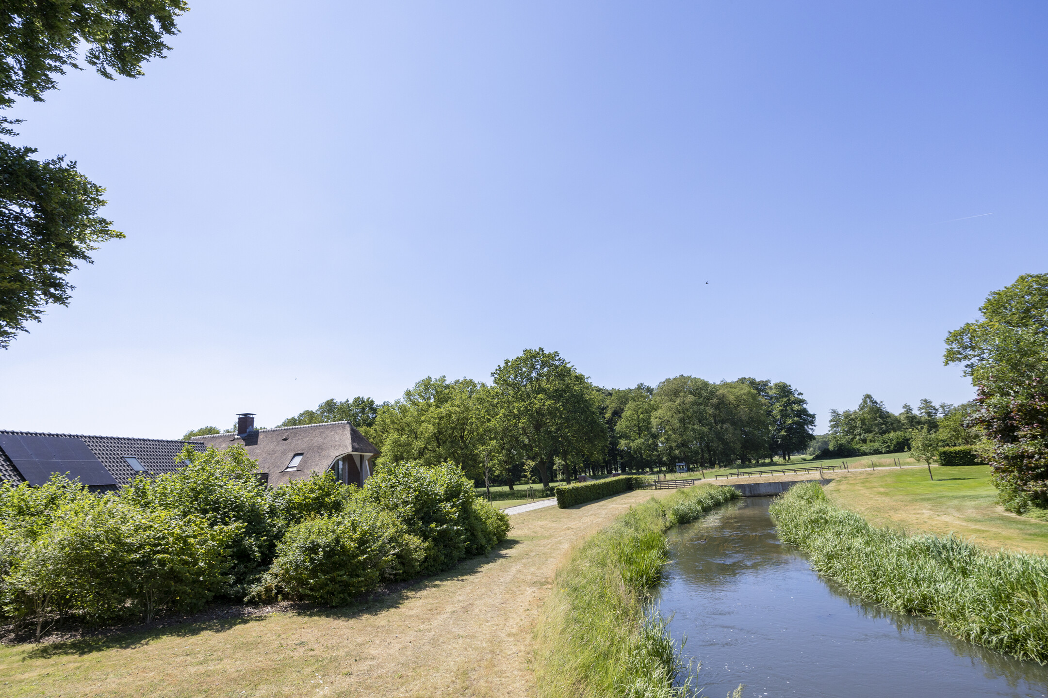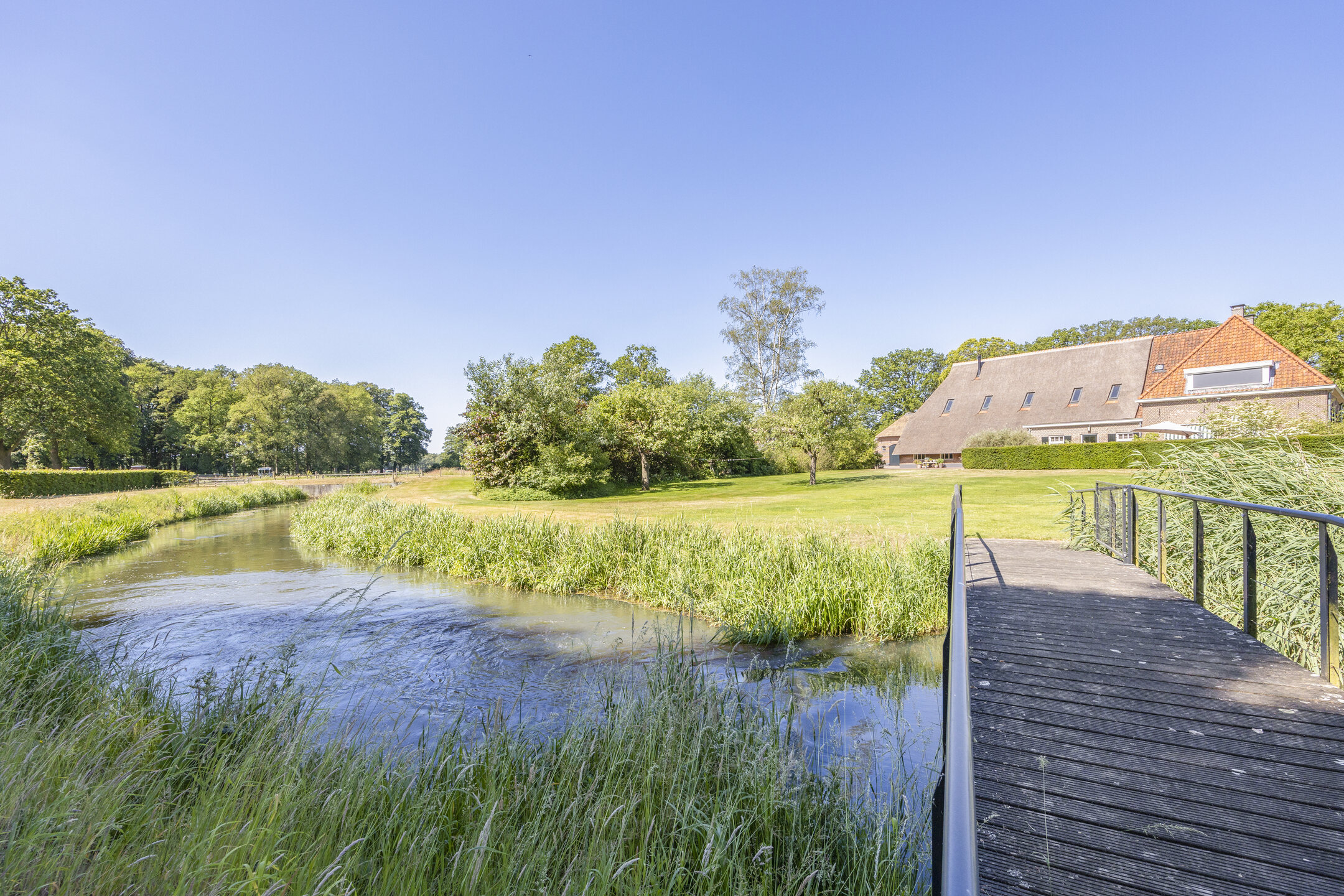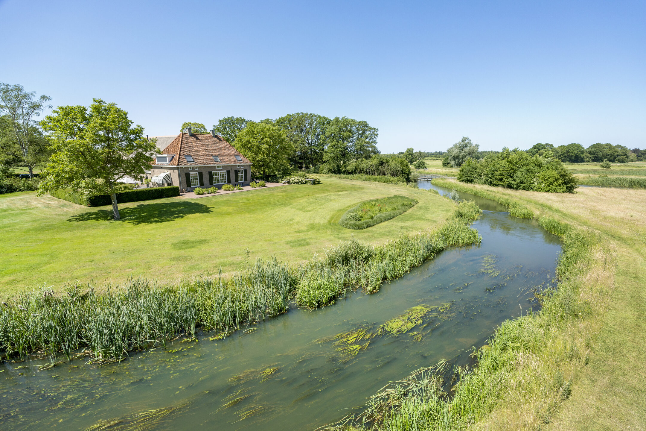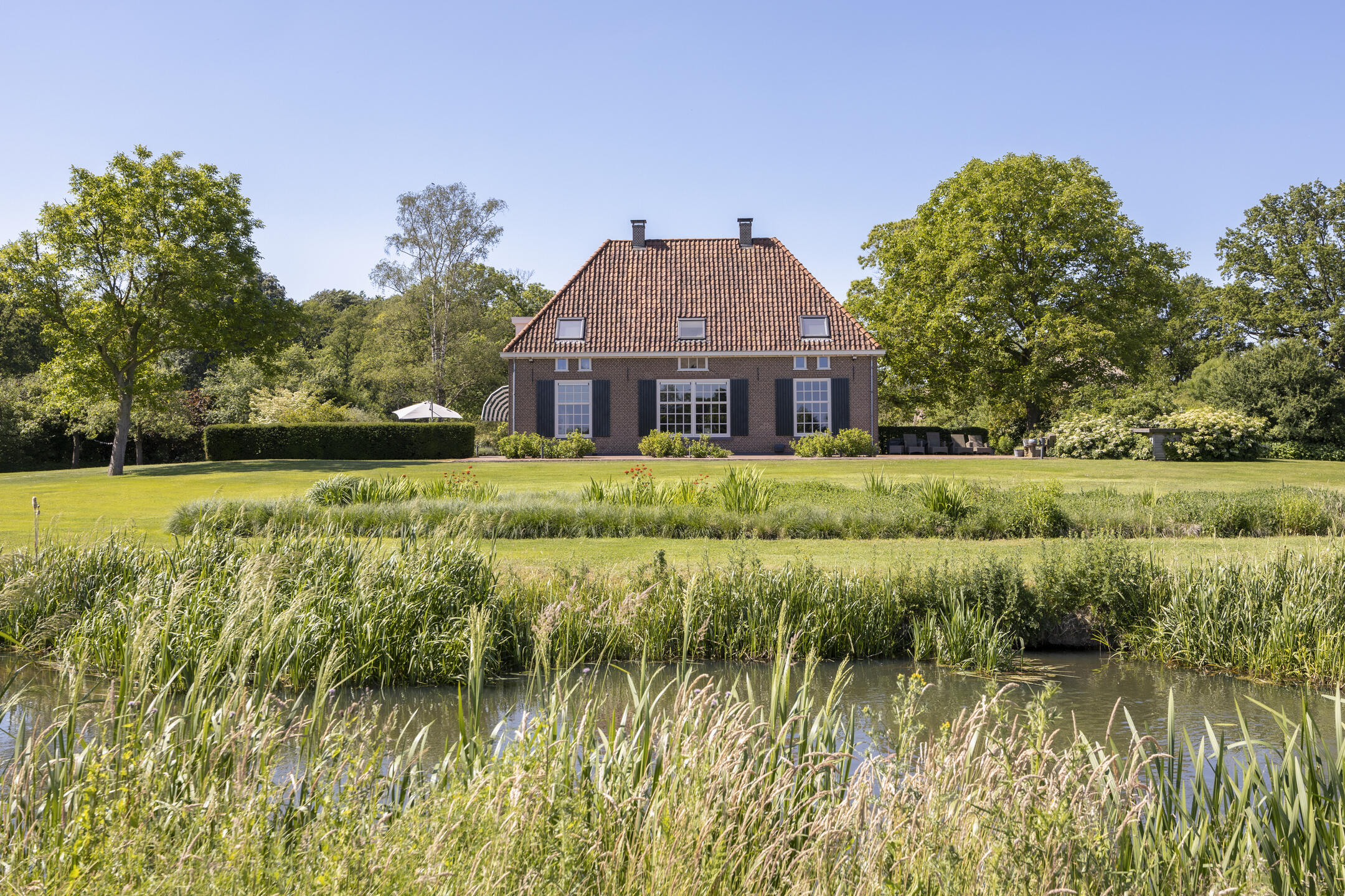 When an agency like Eelerwoude gets involved in landscaping, you just know it's going to be okay. And so it did. The gardens around the house are once again bordered by the moat, through which the crystal-clear water of the Berkel gaily splashes. From the house, living is focused on the Berkel and the village beyond. On the right side you have a view of the beech forest, where you can go via the little bridge to take a walk; between the trees is a path.