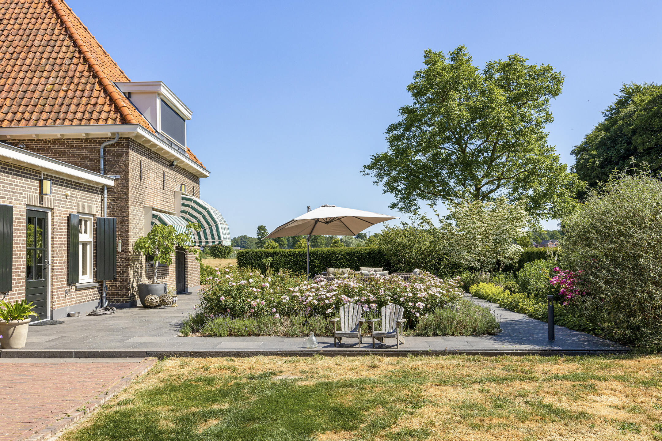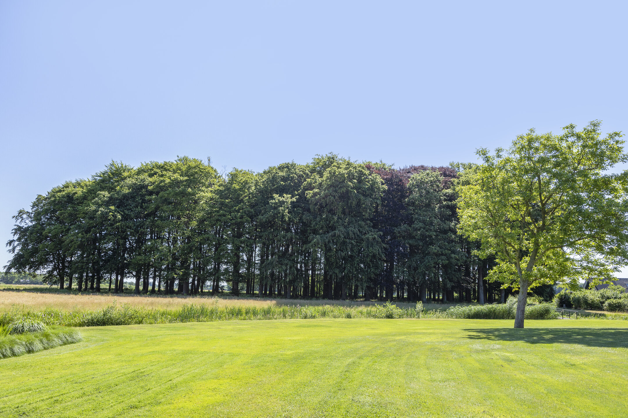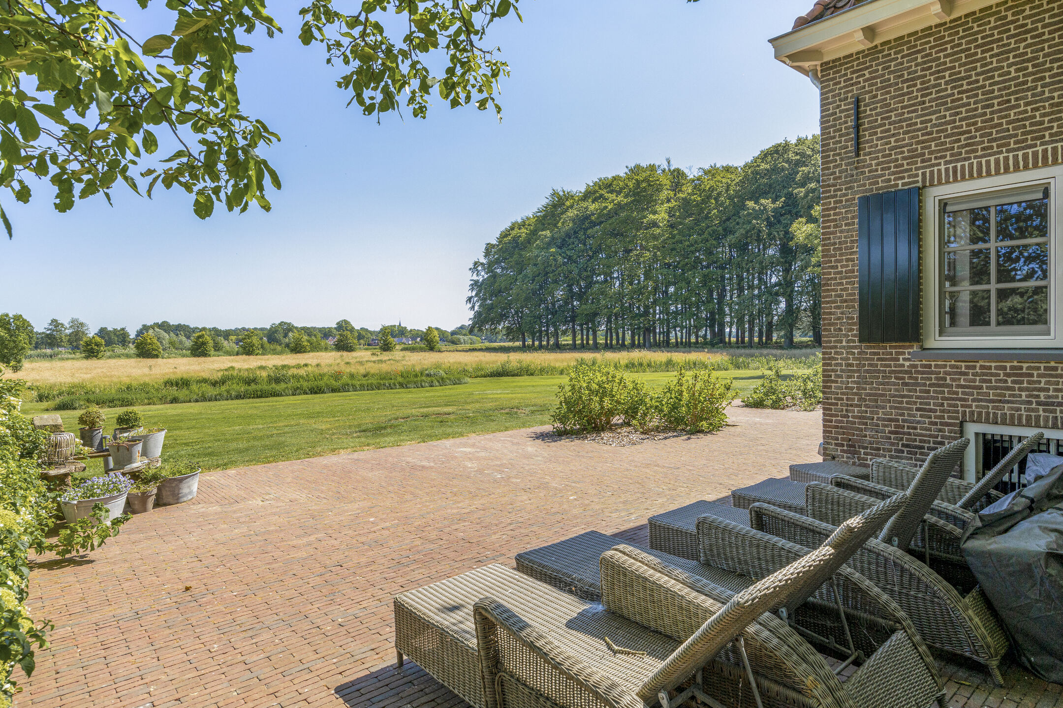 When an agency like Eelerwoude gets involved in landscaping, you just know it's going to be okay. And so it did. The gardens around the house are once again bordered by the moat, through which the crystal-clear water of the Berkel gaily splashes. From the house, living is focused on the Berkel and the village beyond. On the right side you have a view of the beech forest, where you can go via the little bridge to take a walk; between the trees is a path.