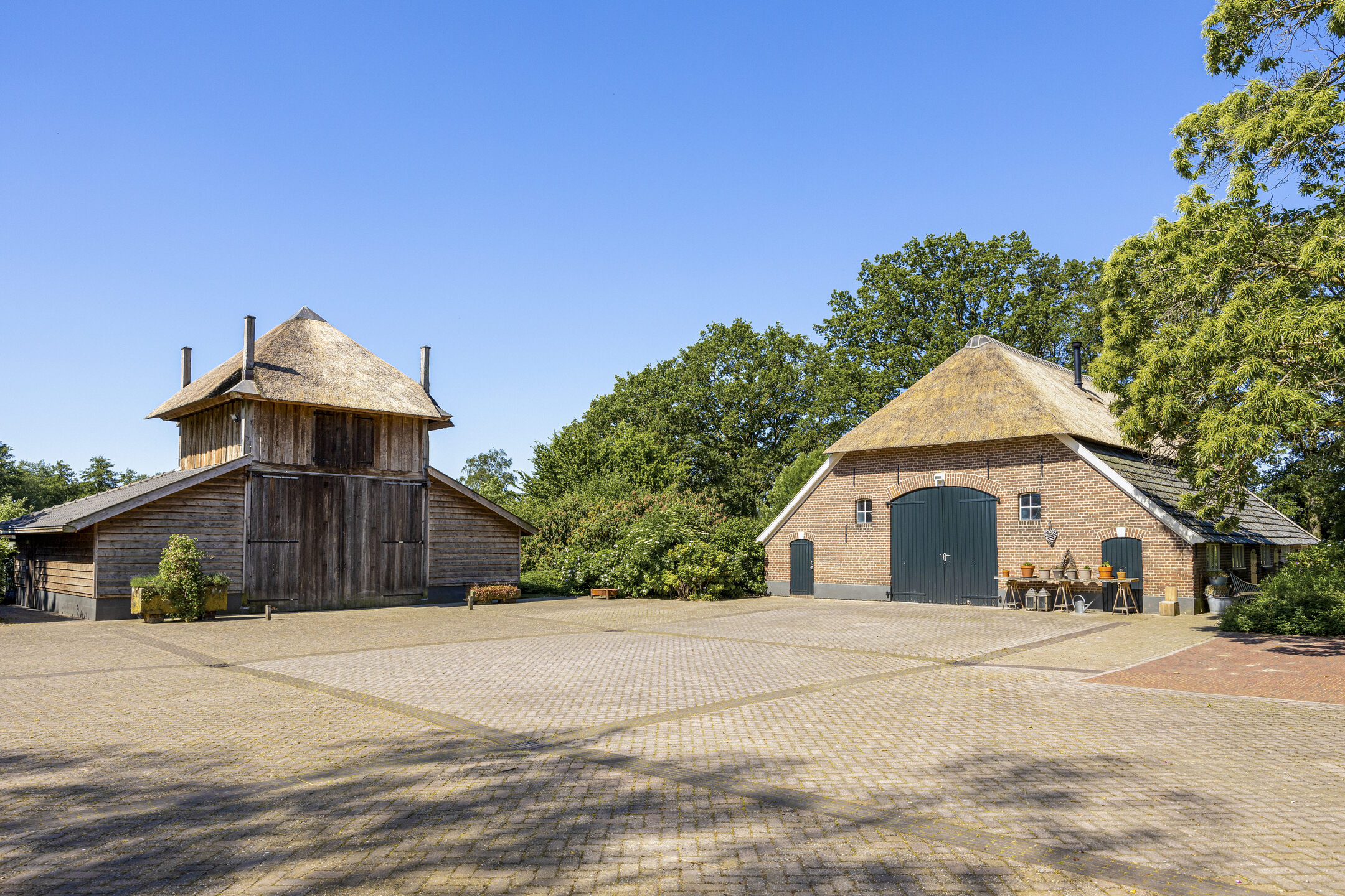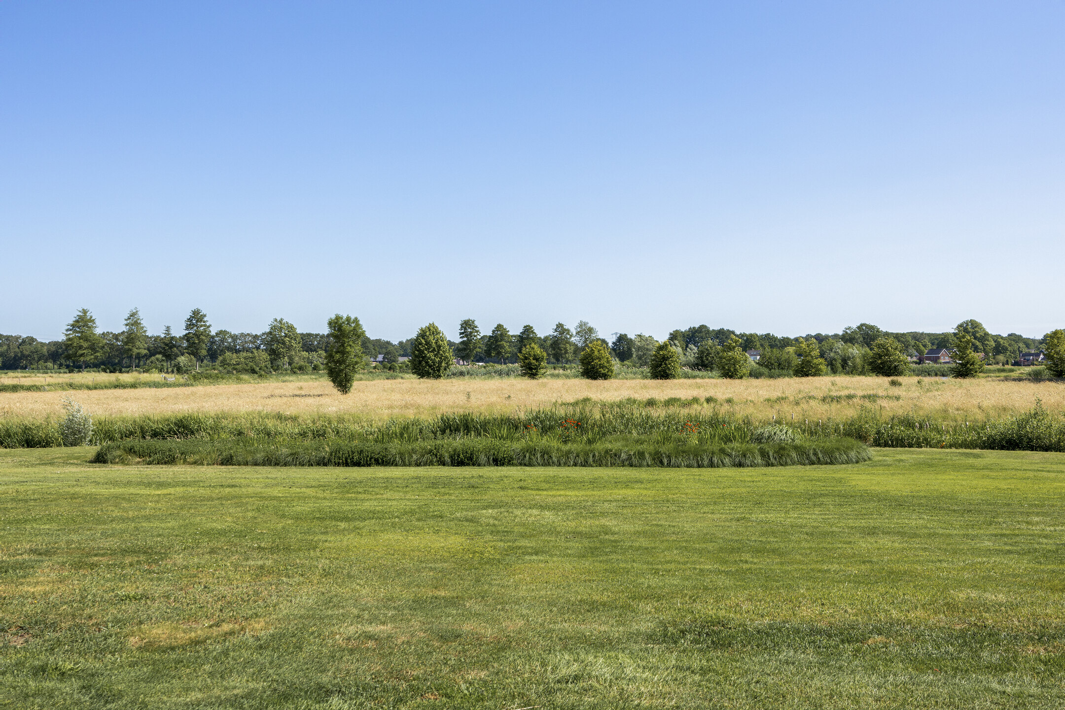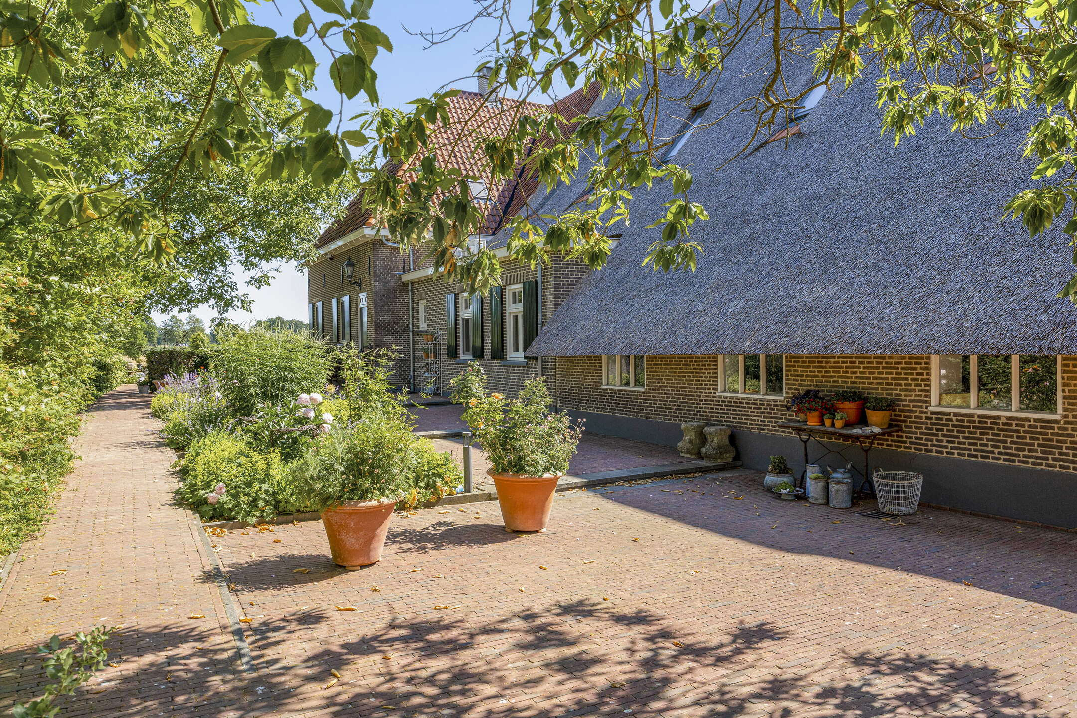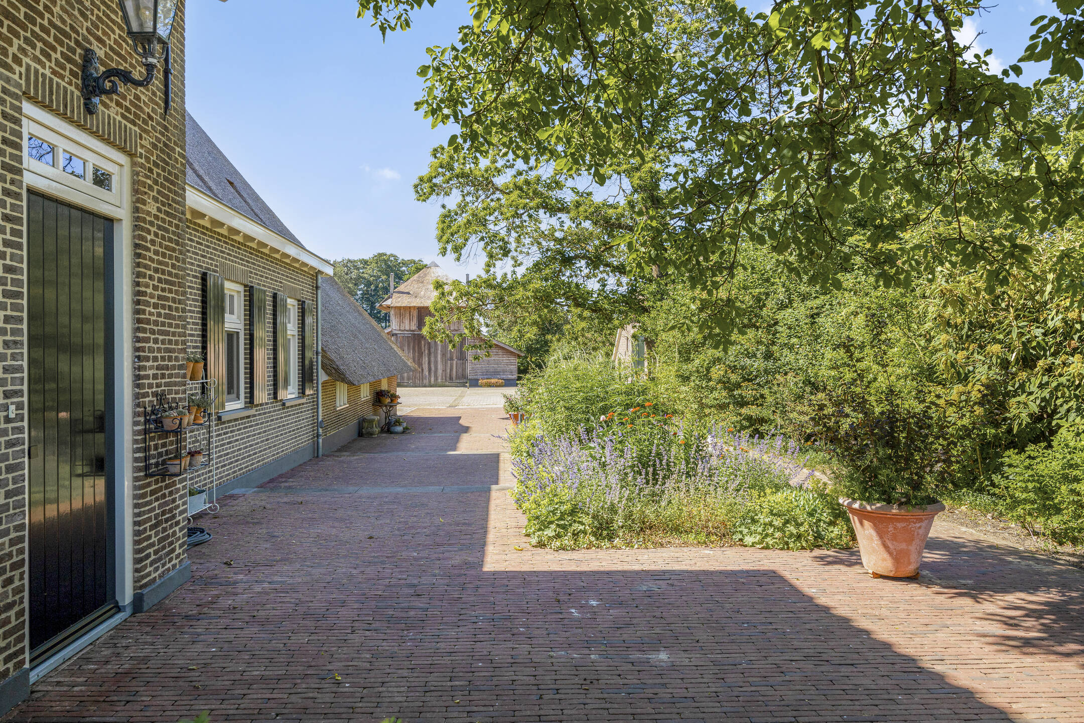 When an agency like Eelerwoude gets involved in landscaping, you just know it's going to be okay. And so it did. The gardens around the house are once again bordered by the moat, through which the crystal-clear water of the Berkel gaily splashes. From the house, living is focused on the Berkel and the village beyond. On the right side you have a view of the beech forest, where you can go via the little bridge to take a walk; between the trees is a path.