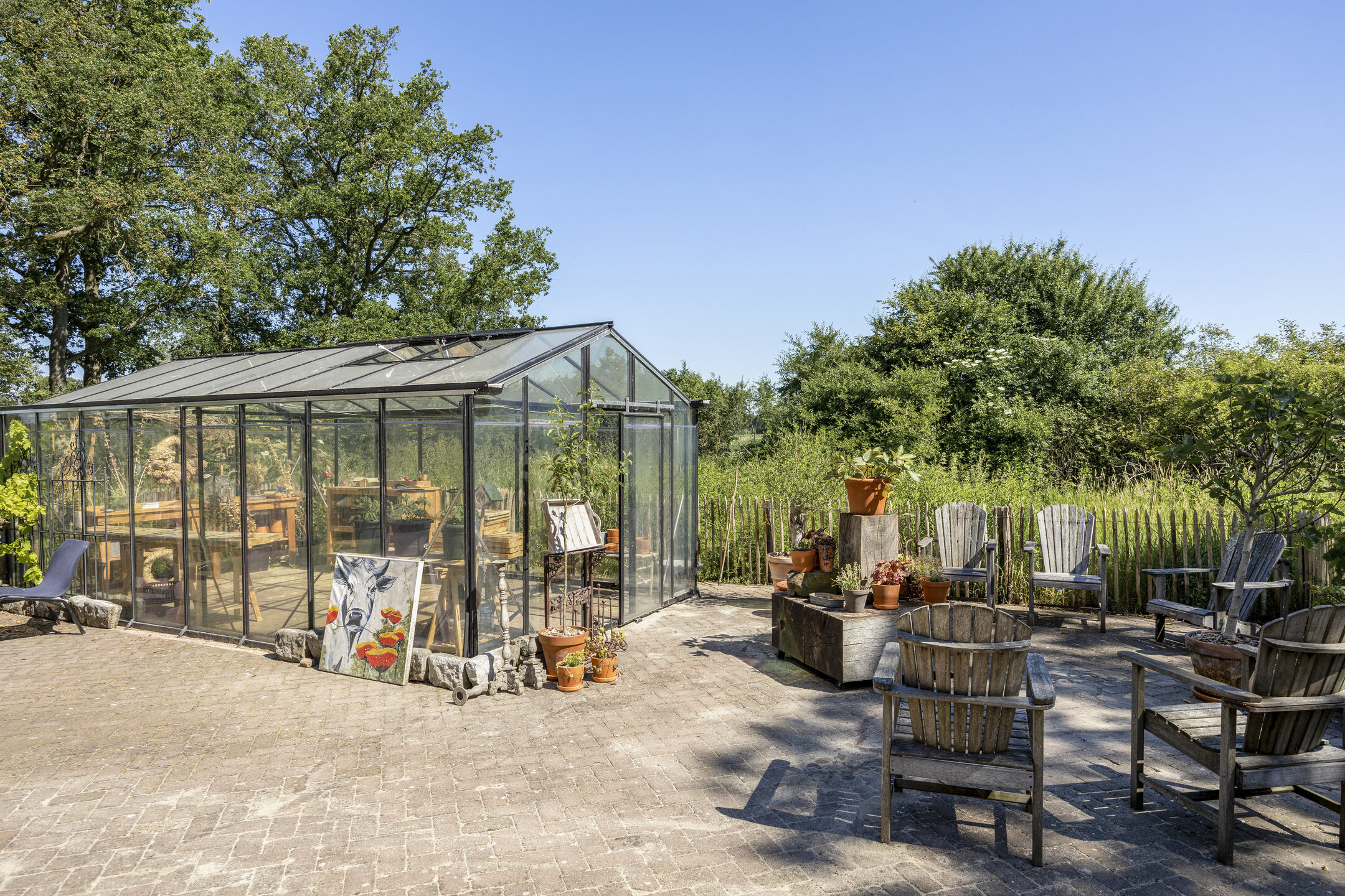 In front of the barn is a large glass greenhouse in the starting blocks for your tomatoes, citrus fruits, potting table and cuttings. The vegetable garden, with its chestnut fences, offers more than enough space to be self-sufficient.