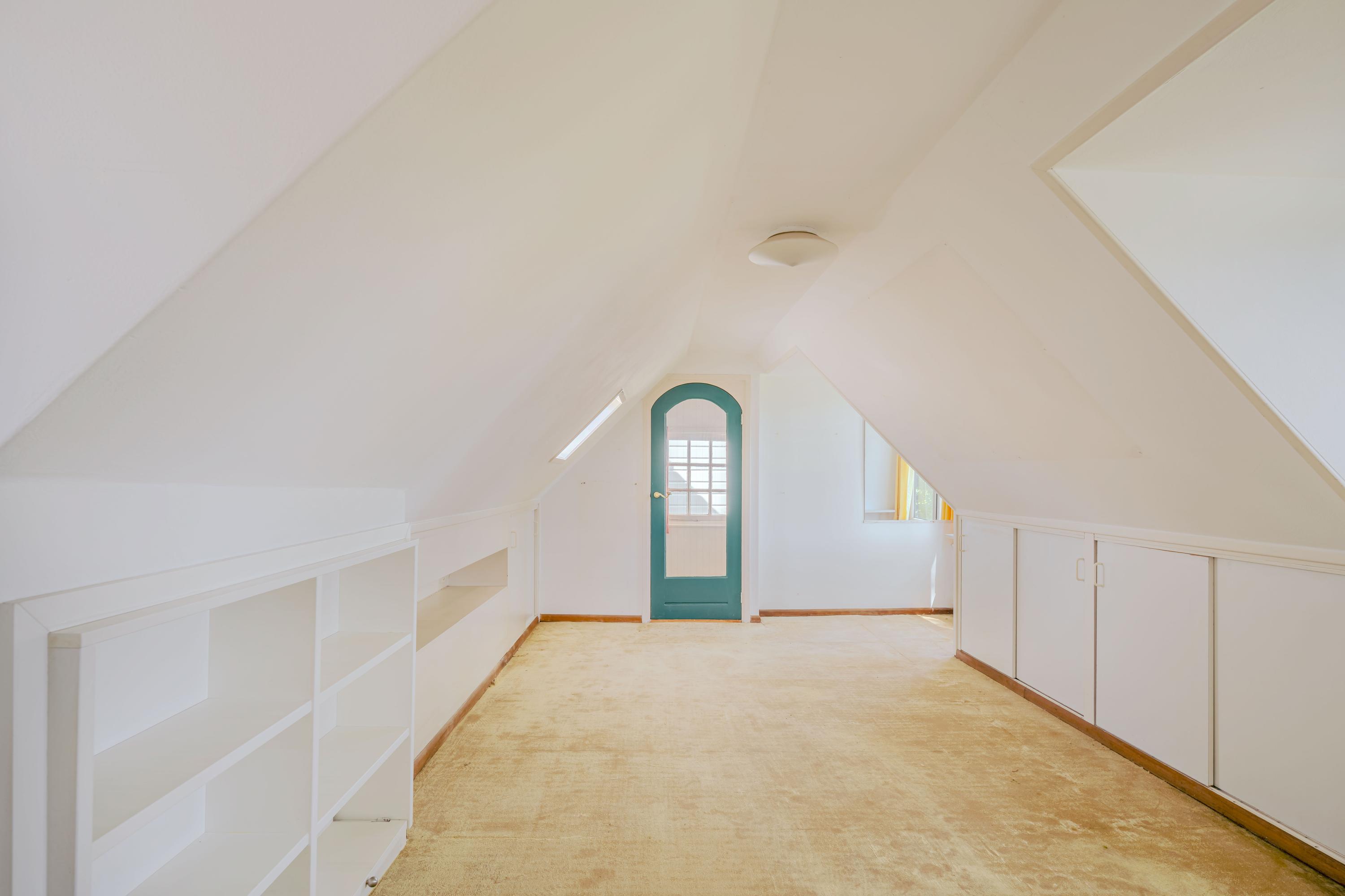 A wooden spiral staircase leads to the first floor, where a landing provides access to a spacious bedroom occupying the entire level. The room offers beautiful views over the River Amstel and the surrounding landscape. Practical storage spaces have been created beneath the sloping roofs. At the front, a window alcove provides a seating area with a view of the river.