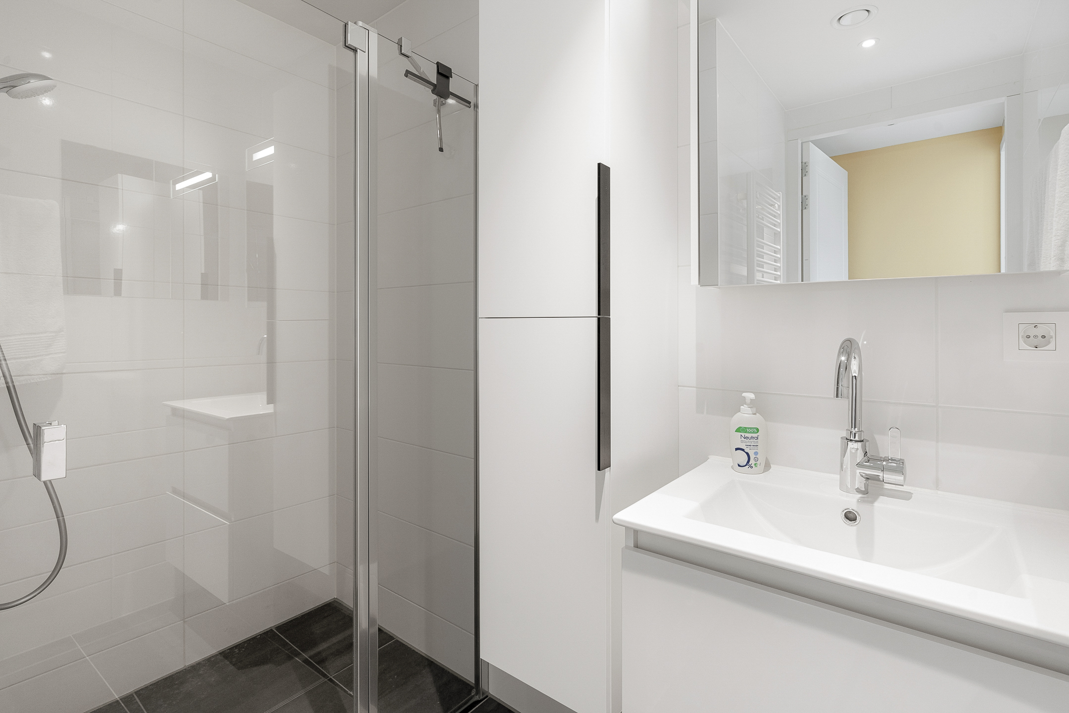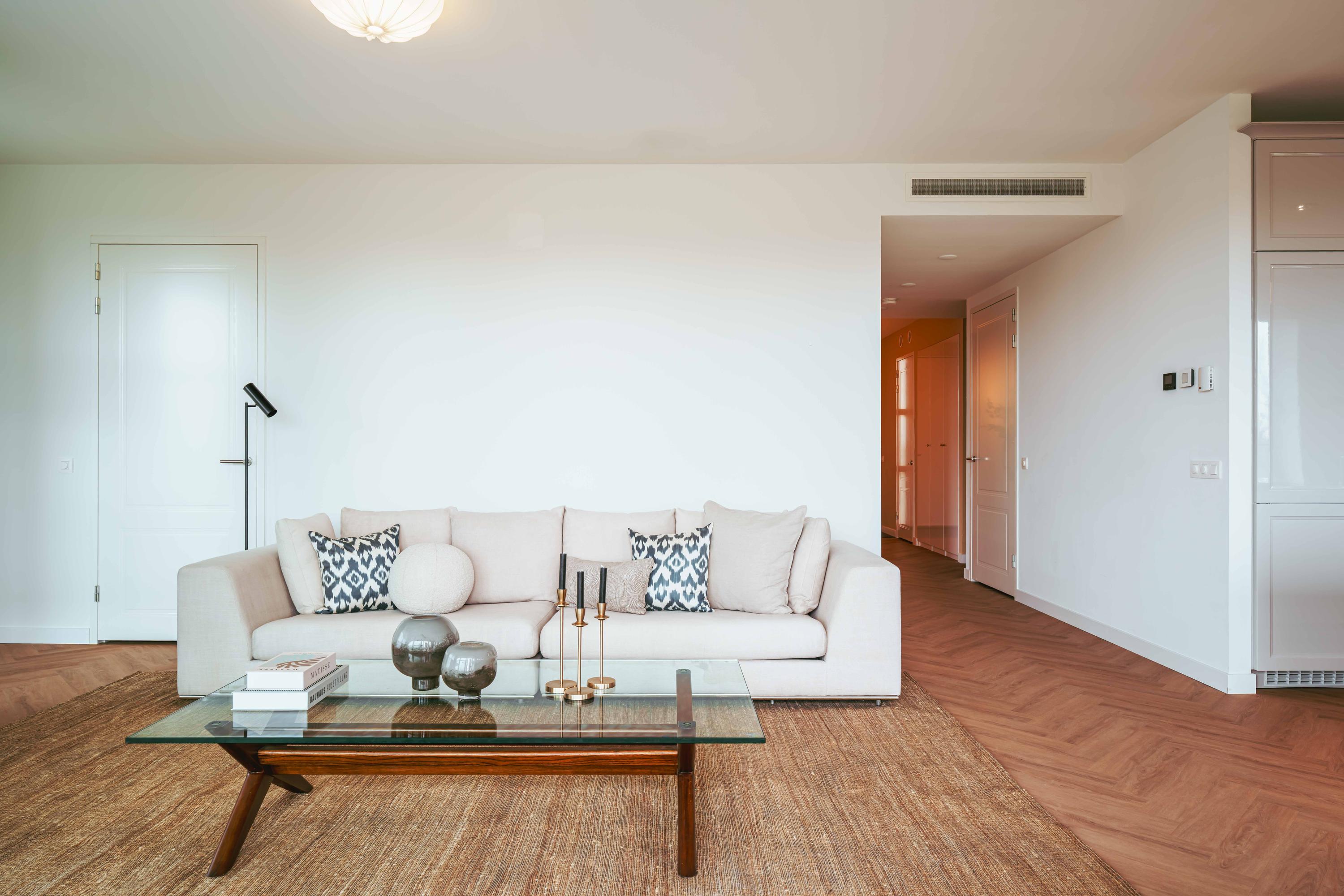 The apartment is equipped with modern technologies such as a Heat Recovery Ventilation (HRV) and Heat Pump system. Enjoy the comfort of underfloor heating and cooling throughout the property. Furthermore, the living room also features an air conditioning unit.