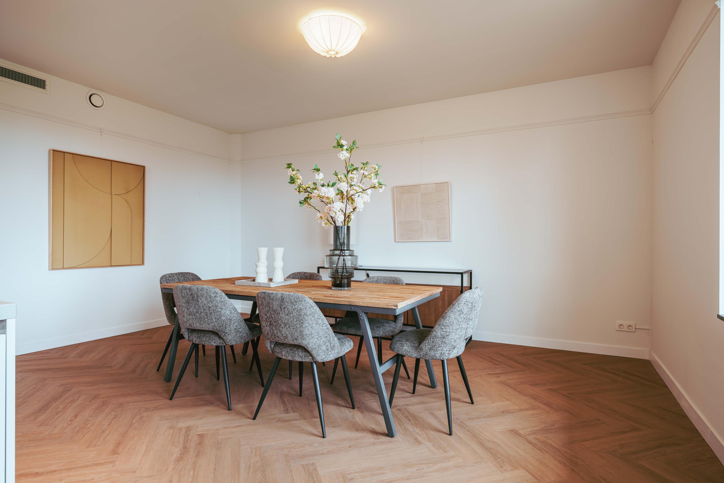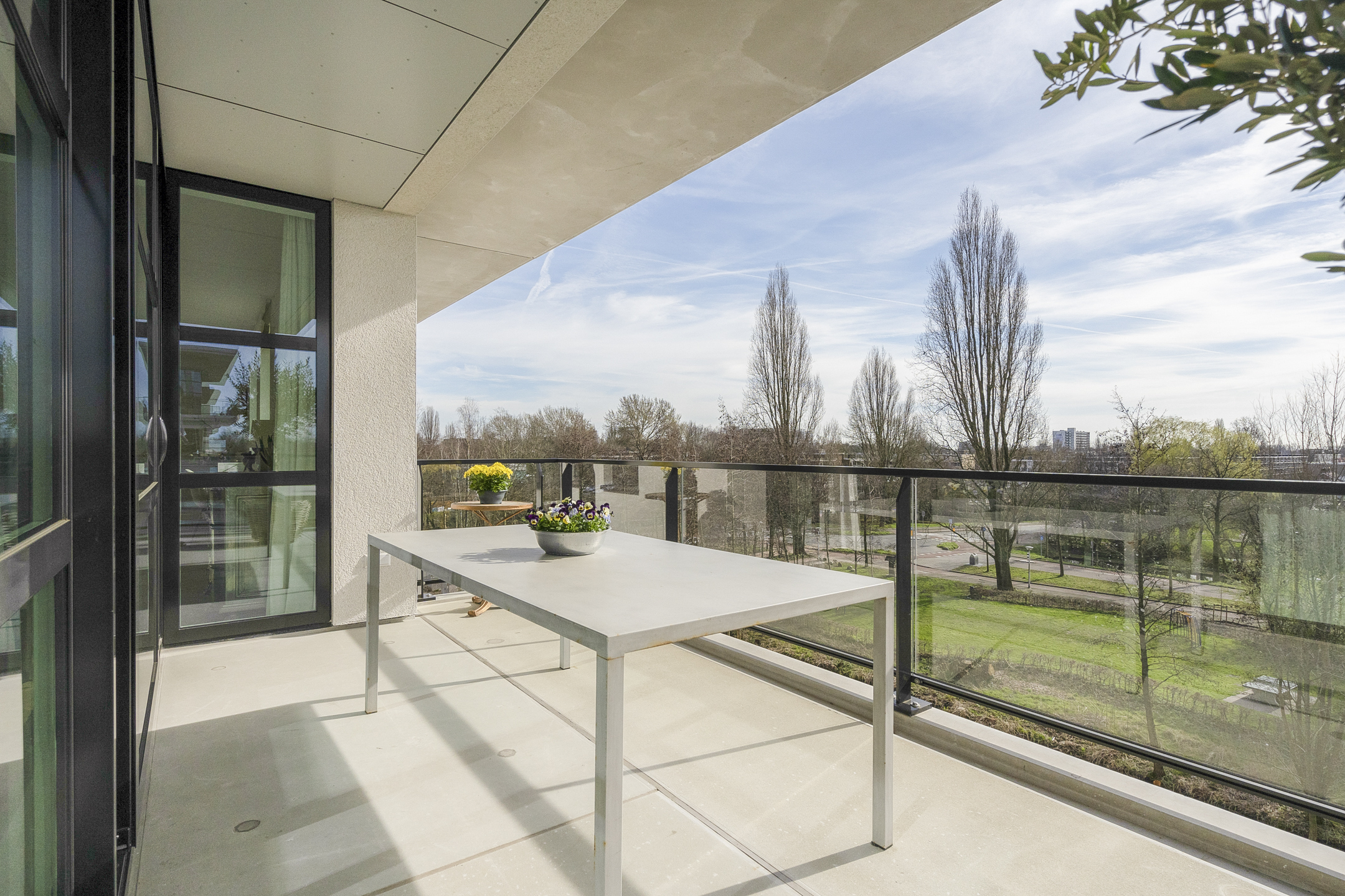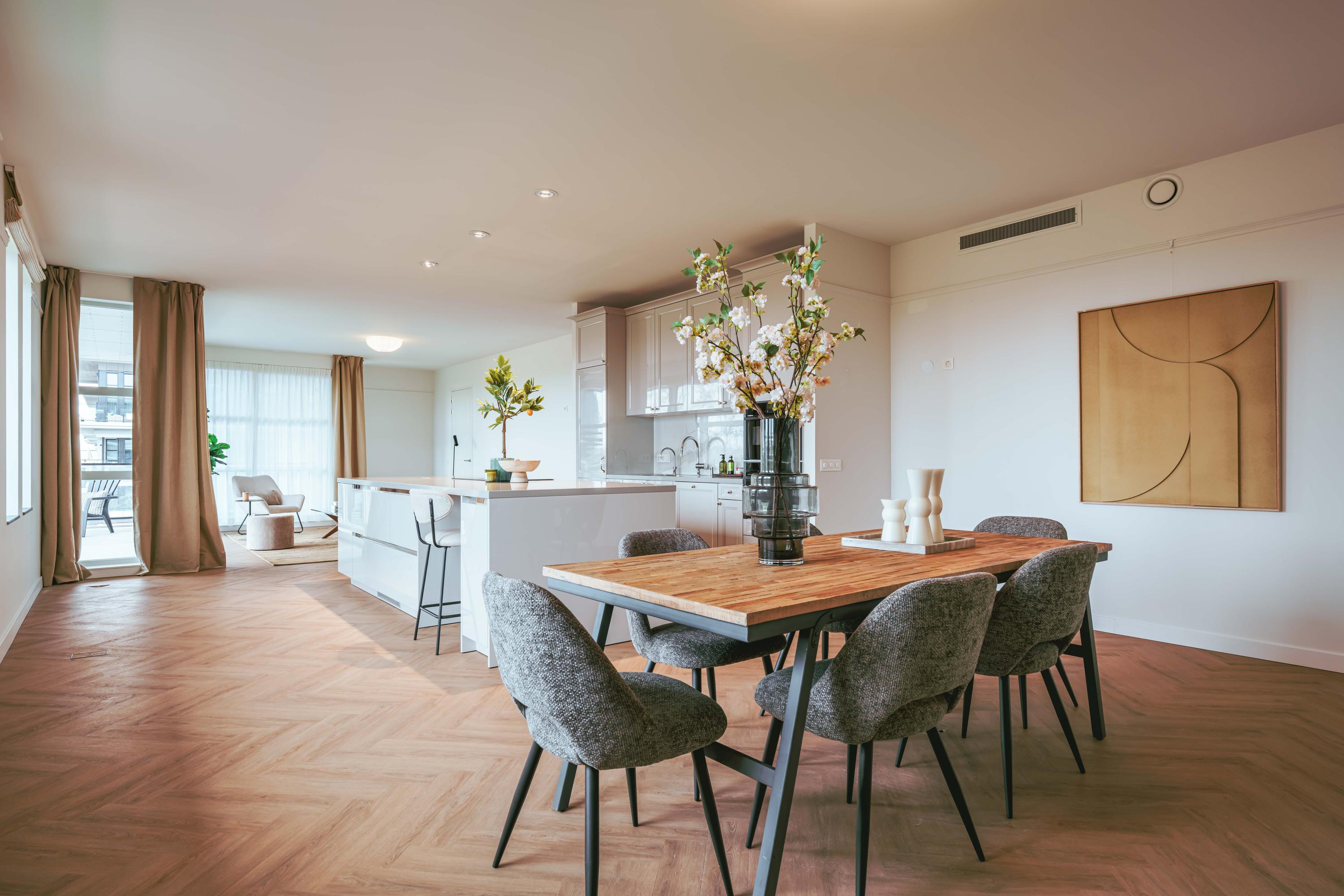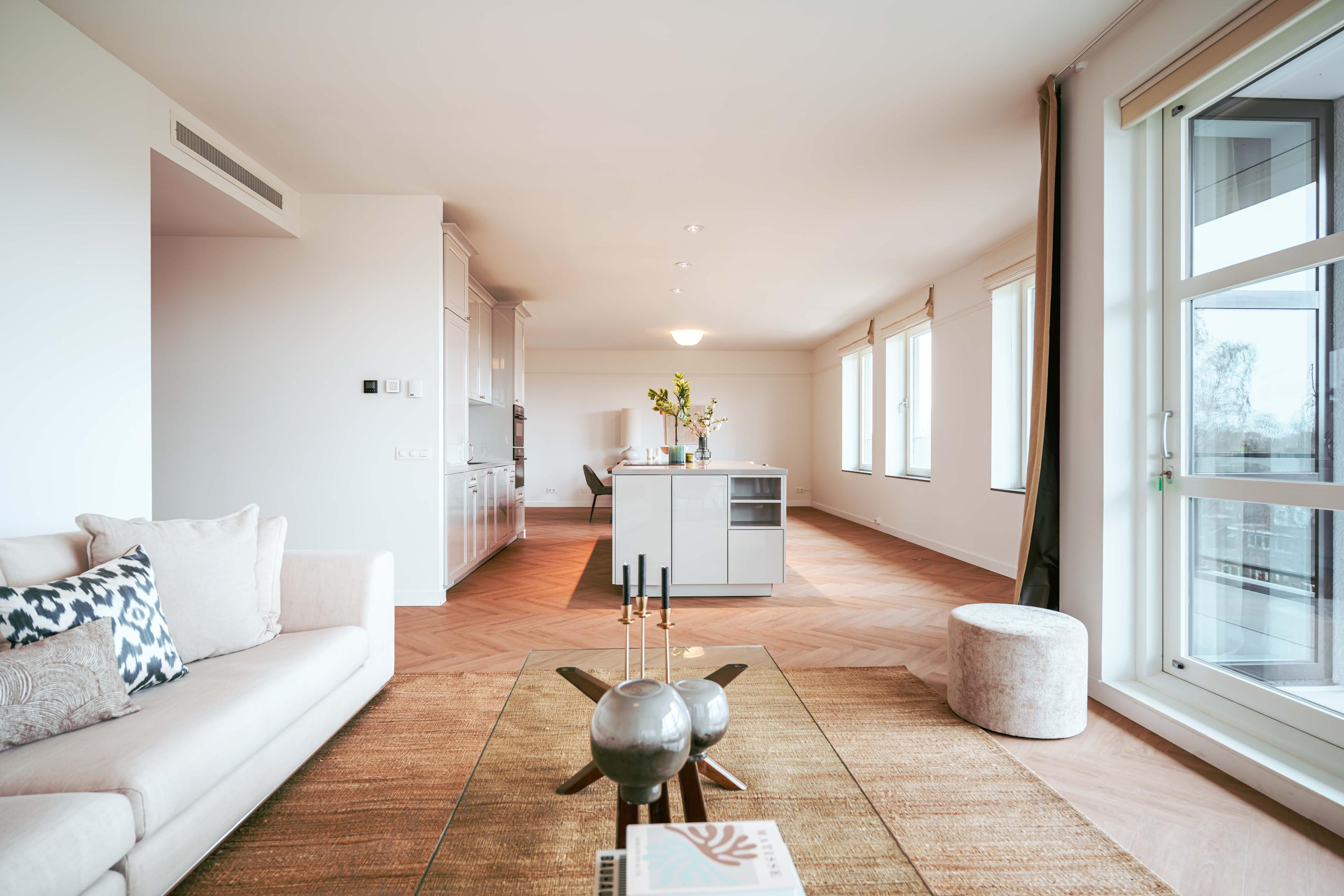 The beautiful, large living room receives abundant natural light through its many windows. The Siematic kitchen island is a true centerpiece, equipped with various built-in appliances including an induction hob with integrated extraction, oven, combination oven-microwave, Quooker, and a large refrigerator. There is also a separate pantry with space for a wine climate cabinet and freezer. The sunny balcony faces southwest, providing a delightful spot to relax and enjoy unobstructed views.