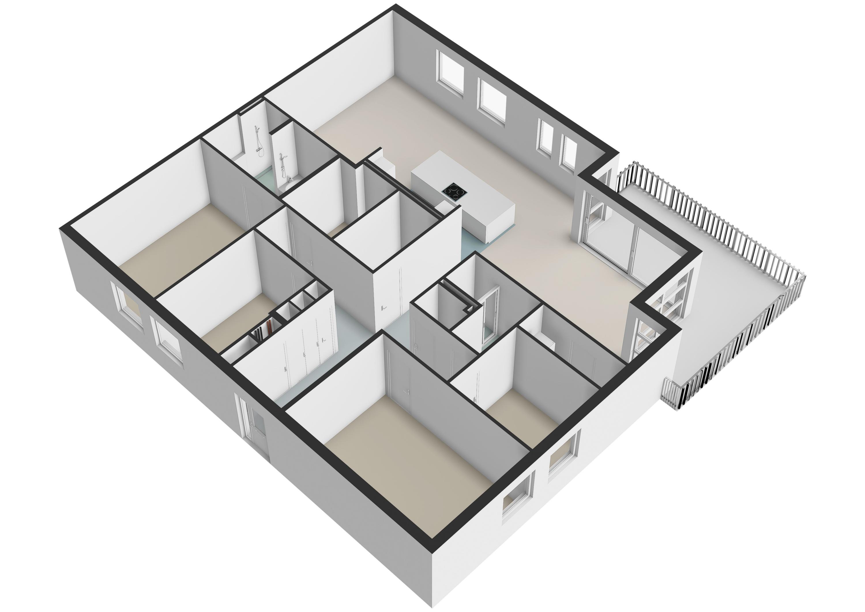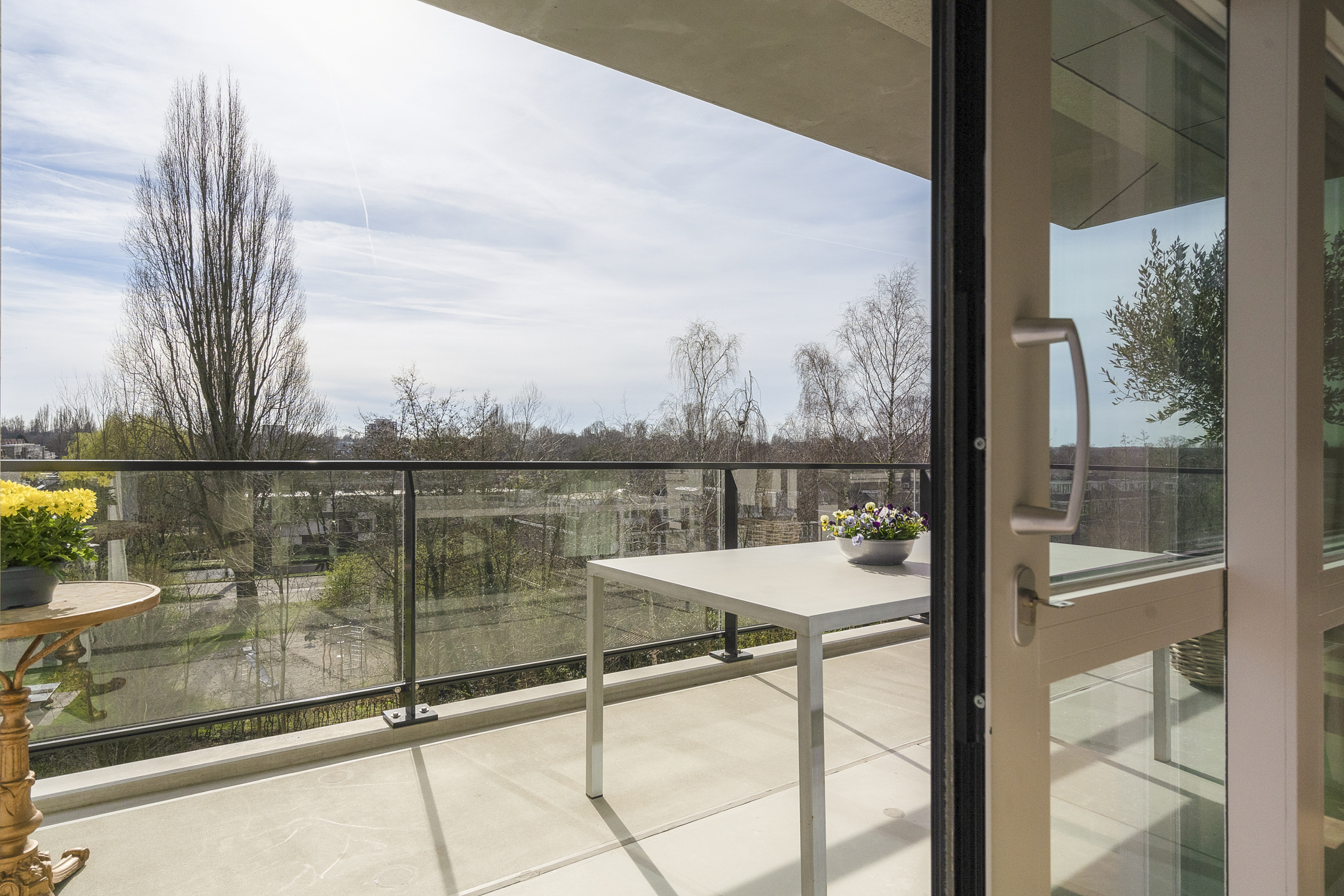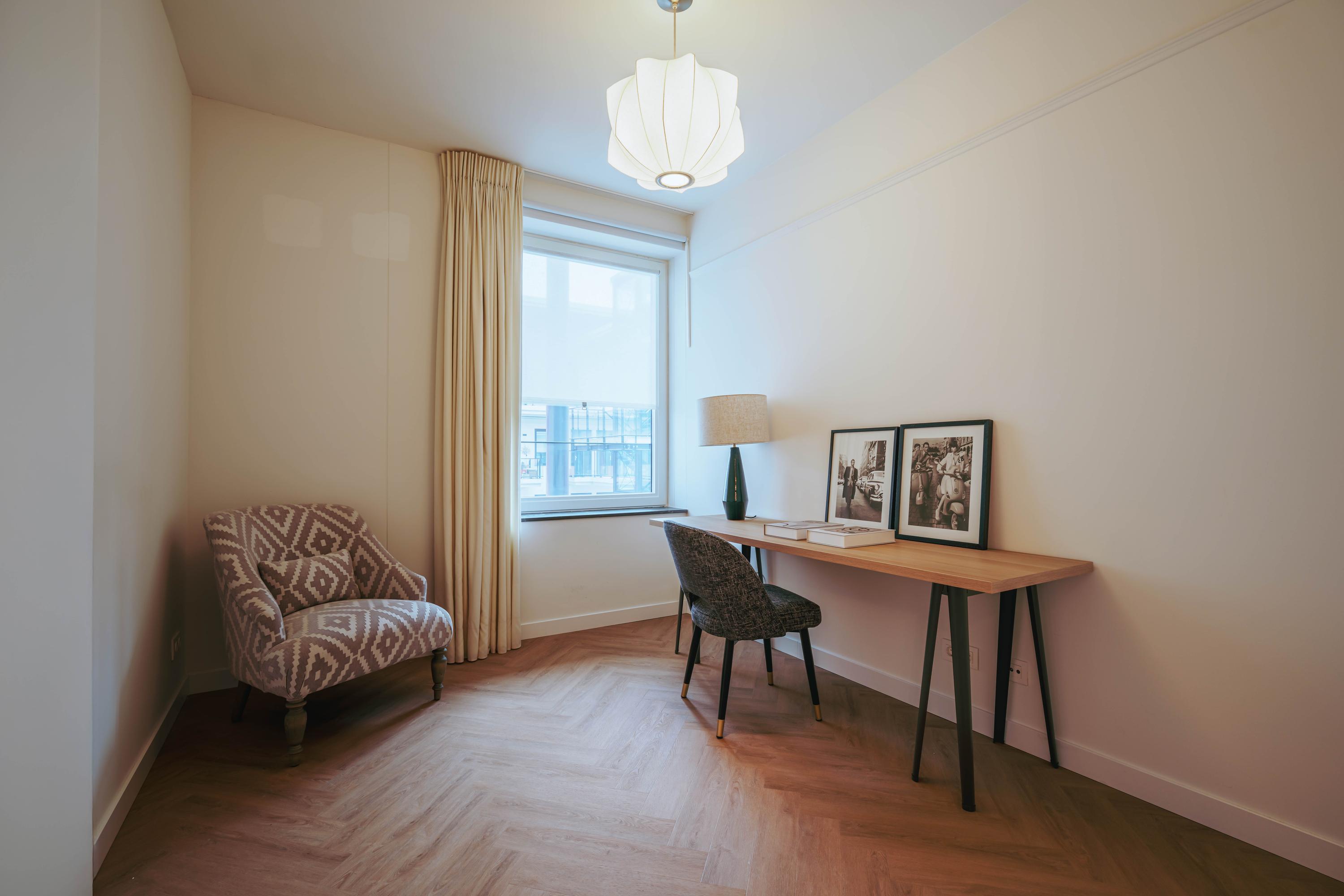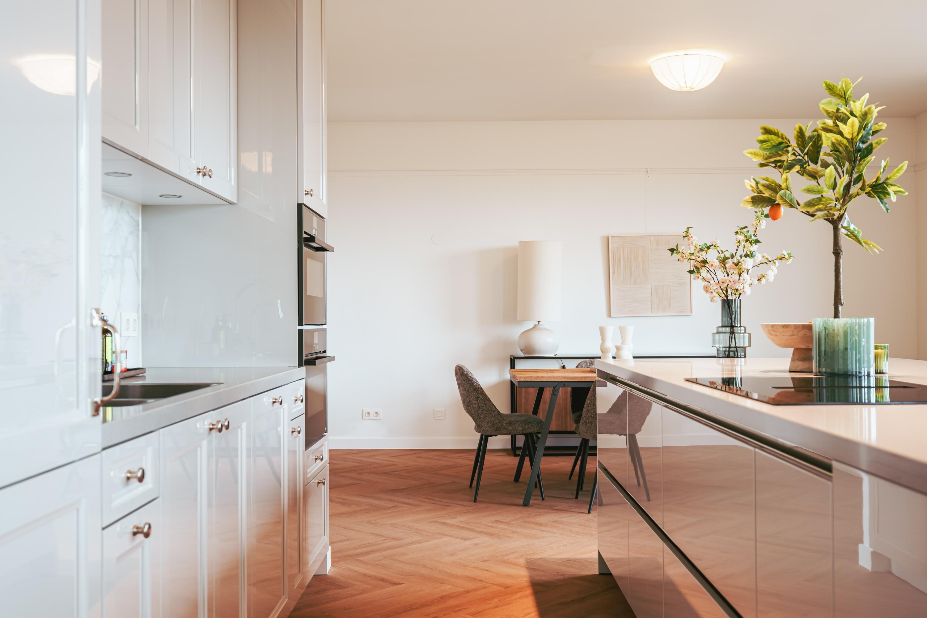 The beautiful, large living room receives abundant natural light through its many windows. The Siematic kitchen island is a true centerpiece, equipped with various built-in appliances including an induction hob with integrated extraction, oven, combination oven-microwave, Quooker, and a large refrigerator. There is also a separate pantry with space for a wine climate cabinet and freezer. The sunny balcony faces southwest, providing a delightful spot to relax and enjoy unobstructed views.