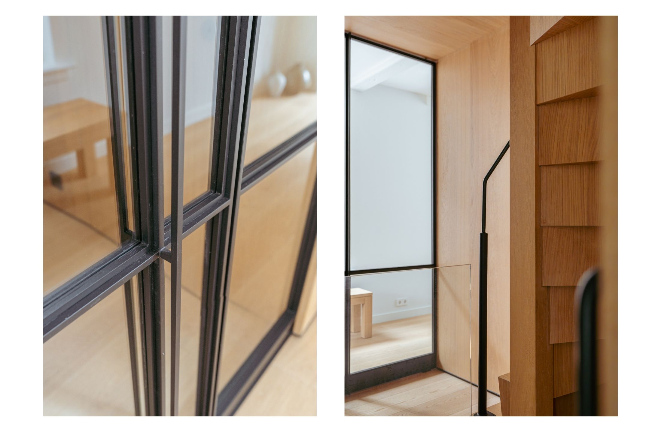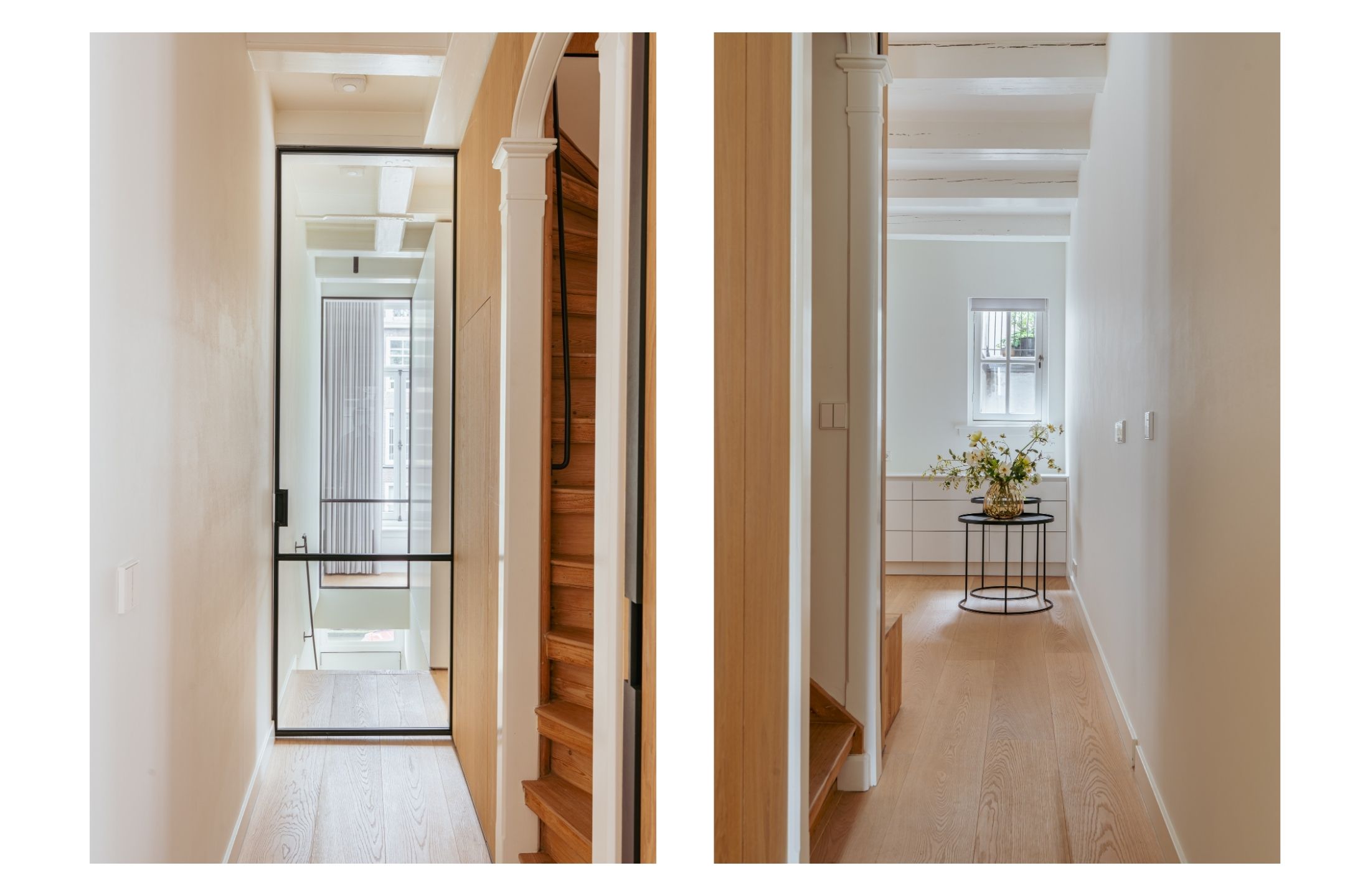 A tidy landing with built-in storage leads to two bedrooms. This floor features a beautiful wooden floor and premium finishes. At the front is a spacious bedroom with a custom-made built-in wardrobe that seamlessly integrates into the design. Large windows flood the space with natural light and offer a stunning view of the canal and historic facades. The second bedroom at the rear also includes built-in wardrobes. Centrally located on this floor is the modern bathroom, complete with a walk-in shower, sleek vanity, and stylish toilet — all finished to a high and timeless standard. Elegant steel-framed doors close off the bedrooms, combining functionality and design in harmony with the home’s aesthetic.