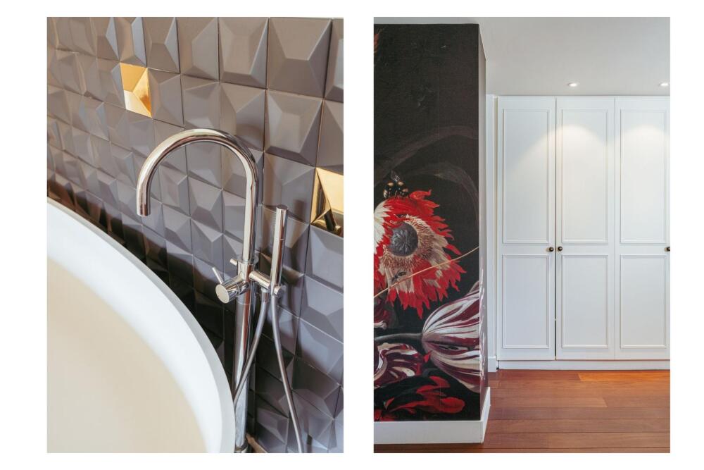 From the hallway—equipped with custom-made wardrobe cabinets—you enter the sunlit living room, complete with a wood-burning stove and an original natural stone mantelpiece. At the front of the home is a cozy study area and access to a wide, sunny south-facing balcony. Centrally located is a custom-built intermediate space with climate-controlled wine fridge, also ideal as a library or reading nook. This connects the living and dining areas via beautiful original sliding doors.