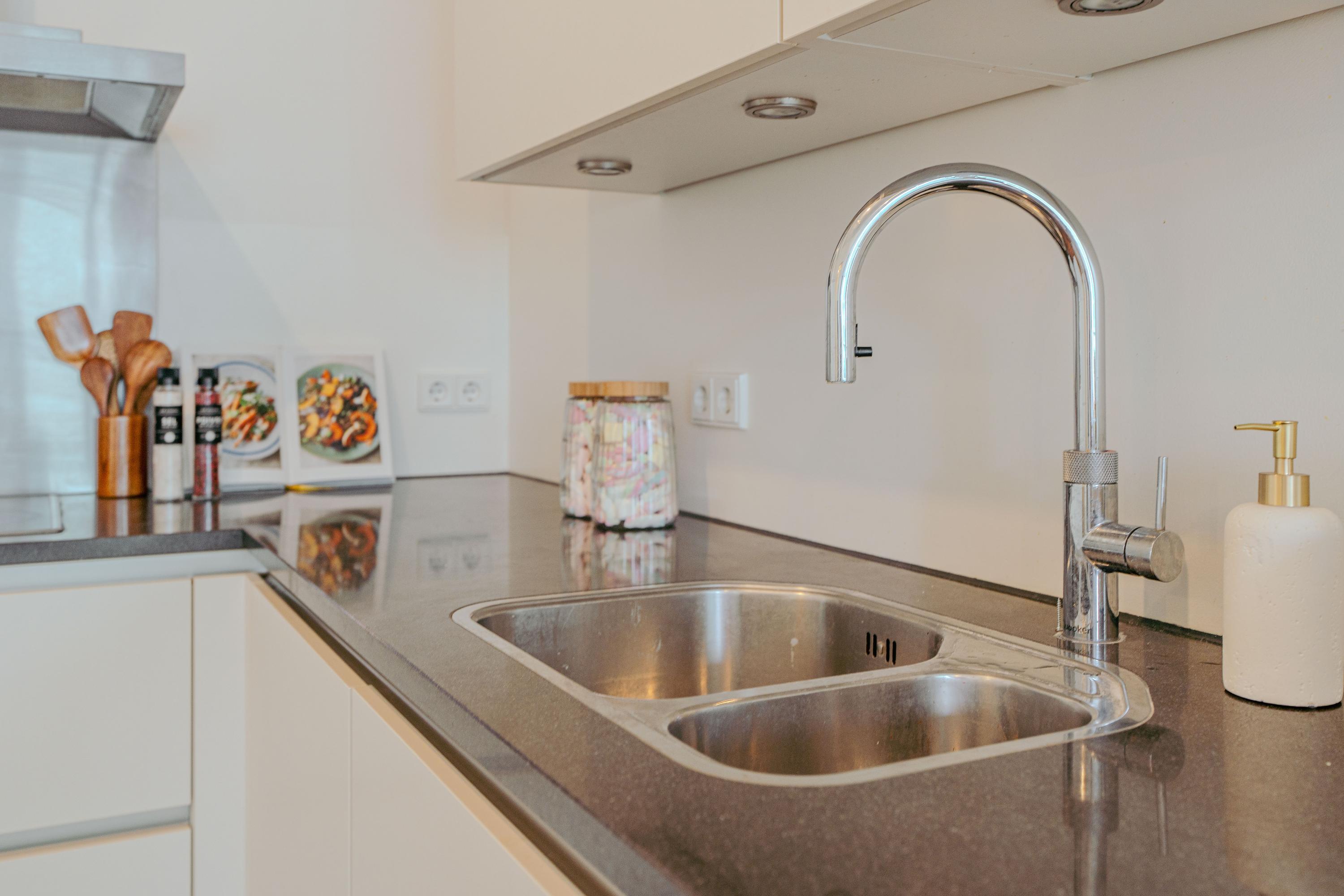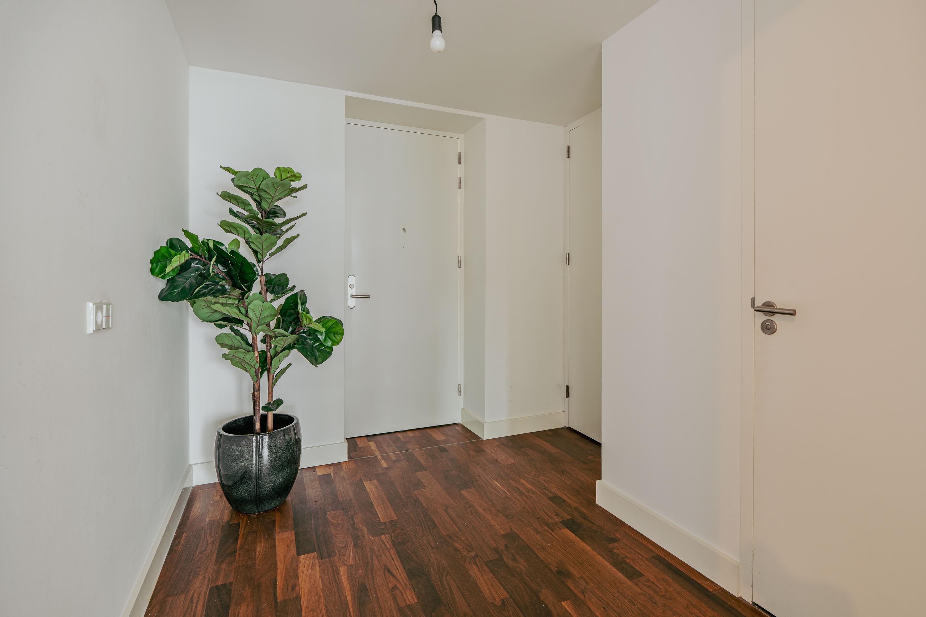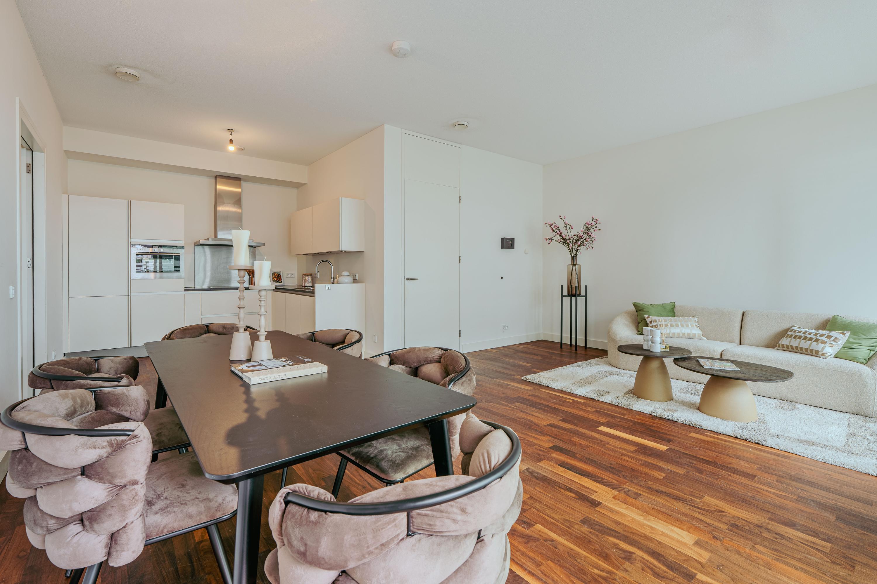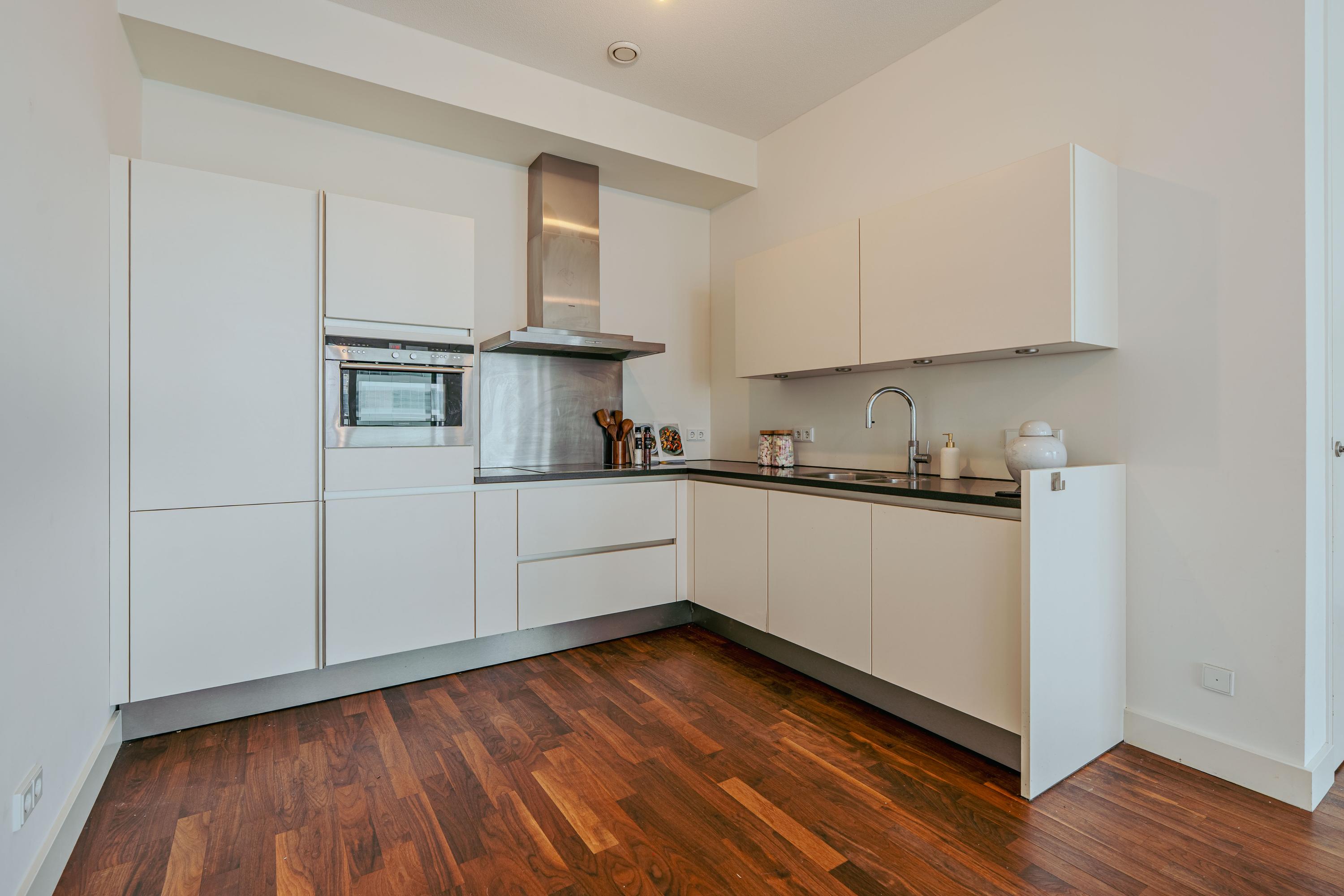 Upon entering the 8th floor, you step into a spacious hallway with a meter cupboard, separate toilet, and room for a wardrobe. From here, you enter the bright and airy living area, where the views immediately catch your eye, creating a sense of openness and calm. At the front, sliding glass doors give access to the generous balcony that spans the full width of the apartment — an ideal spot to relax, enjoy breakfast, or take in the view. The open-plan kitchen is situated at the rear and is equipped with modern built-in appliances, including a fridge, freezer, induction hob, Quooker, and dishwasher.