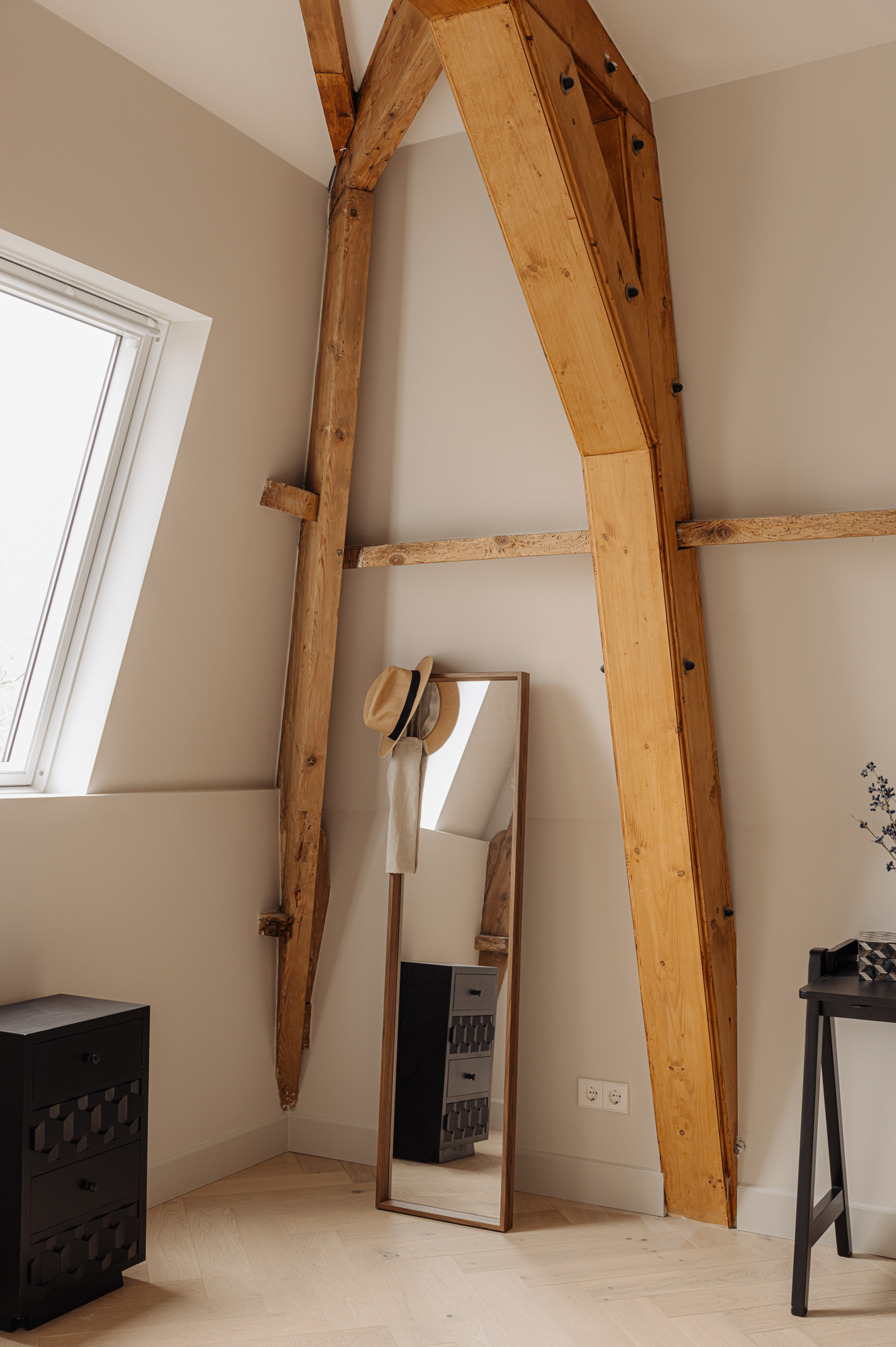 The two bedrooms at the back are flooded with natural light. They are so spacious that it would be easy to create a third bedroom. They have been beautifully finished with original wooden beams, which contribute to the apartment’s distinctive charm. The Master bedroom has its own en-suite bathroom with a double washbasin, a large bath and walk-in shower and a toilet. This bathroom is the epitome of comfort and luxury. The second bathroom is elegant too and has a double washbasin unit and a walk-in shower.