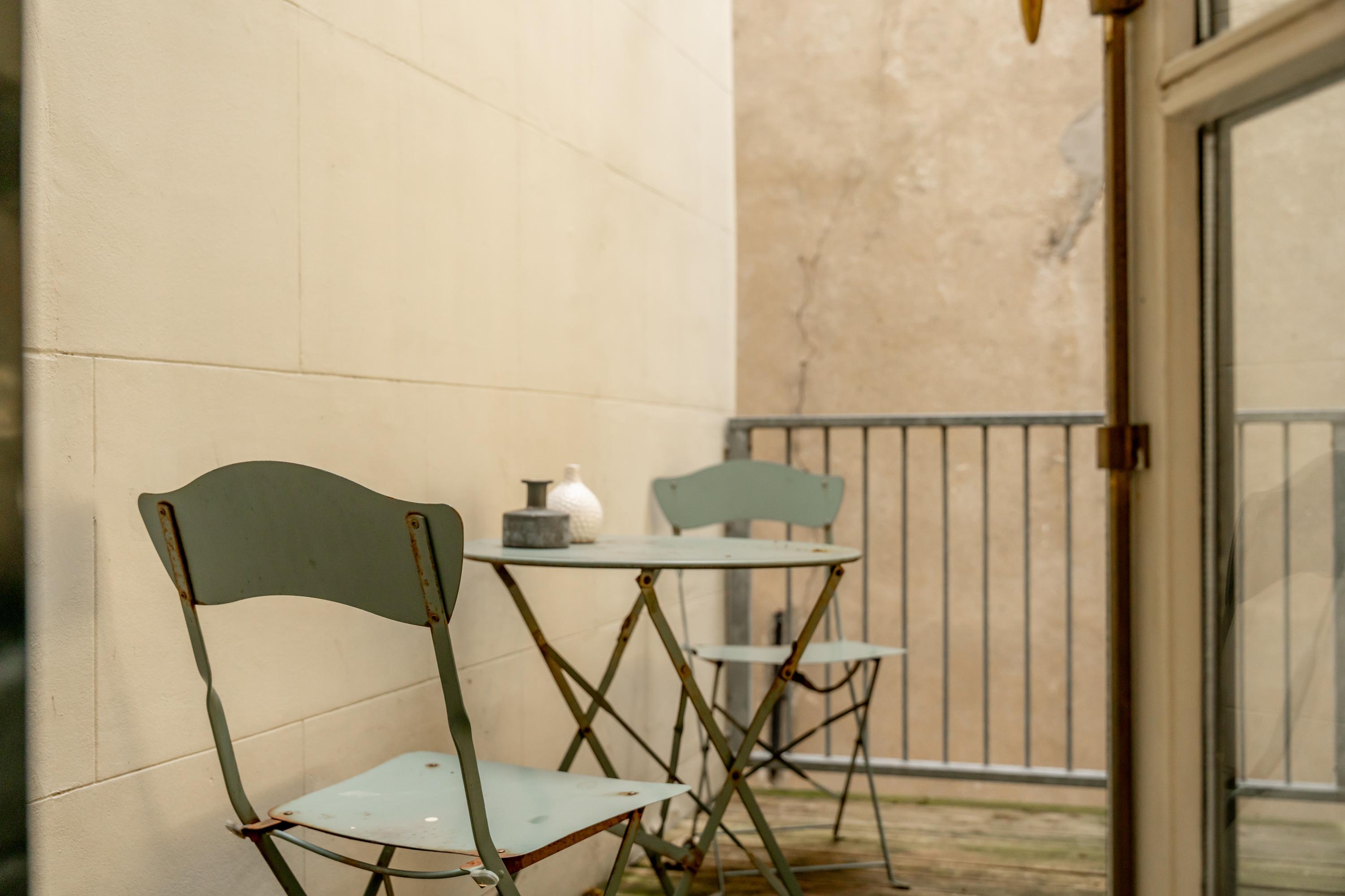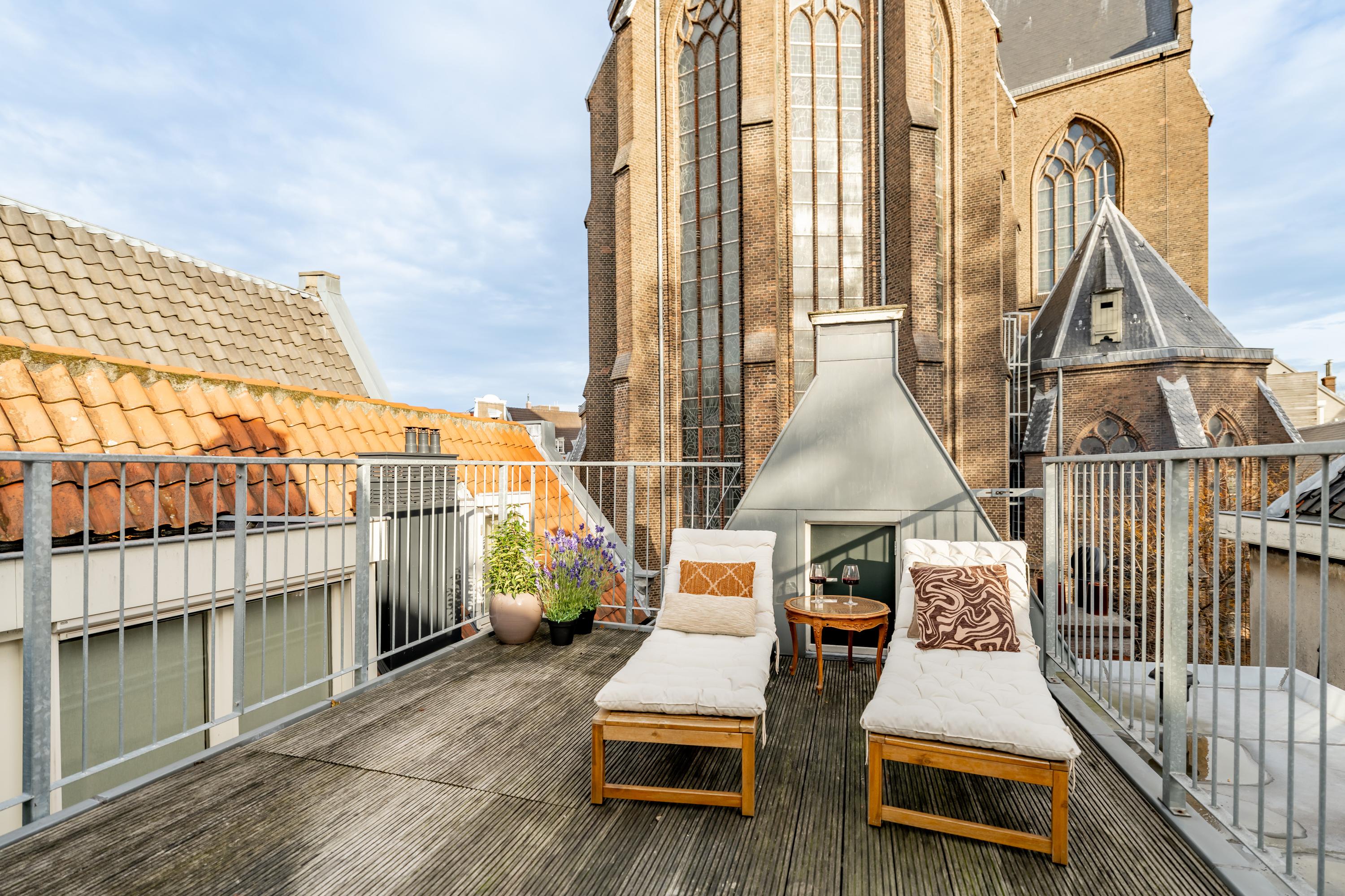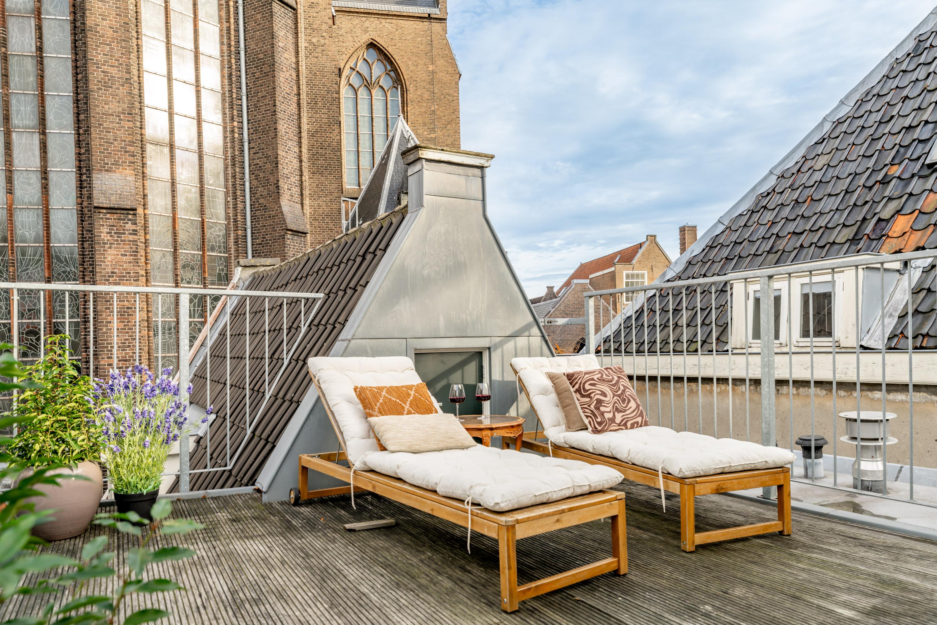 A spacious bedroom at the front, a characterful mezzanine as an additional room, and then the highlight: the roof terrace. Intimate, sheltered, and overlooking the historic rooftops and the church — a rare luxury in the city centre.