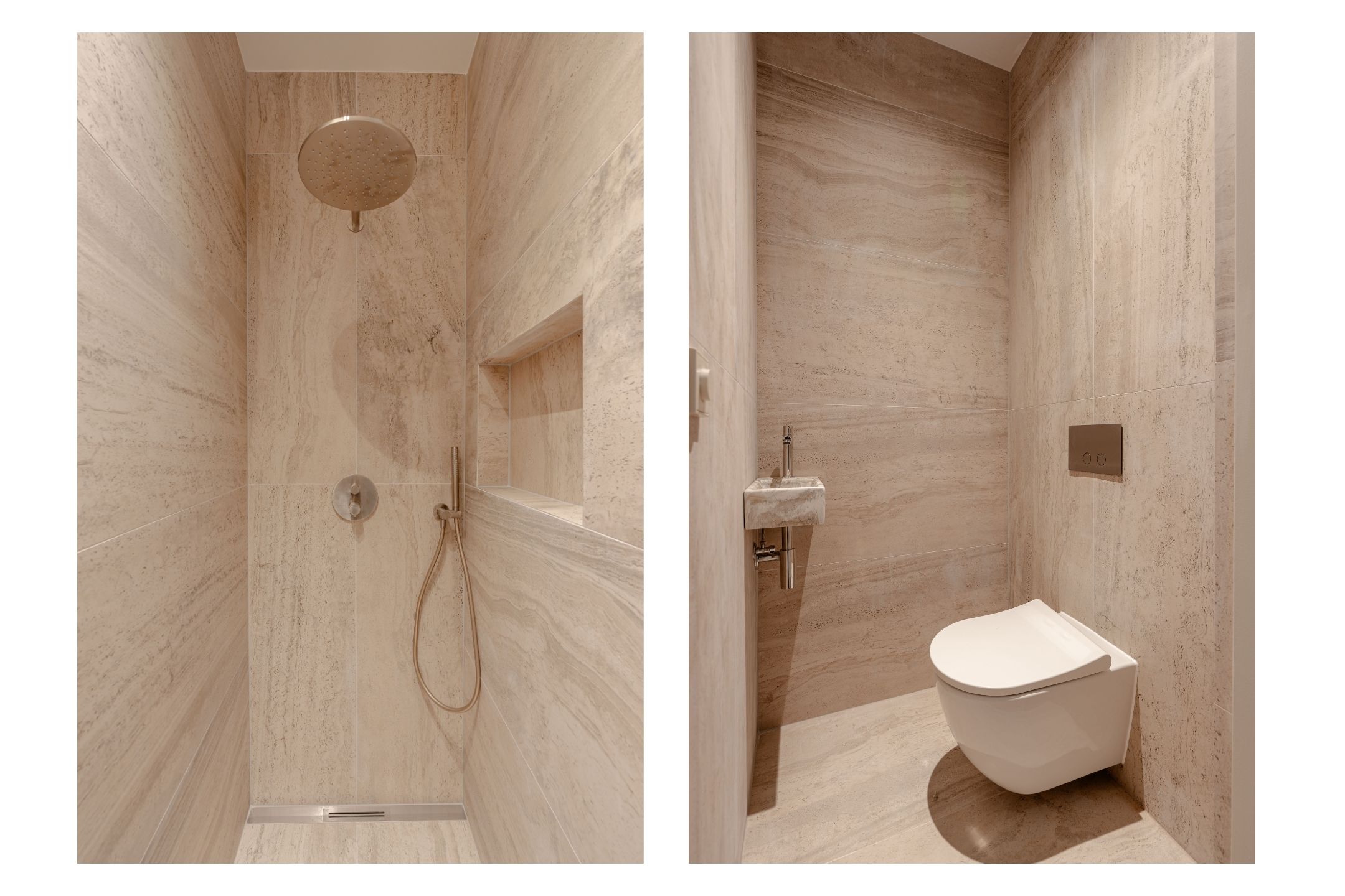 This luxurious apartment is located on the fourth floor and is characterised by a spacious and light-filled design, featuring high ceilings and striking, angled skylights at the rear. These large windows give the apartment a distinctive character and provide exceptional natural light throughout the day, along with open, green views across the city. The living room and kitchen are situated at the rear of the apartment and together form one generous living space. The unique roof structure, combined with the large skylights, creates an open and architecturally interesting atmosphere with abundant daylight and attractive sightlines. There is ample space for both a comfortable seating area and a large dining table. The luxurious kitchen is finished in a sleek and timeless design and integrates seamlessly with the living area. It is equipped with an induction hob, sink with Quooker, combi oven, climate cabinet, dishwasher, separate refrigerator and freezer, and offers generous workspace and storage capacity. At the front of the apartment are two well-proportioned and quietly located bedrooms. The master bedroom features an en-suite bathroom fitted with a walk-in shower and a double washbasin with vanity unit. Centrally located on the landing is the second bathroom, also equipped with a walk-in shower and a washbasin with vanity unit. In addition, there is a separate toilet and practical built-in storage. The roof terrace is accessible via an internal staircase. This spacious terrace offers a high level of privacy and has been structurally prepared for the installation of a jacuzzi, including a double electrical group. Provisions have also been made for an outdoor shower (water connection) and for the installation of an outdoor kitchen (water and electricity connections), making this outdoor space a valuable extension of the living comfort.