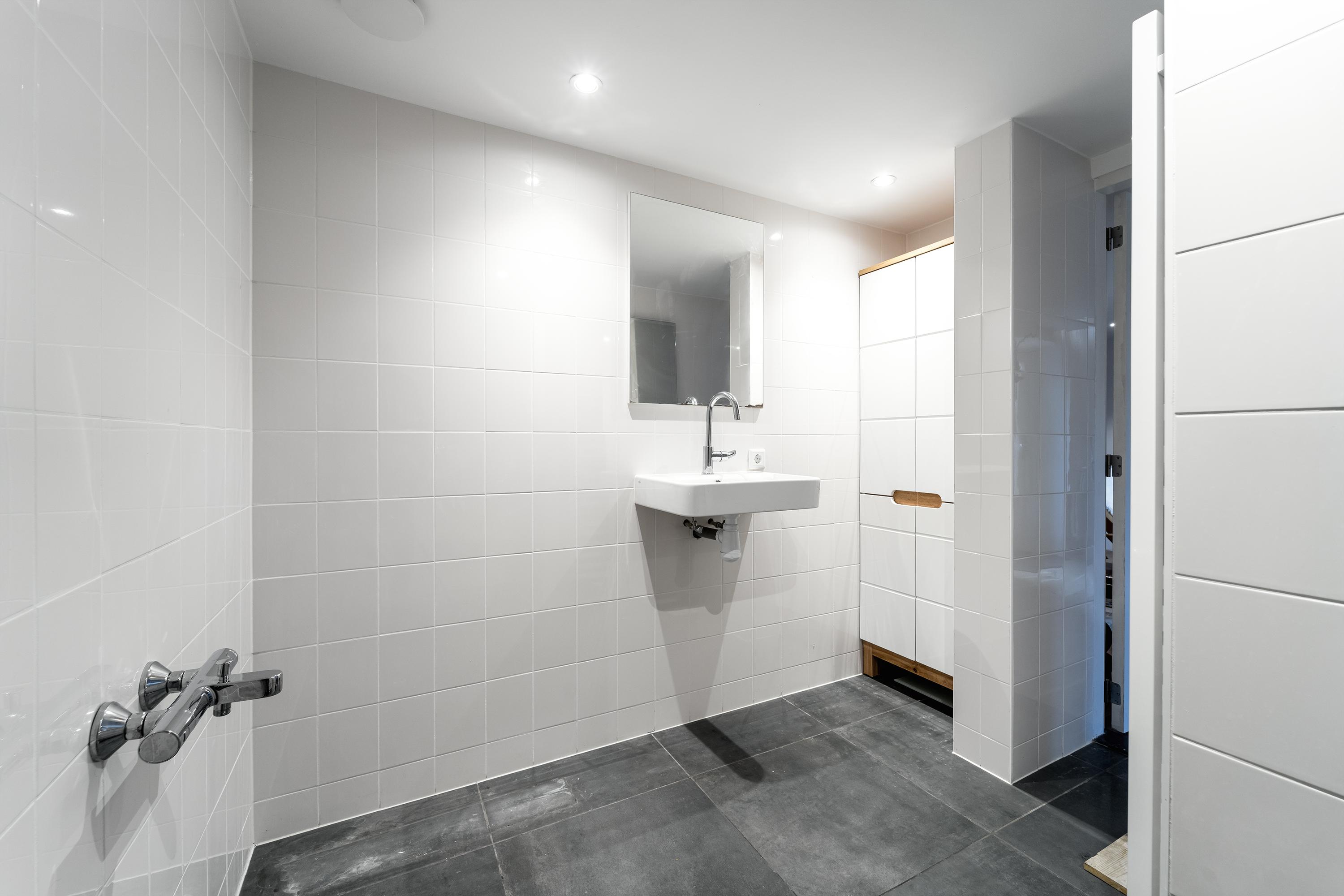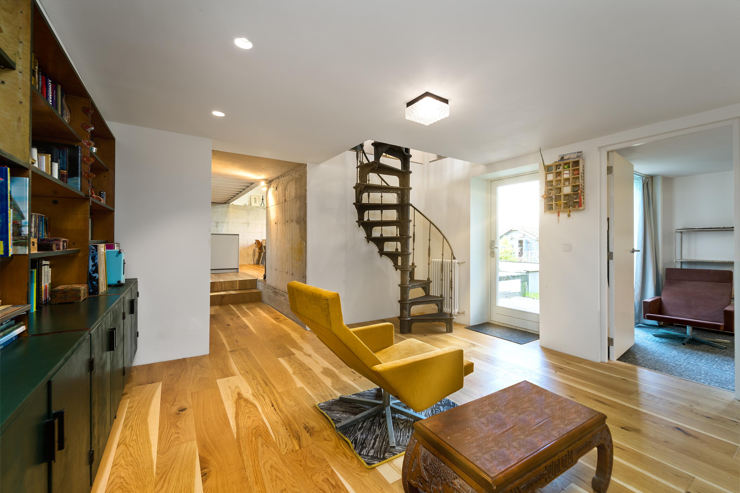 The interior is just as impressive. The new-build and renovation combine old and modern materials in an exciting and harmonious way. Think robust wooden structural beams, raw concrete, oak flooring, classic column radiators, and a striking steel spiral staircase. The finish is of high quality and executed with great attention to detail.