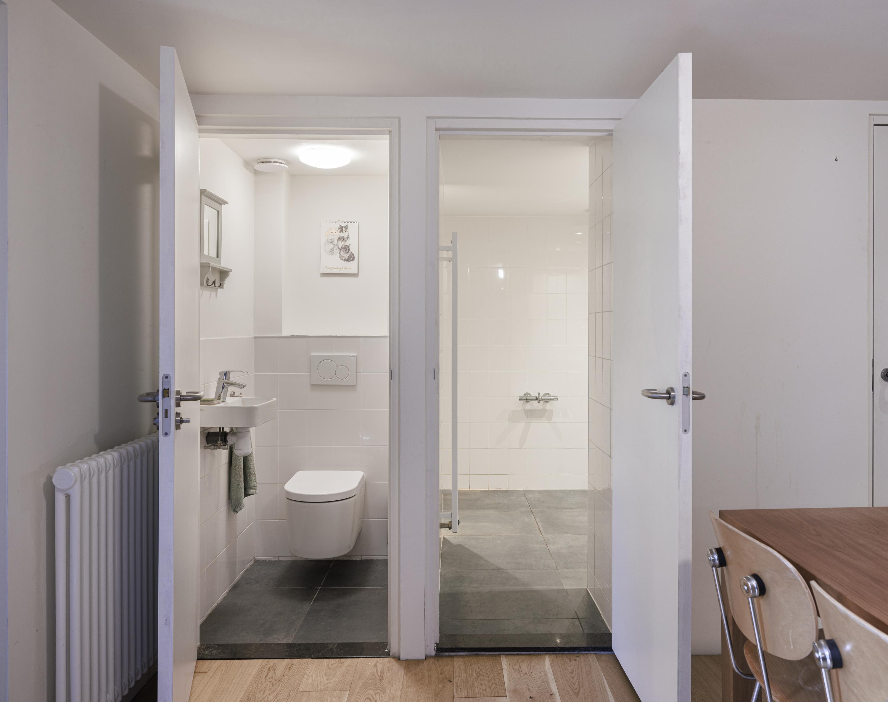 Brick dike house: entrance, hallway, toilet, staircase with storage cupboard to the first floor, spiral staircase to the garden level, two bedrooms, and second bathroom (walk-in shower and washbasin).