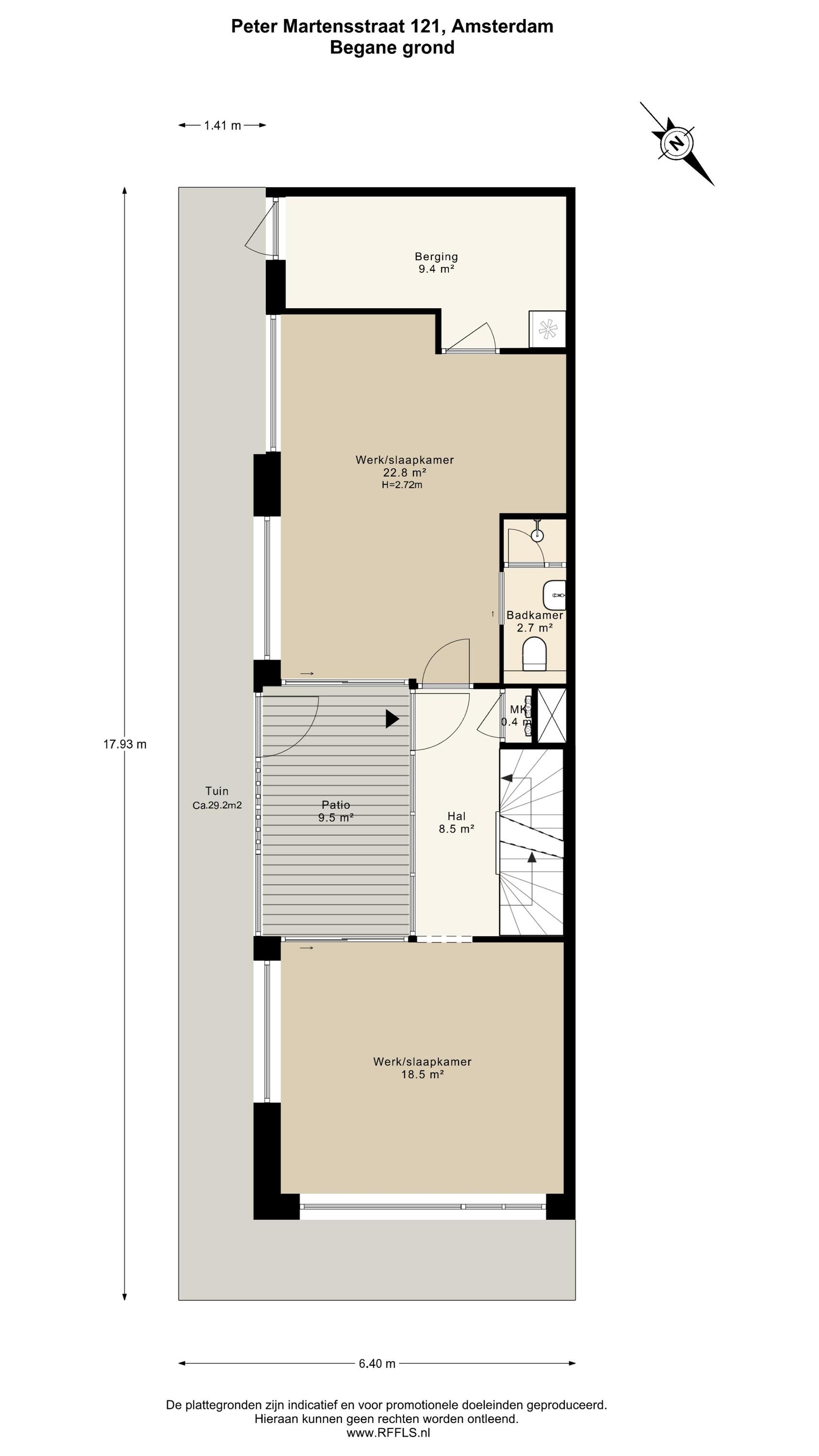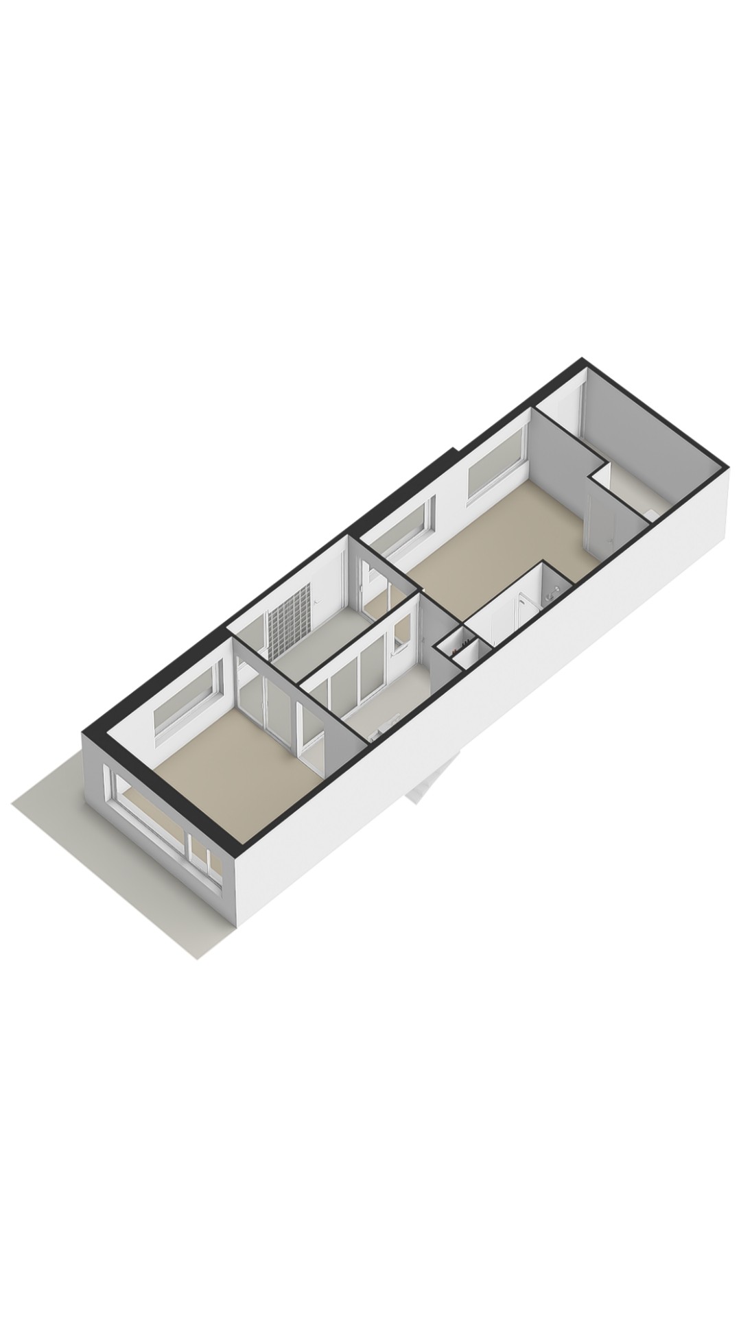 To the left of the hallway is a spacious office/bedroom of over 22 m² with its own shower and toilet. This room is also accessible via the second entrance, which leads to a large and bright storage room – ideal for storage or bicycles.