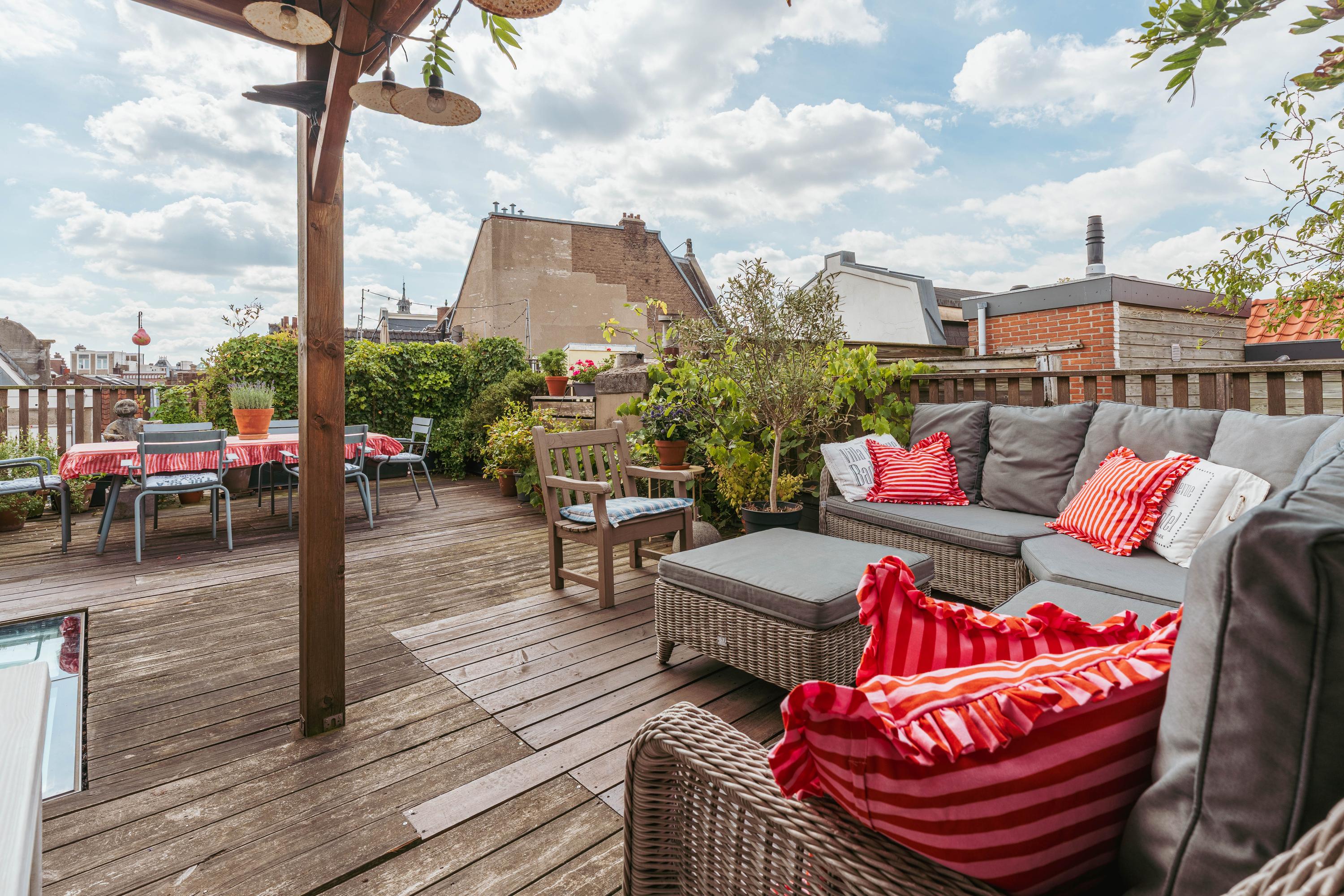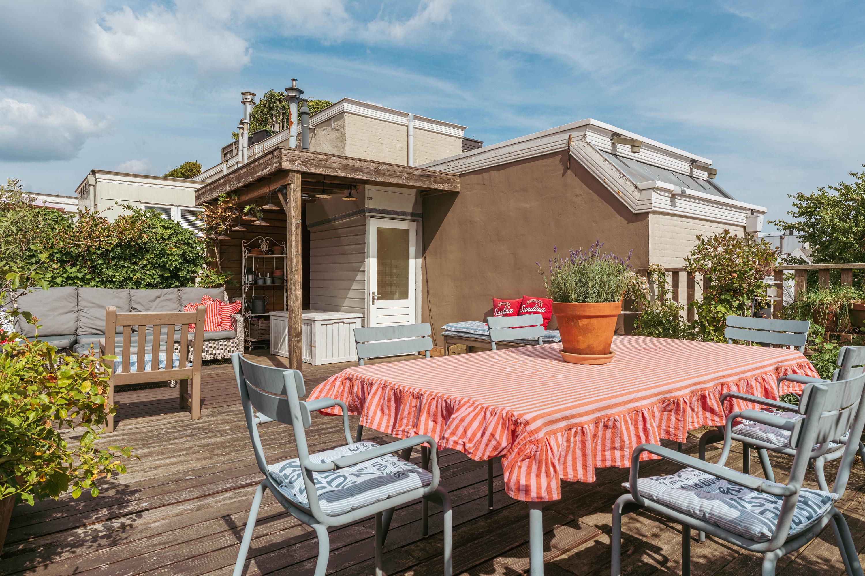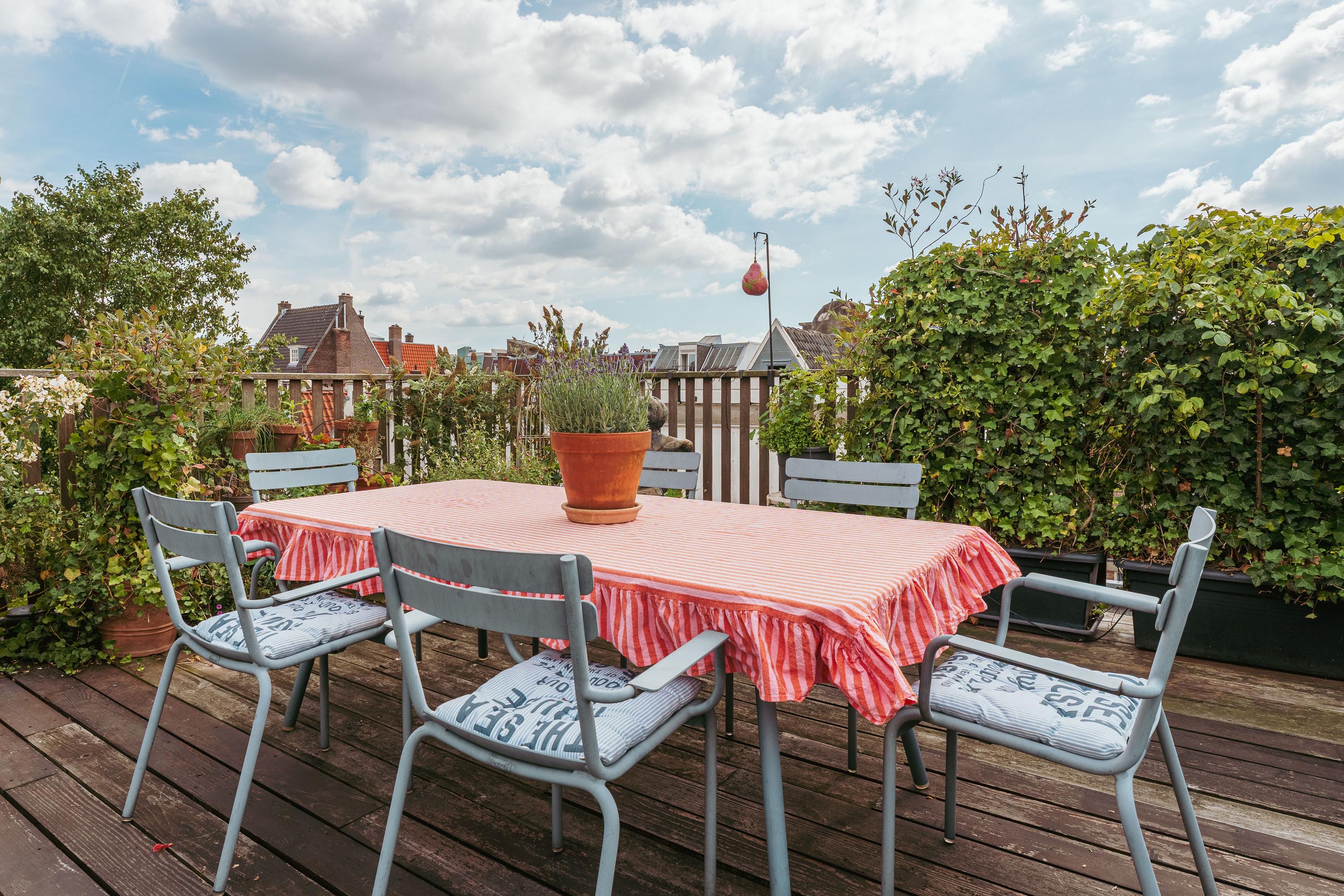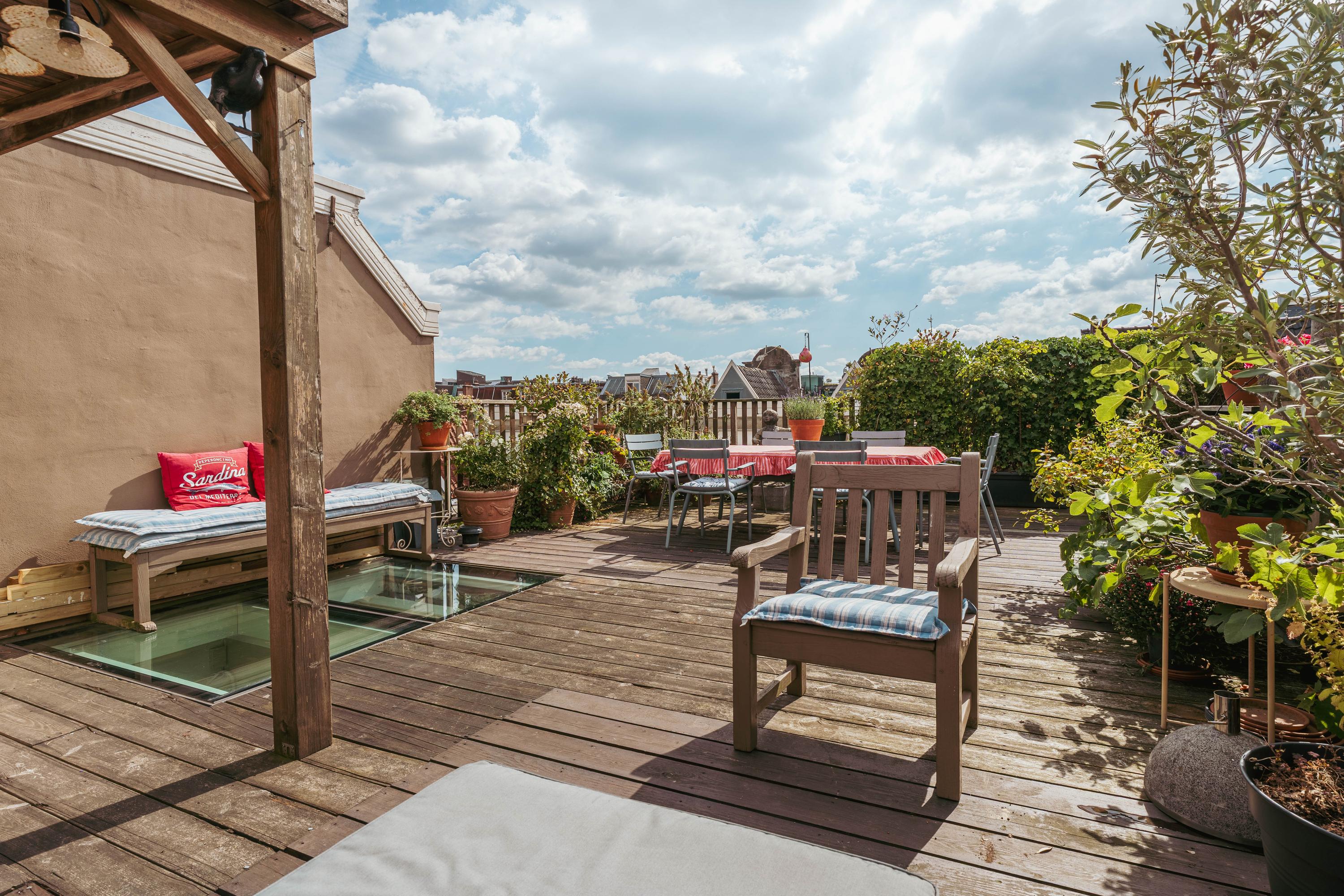 The generous size allows for multiple seating and dining areas, making it ideal for relaxing or entertaining guests. A covered section ensures you can enjoy the outdoors comfortably even on less sunny days. From here you have stunning views over the historic rooftops of central Amsterdam.