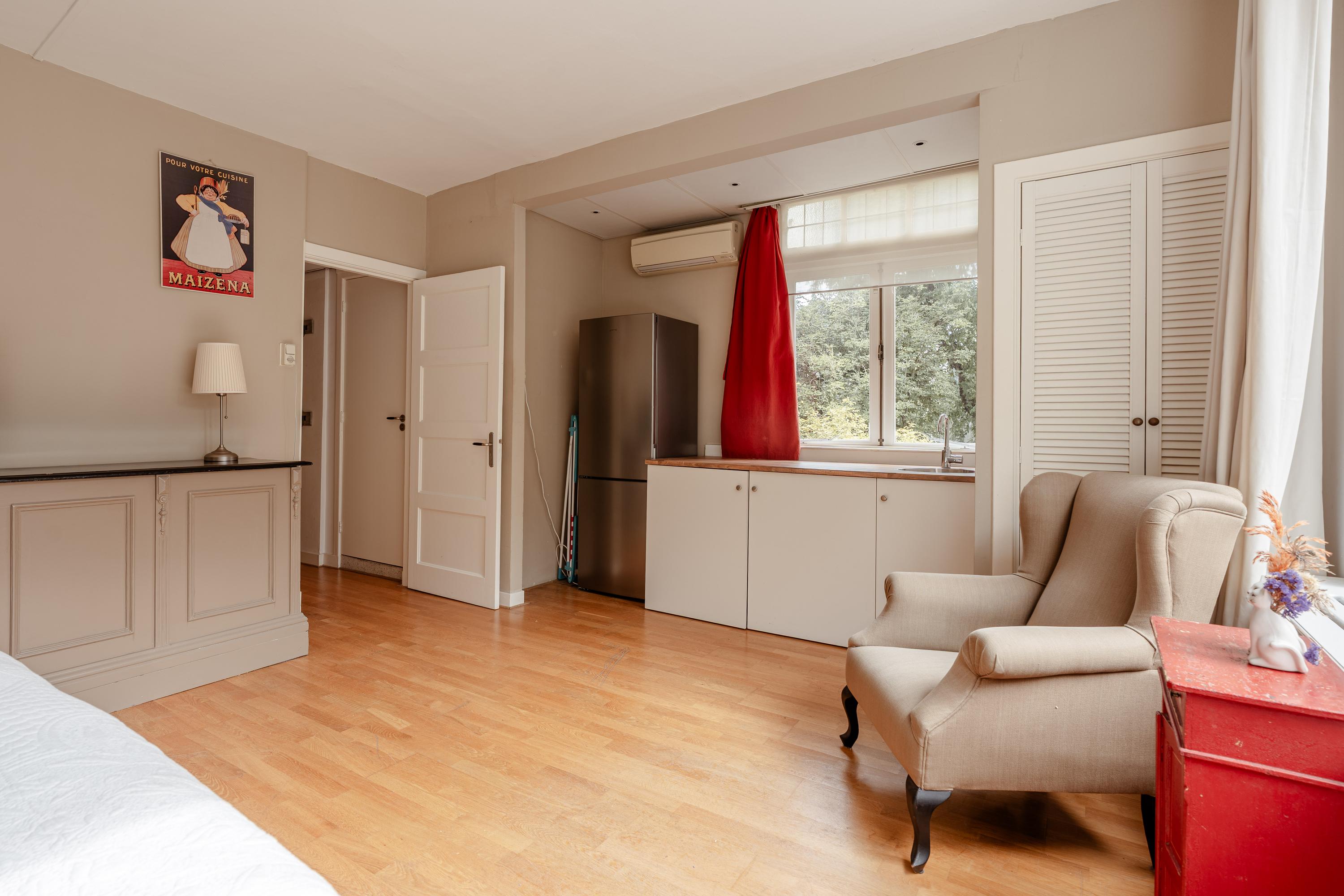 At the rear, there is another large bedroom with built-in closets and its own kitchenette, including connections for a washing machine and dryer. Thanks to the wide windows, this is a bright and self-contained space, perfectly suited as a studio or office.