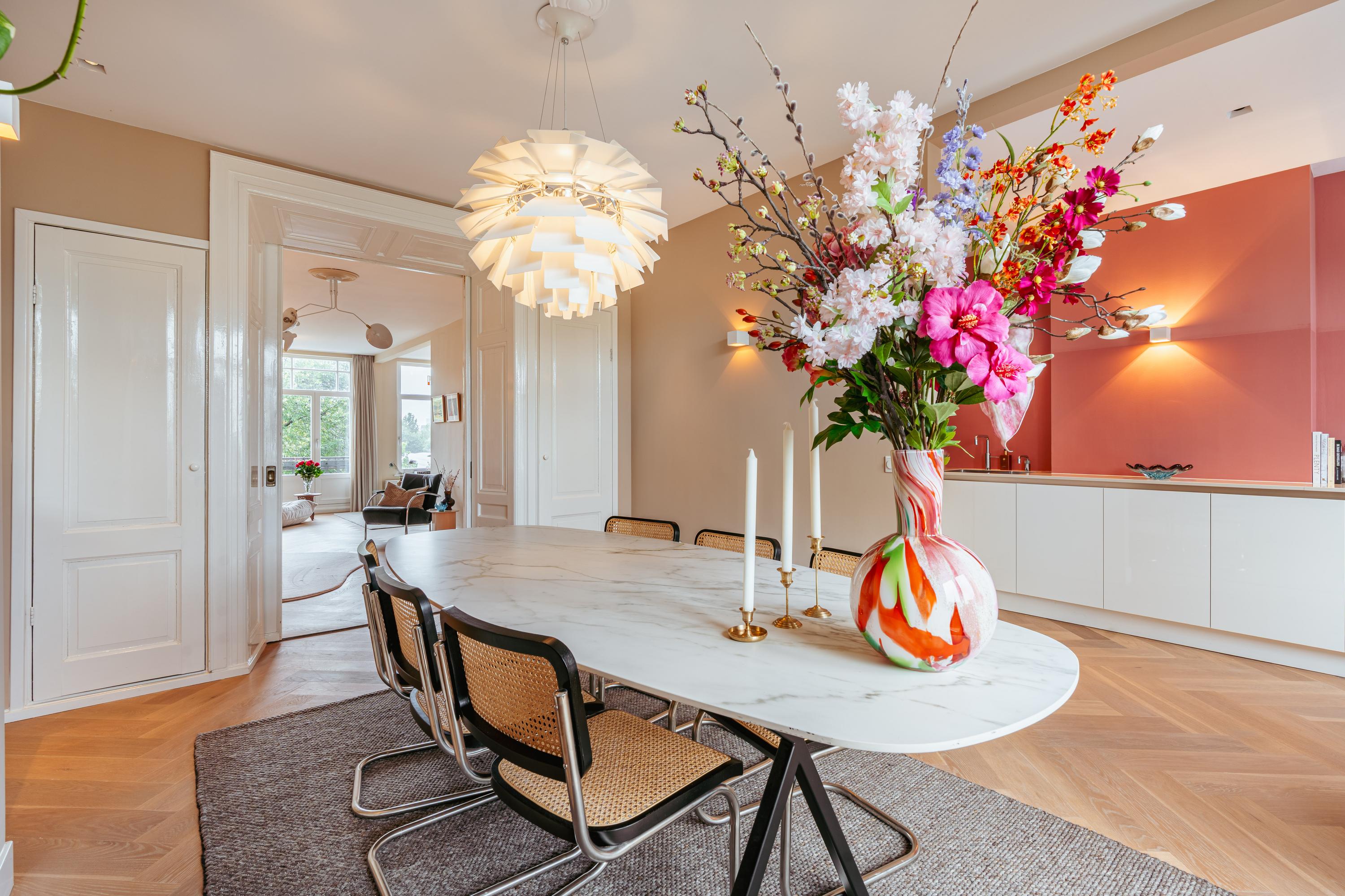 Original wooden en-suite doors connect the living room to the dining area at the rear, where another balcony lets you enjoy the morning sun as early as 7:30 a.m. The adjoining modern kitchen features a fresh design with white cabinets and a large worktop. Fully equipped with high-end appliances including a Quooker, combi-oven, dishwasher, five-burner gas hob, fridge-freezer, and double sink, it is an ideal space for cooking enthusiasts and those who love to host.