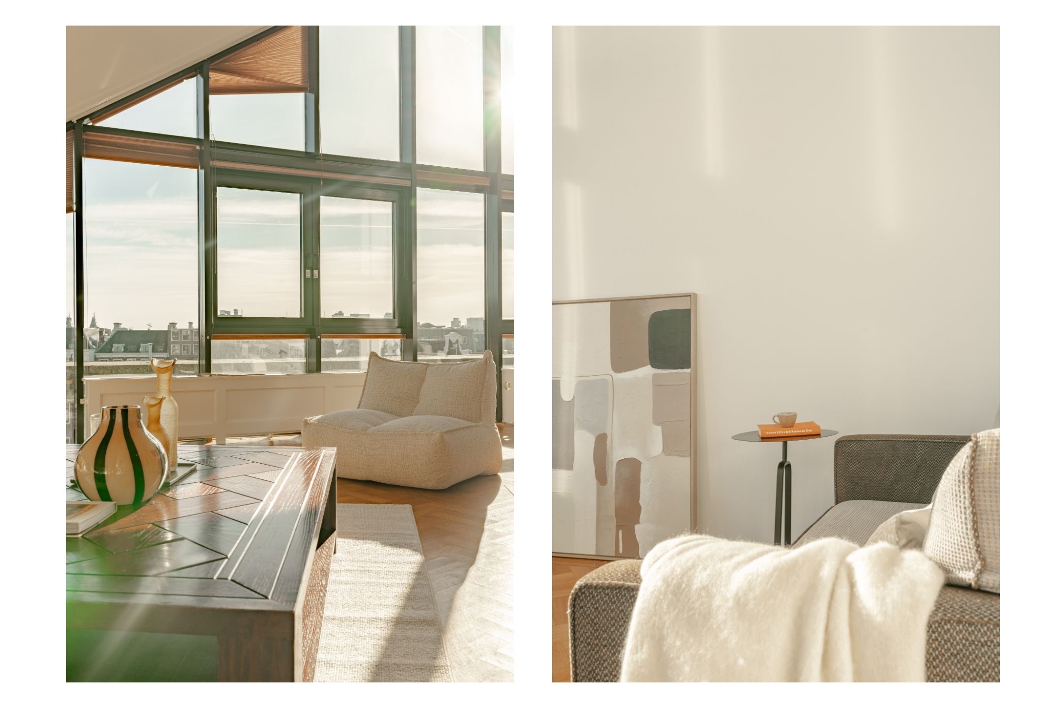 The apartment’s living level occupies the top floor, where large windows and generous ceiling heights invite daylight to animate the interiors. The living room opens to far-reaching views across the Singel and the city’s celebrated Flower Market, setting an atmosphere of refined urban calm. A half-open kitchen, complete with built-in appliances and an adjacent storage area, seamlessly connects to the dining space, ideal for gathering and entertaining.