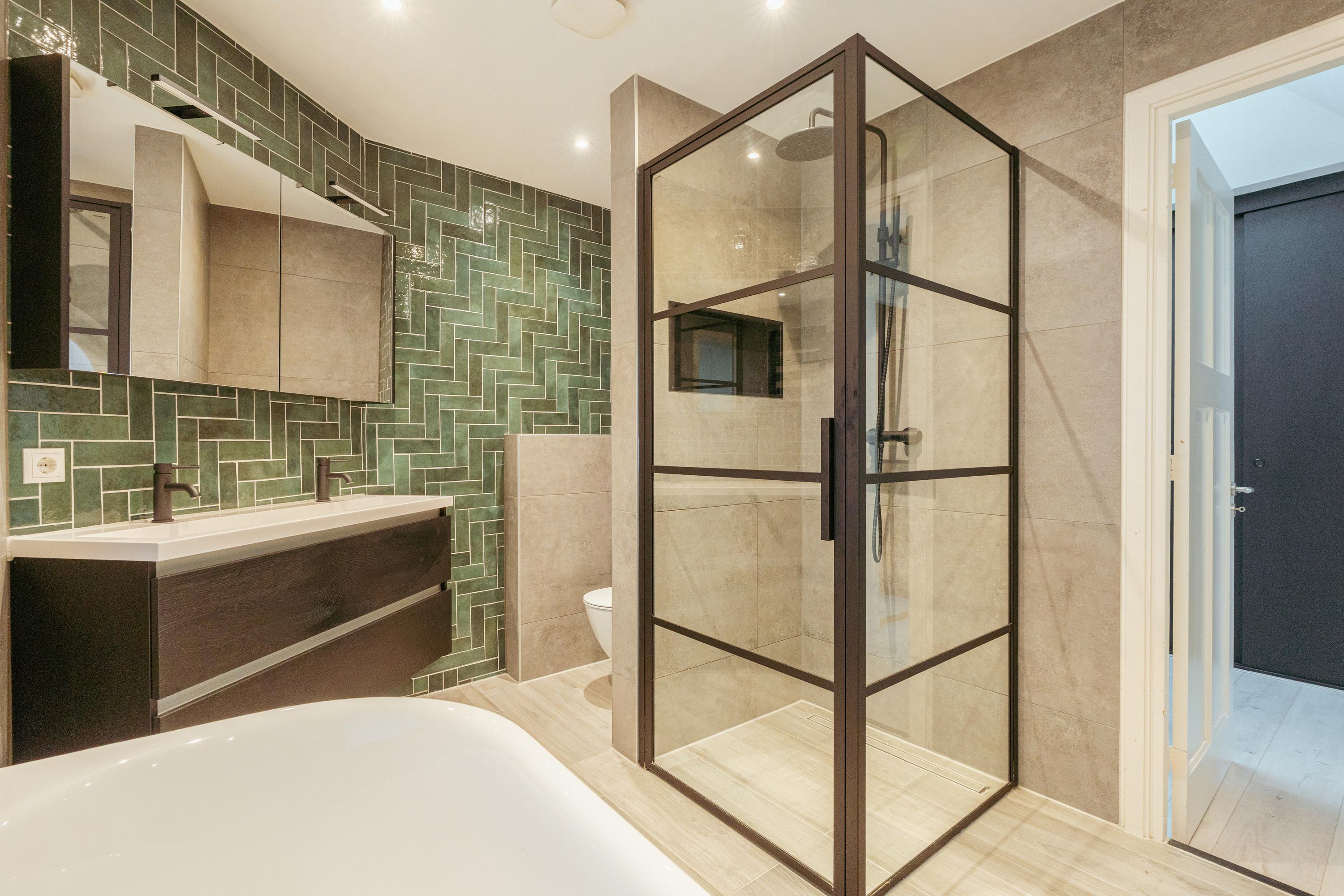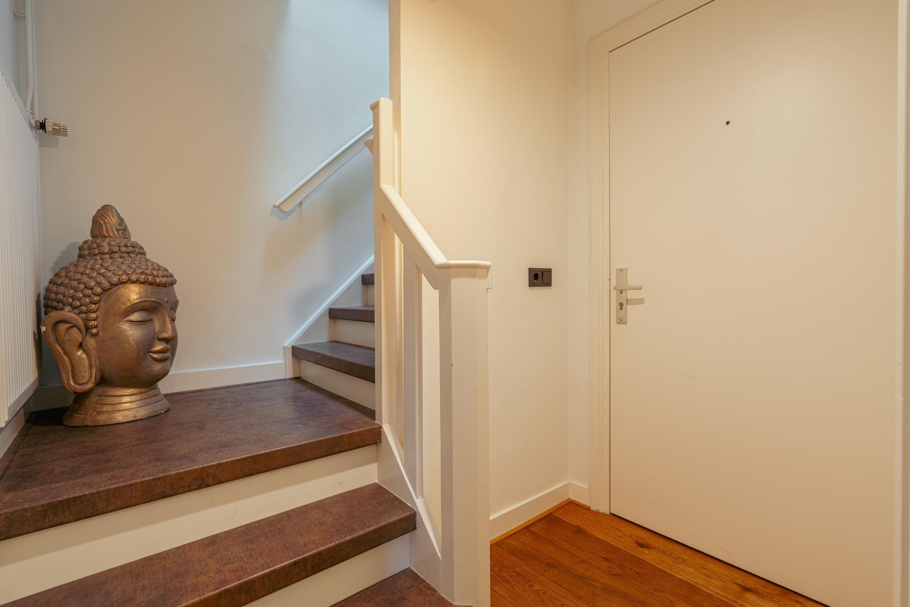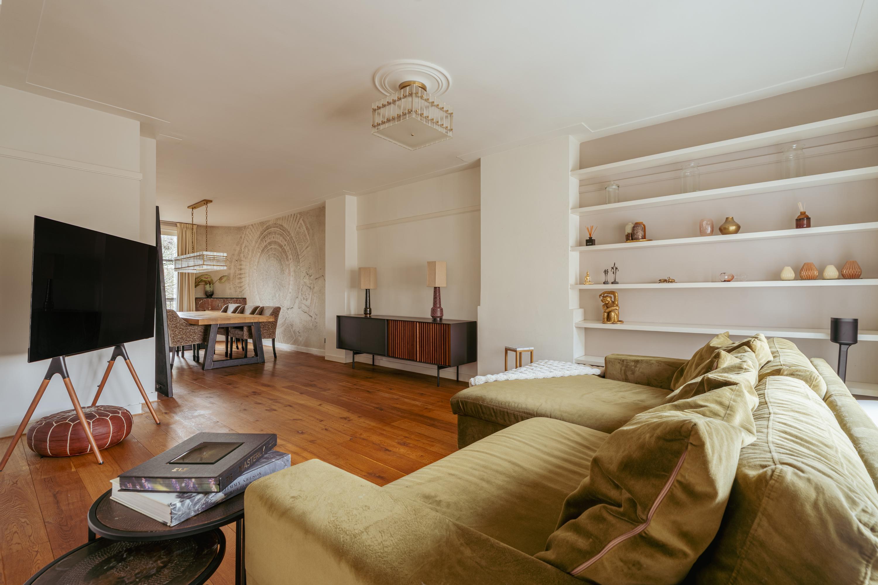 The spacious living area forms the heart of the apartment: an impressive L-shaped living room extending from the front to the rear of the property. Large windows at the front provide beautiful natural light. French doors open onto a charming balcony with open views over the lively Stadionplein. The generous layout offers various possibilities for furnishing and arrangement.