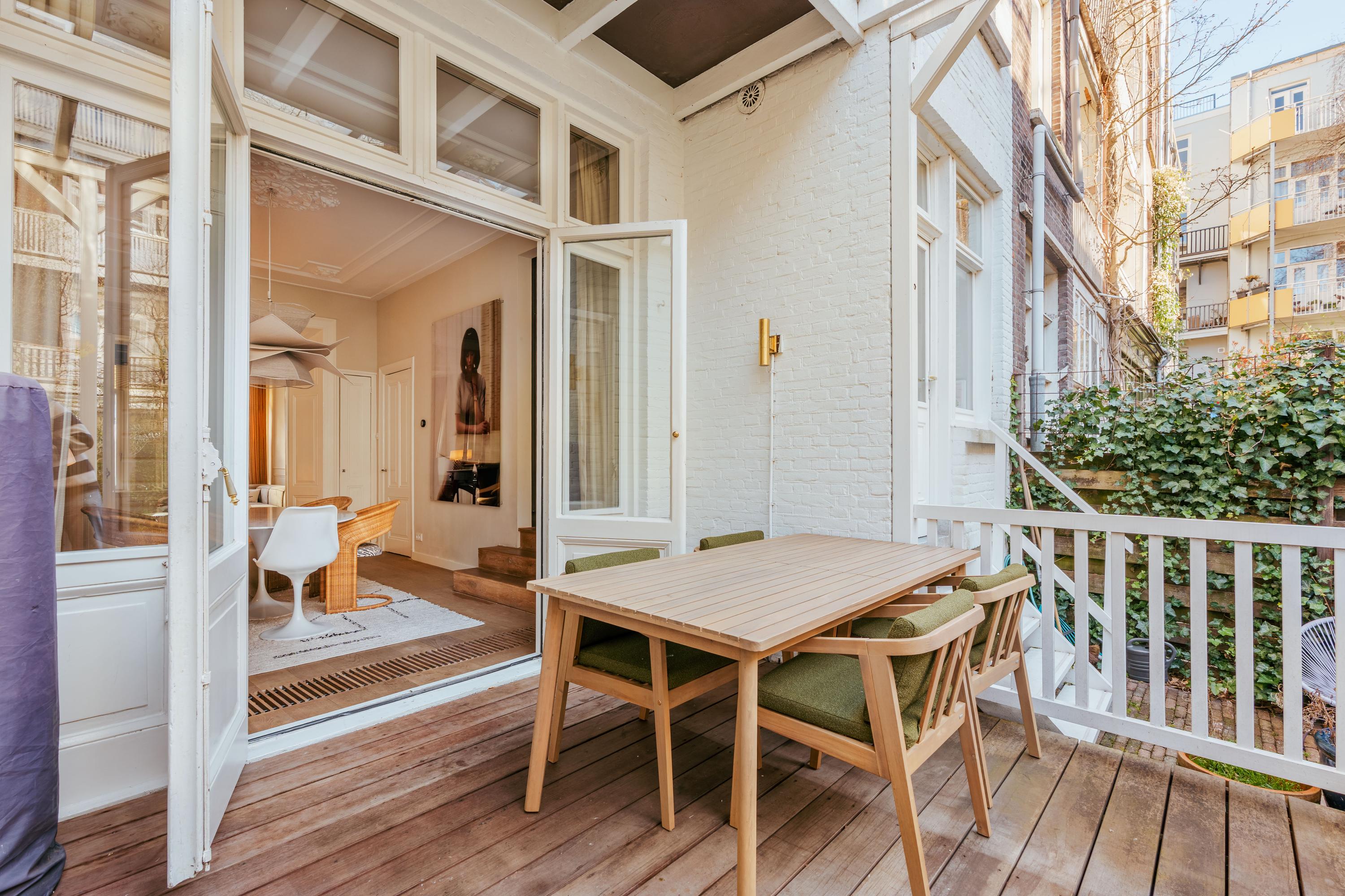 A charming double ground-floor apartment of 124 m² with a spacious garden and distinctive character details. This beautiful home combines authentic charm with modern living comfort. Think of stained glass windows, ornate ceiling decorations, fireplaces, and paneling, perfectly balanced with a contemporary finish. With a generous and bright en-suite living area, open kitchen, four bedrooms, two balconies, and an exceptionally large sunny backyard with a covered terrace, this property offers everything for comfortable and atmospheric living. Situated on freehold land and featuring a practical layout, this is a unique and complete family home.