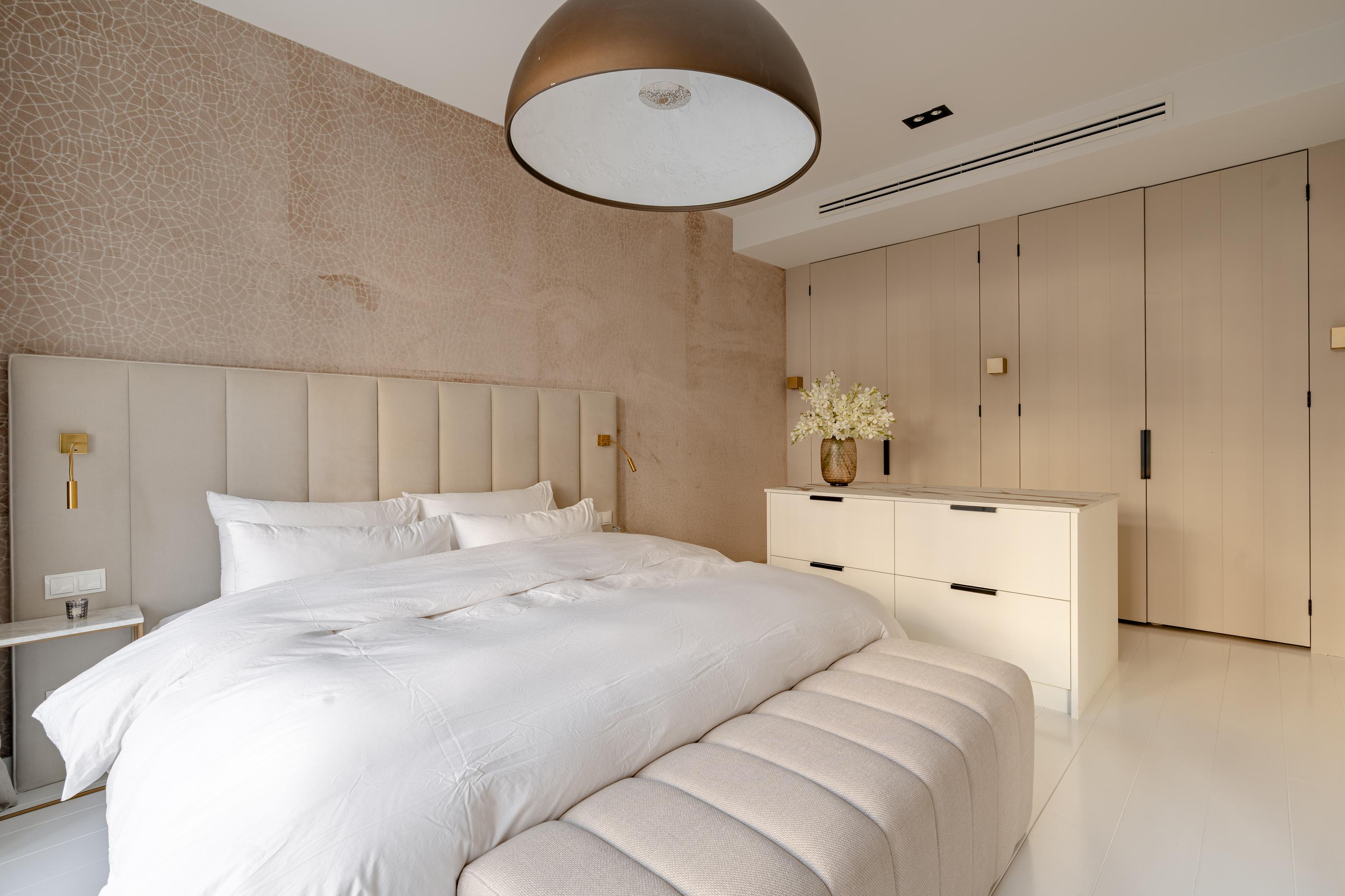 A staircase leads to the first floor. The central landing gives access to two bedrooms and the luxurious bathroom. At the front is a bedroom fitted with neat built-in wardrobes and a charming bay window, complete with custom-made cushions to create a cosy seating nook. At the rear is the master bedroom, also featuring built-in wardrobes and air conditioning, with direct access to a balcony overlooking the green inner gardens. The bathroom on this floor is fully finished in the same style as the other sanitary spaces and includes a double shower, double washbasin with cabinet, bathtub and toilet.