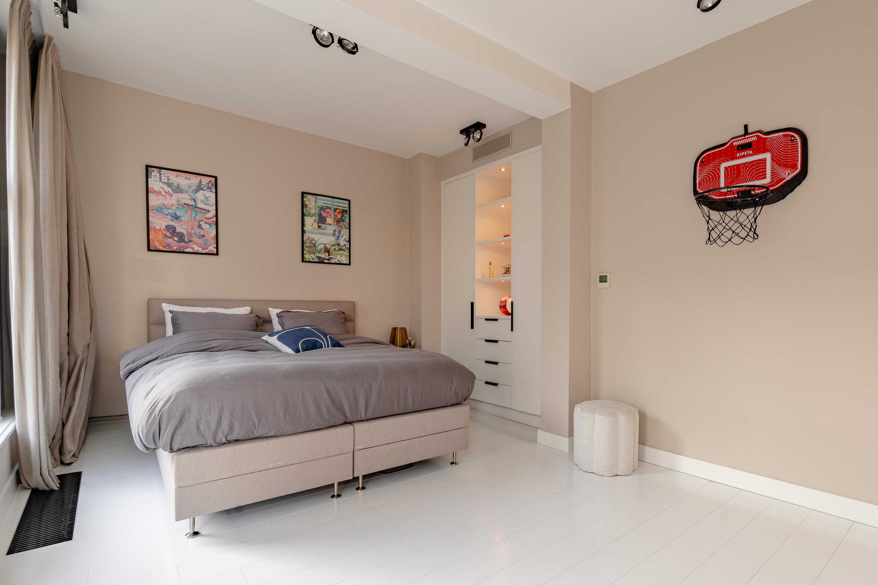 Through the private entrance, you enter the vestibule and hallway, which provides access to the rooms on the ground floor. Here you will find a separate toilet with a washbasin and a practical storage cupboard with access to the basement, consisting of two well-usable spaces—ideal for storage, a hobby room or a wine cellar. The generous living room extends across the full length of the property and is accessed through an elegant steel-look door. Thanks to the high ceilings and large windows, the living area is wonderfully bright, offering a comfortable seating area with a gas fireplace at the front and ample space for a large dining table at the rear.
