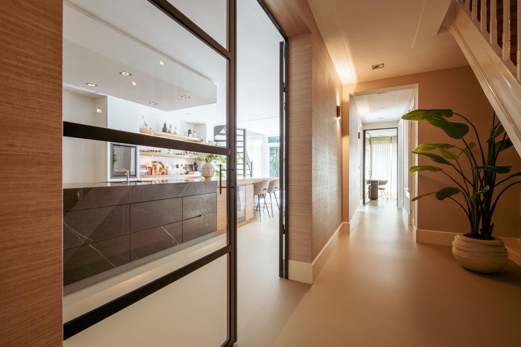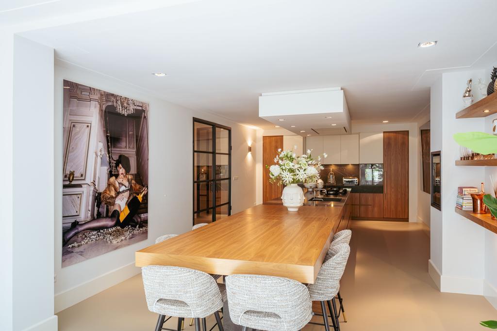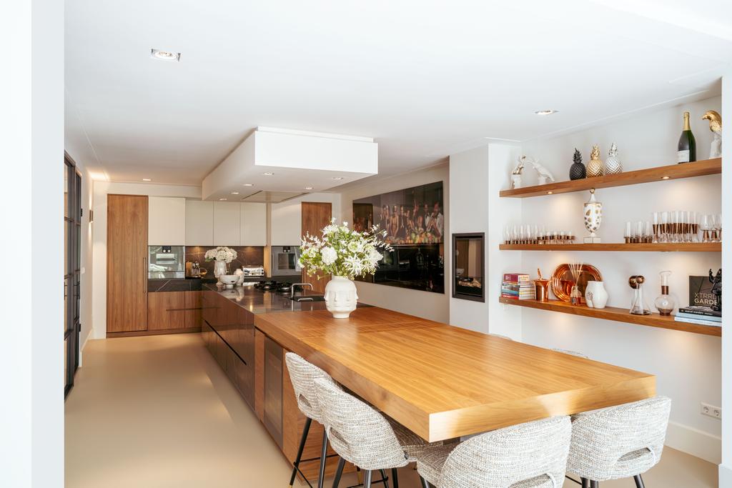 To the front is a bedroom with an en-suite bathroom featuring a washbasin and walk-in shower—currently used as a home gym, but easily repurposed. At the rear is the stunning open-plan kitchen, the centerpiece of this level. Outfitted with Gaggenau appliances, including a fridge, freezer, Quooker, five-burner gas stove integrated into the counter, oven, steam oven, dishwasher, and wine fridge, the kitchen combines luxury and functionality. A solid natural stone countertop with a wooden breakfast bar provides a warm, refined look.
